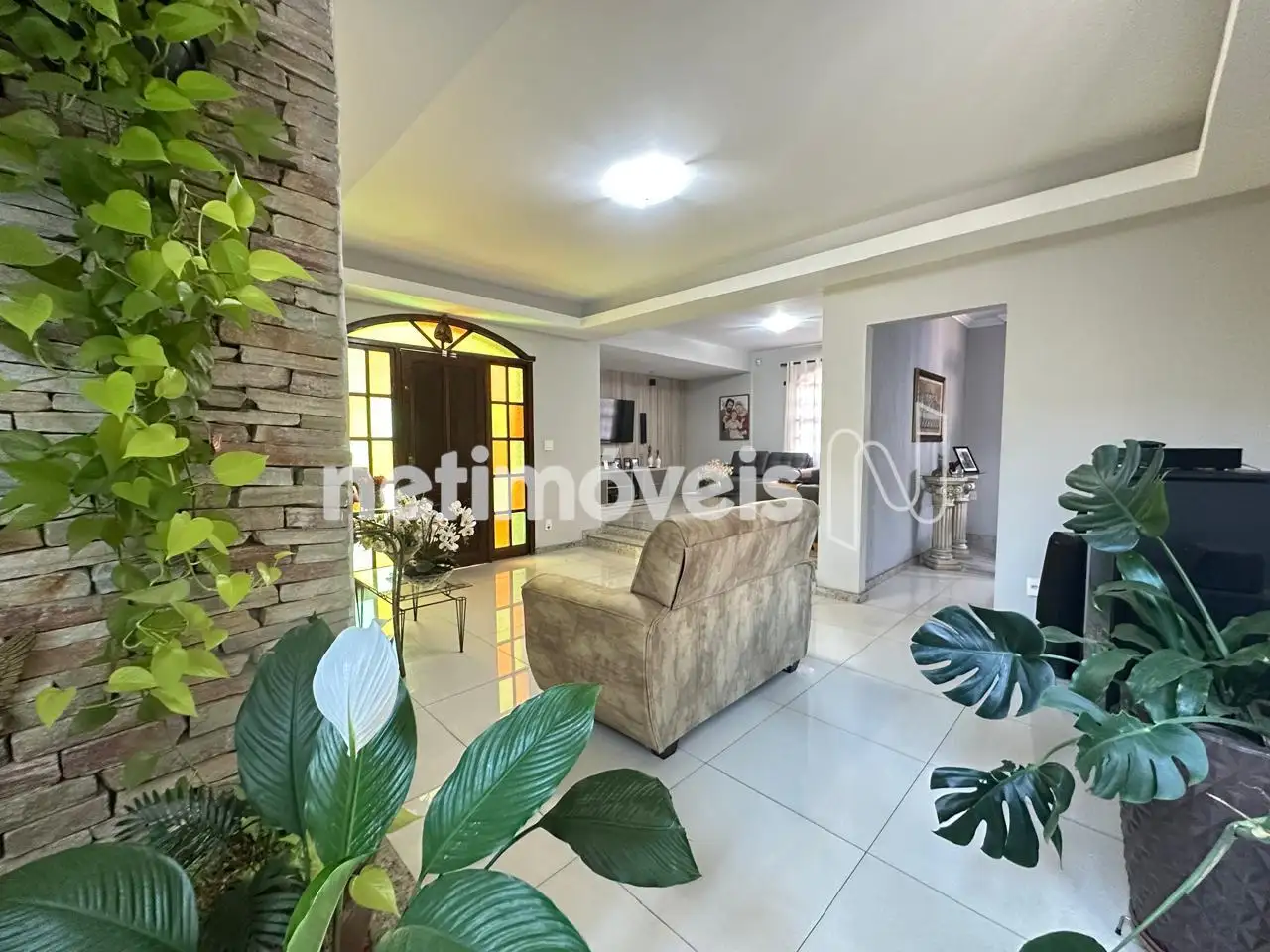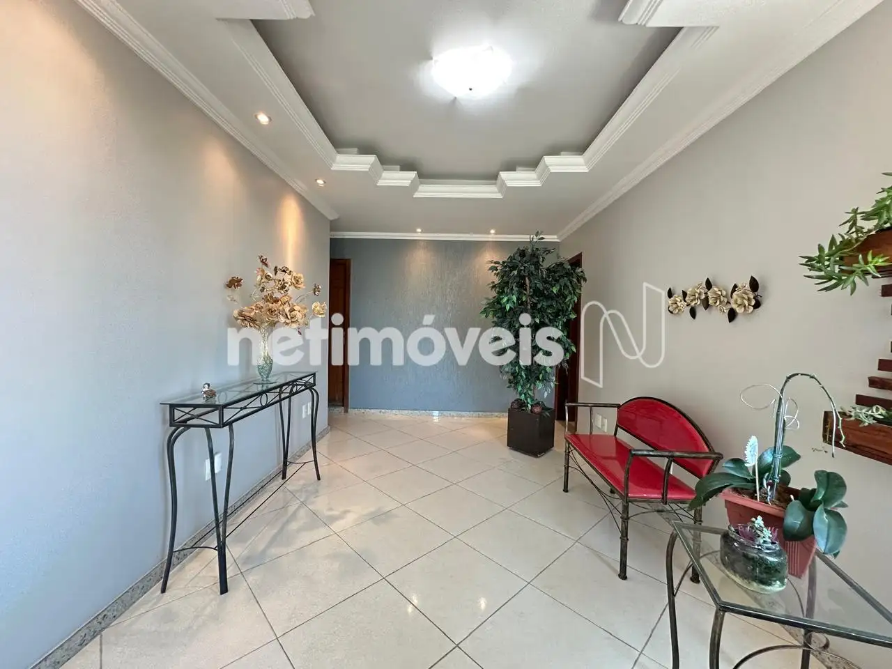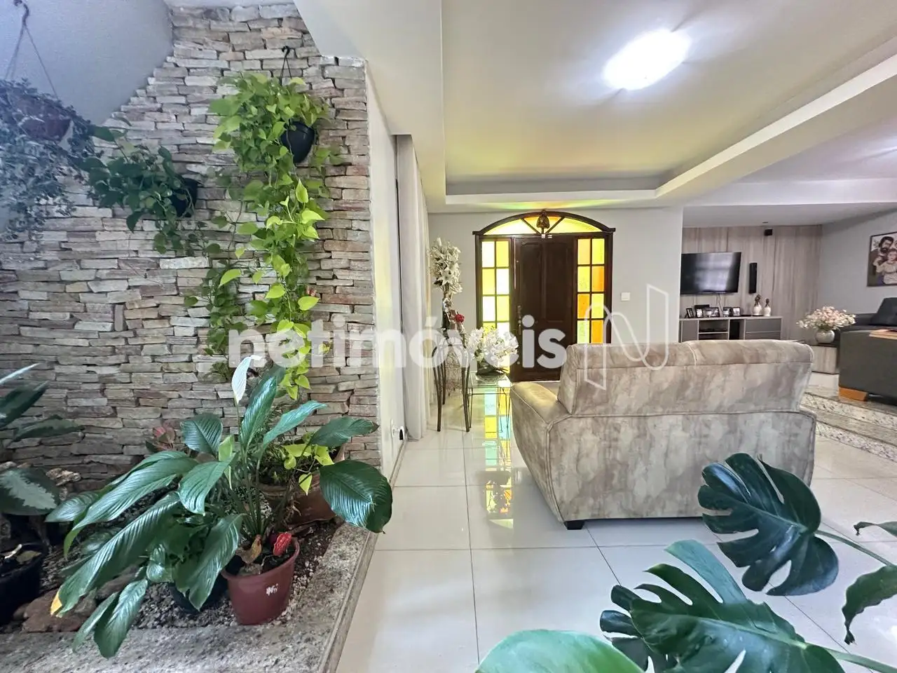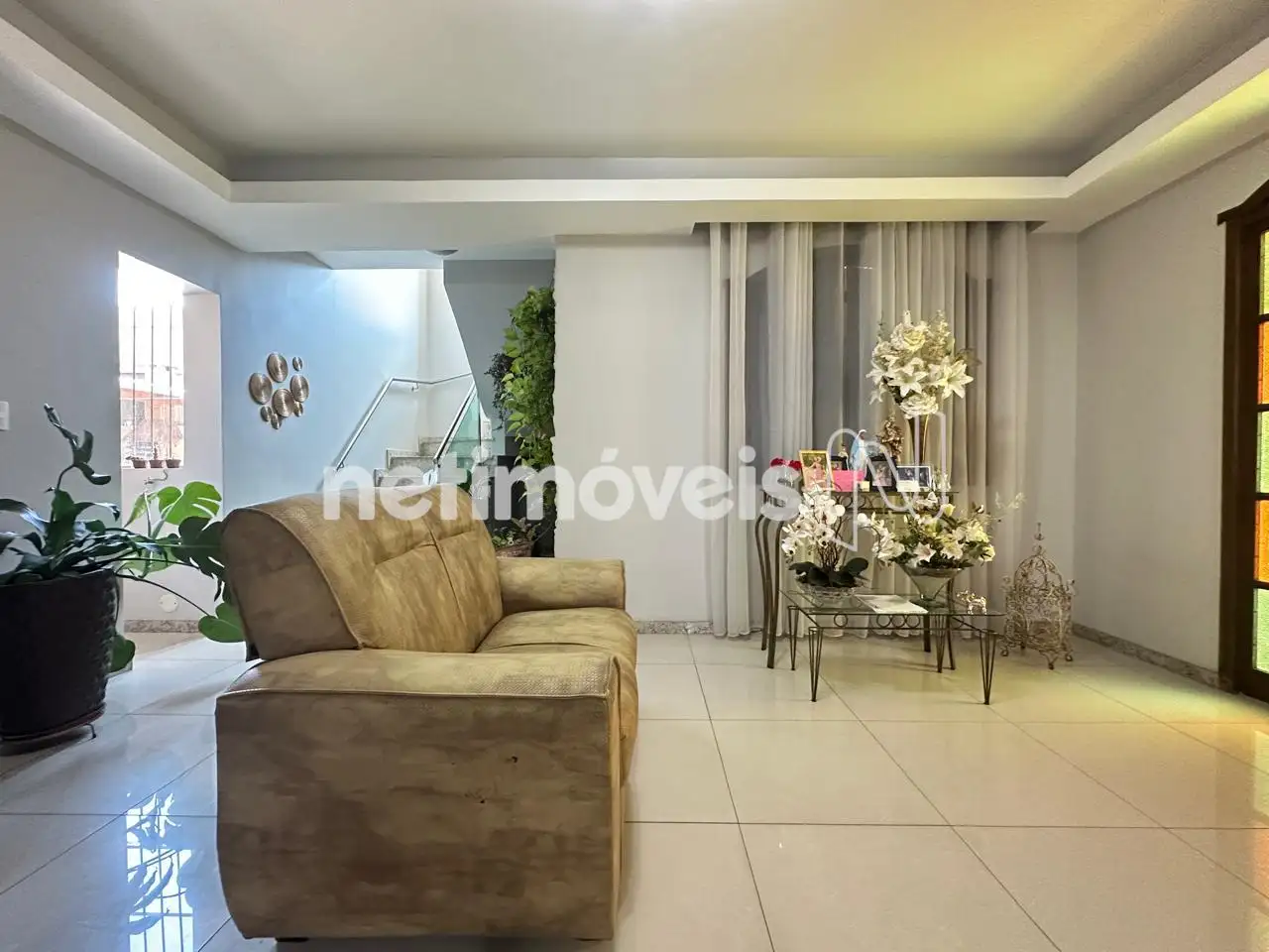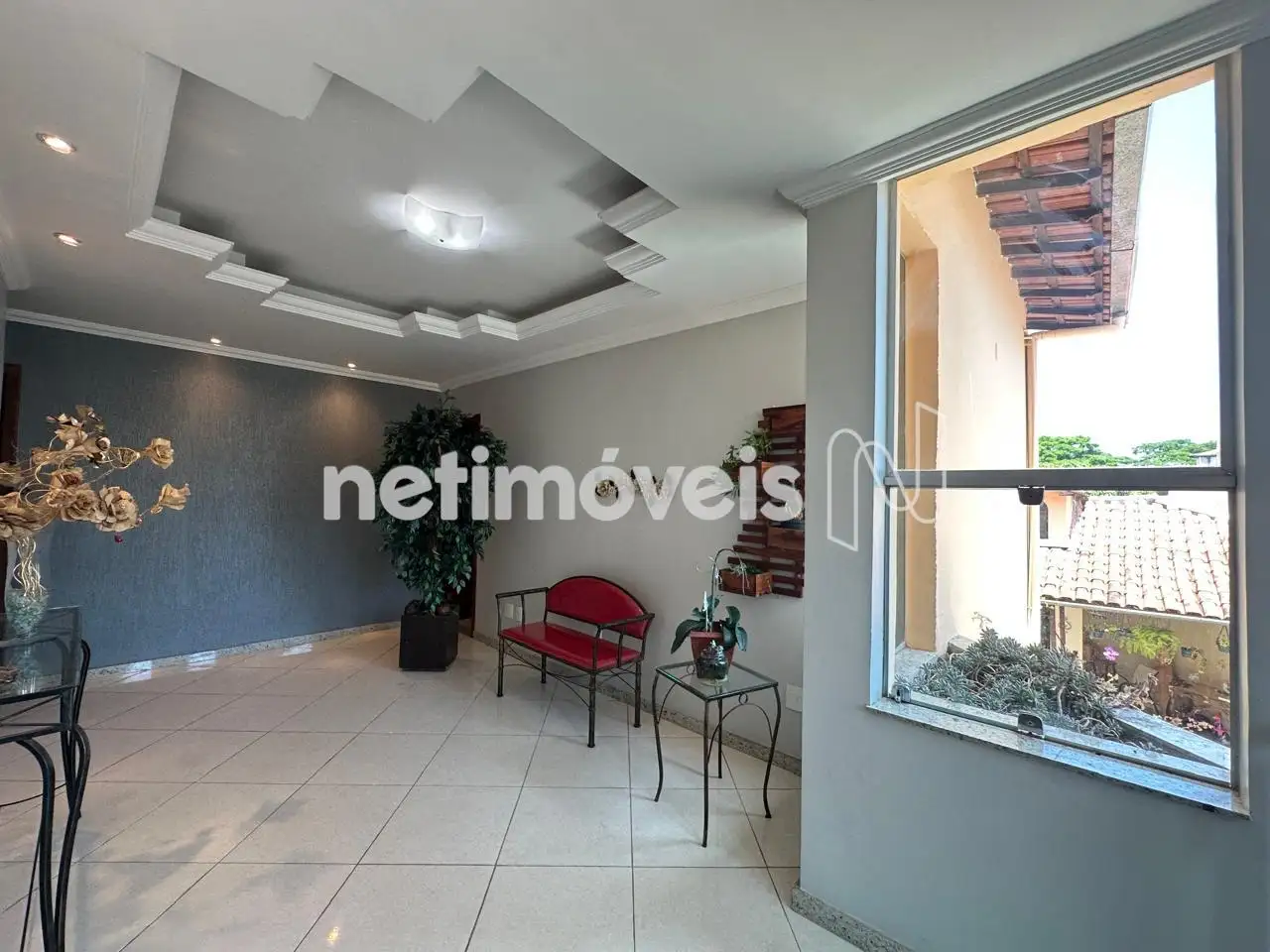 Sala de estar com rebaixamento em gesso no teto + jardim de inverno;