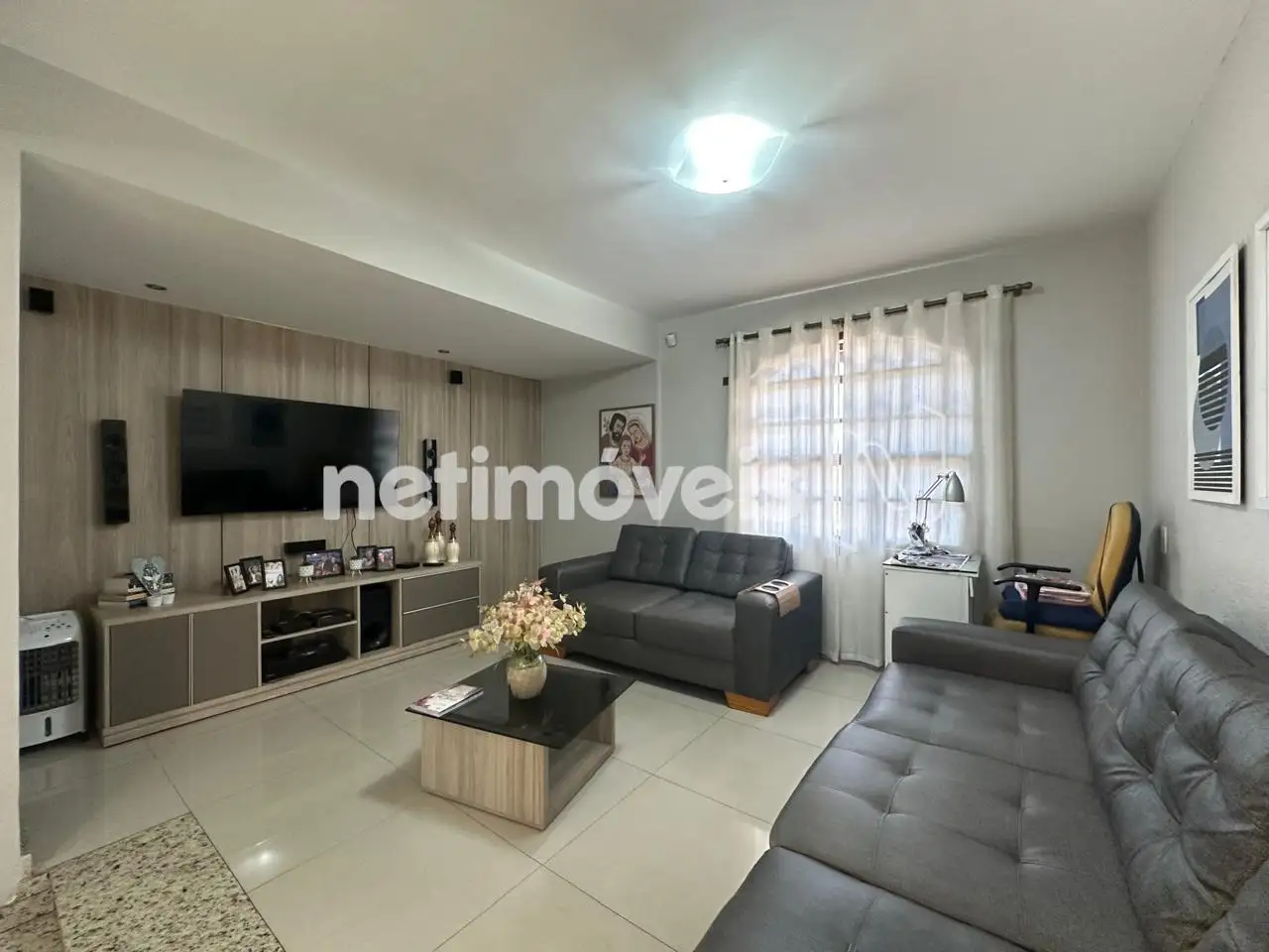 Sala de TV com rebaixamento de gesso no teto, painel + escritório anexo;