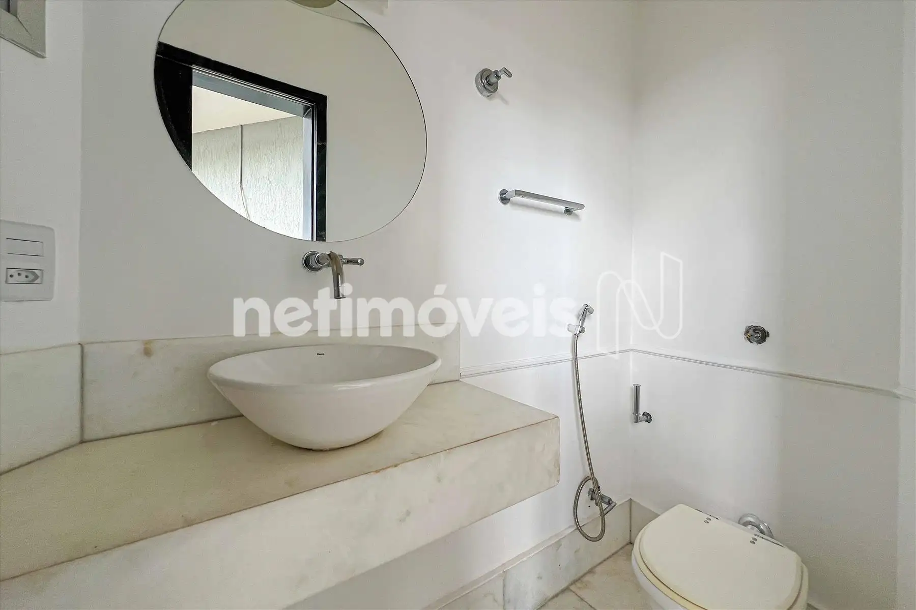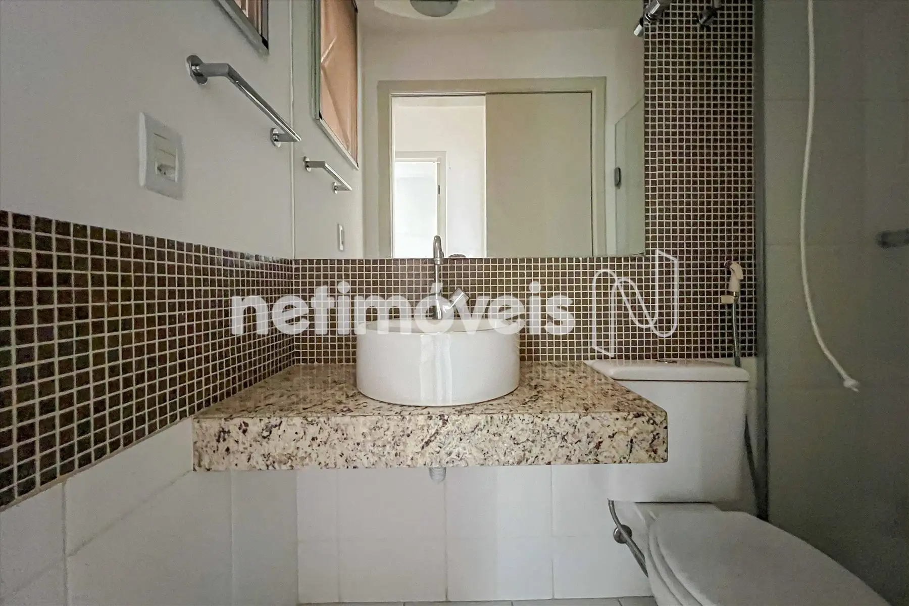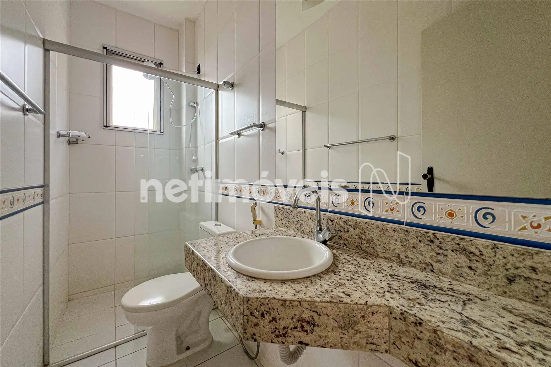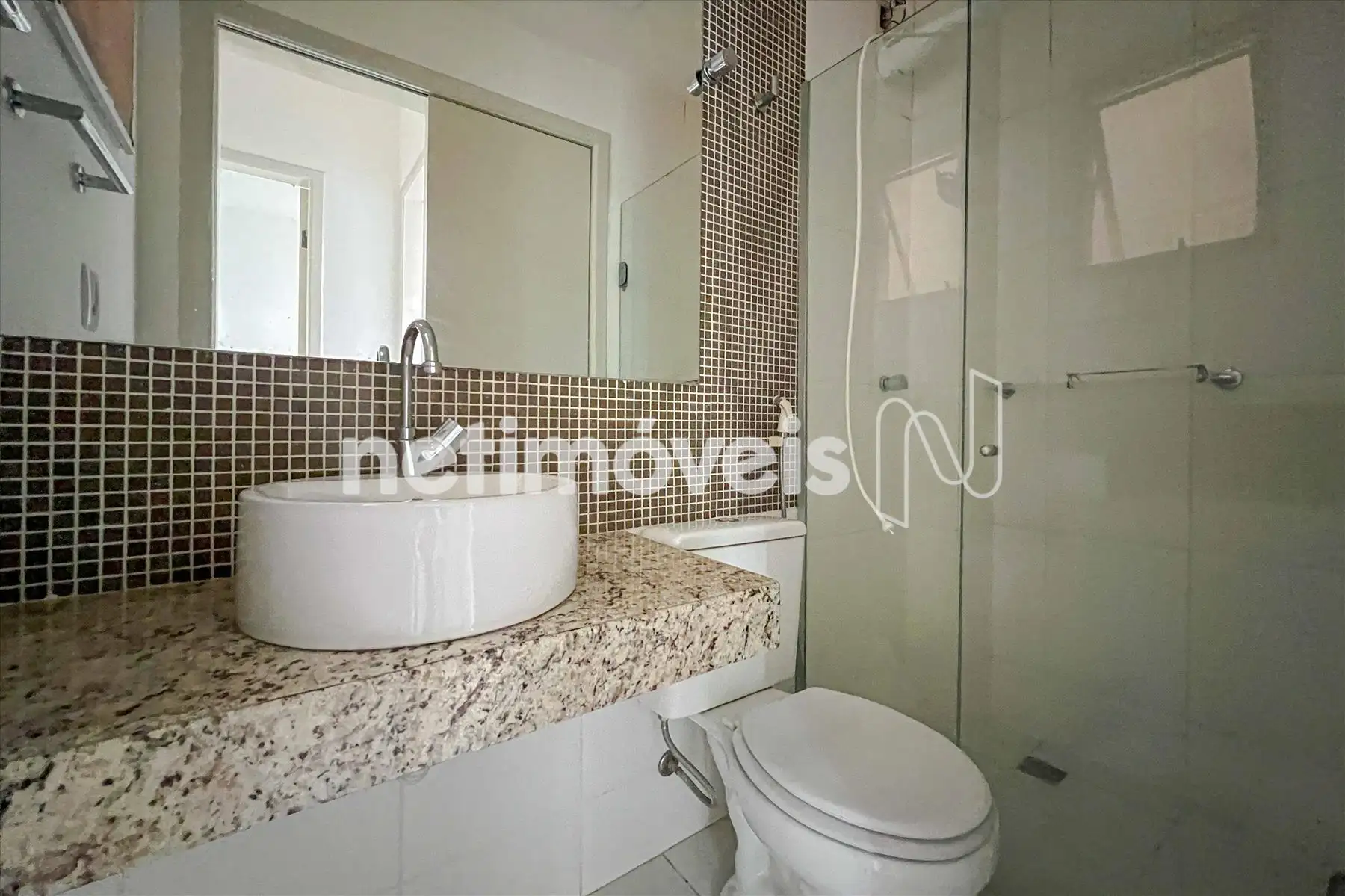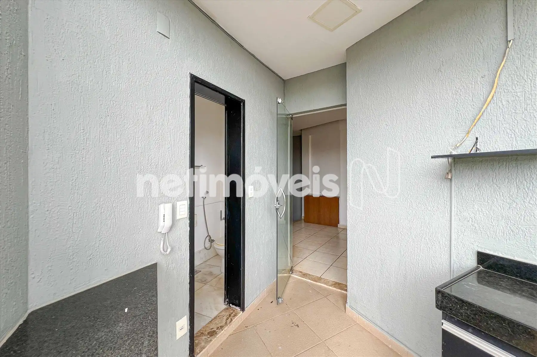 O banheiro social possui bancada em granito e box blindex.