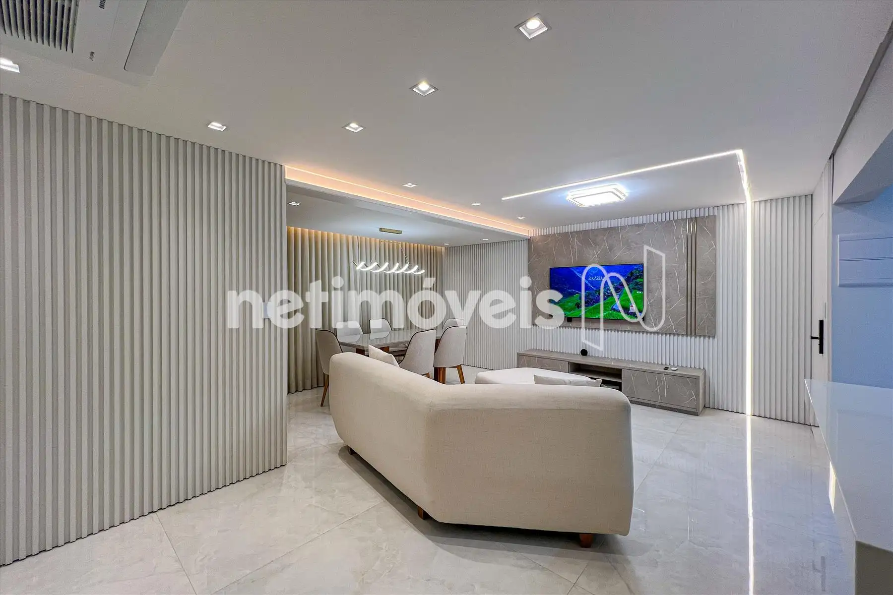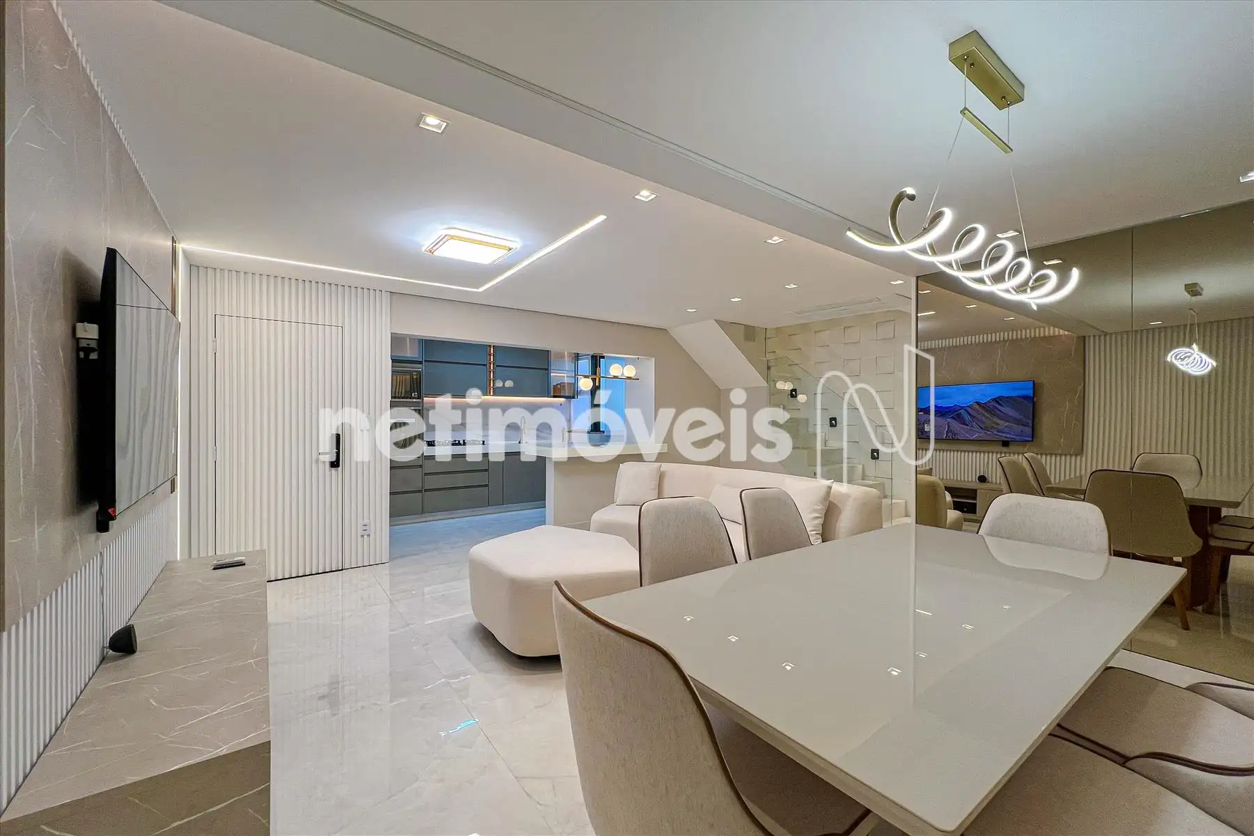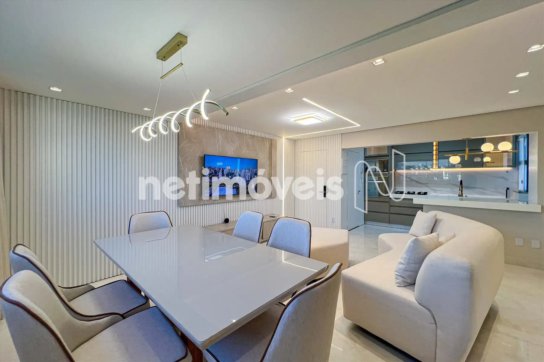Sala ampla para dois ambientes, 03 quartos sendo um suíte máster, banho social, cozinha com conceito aberto e área de serviço separada.
