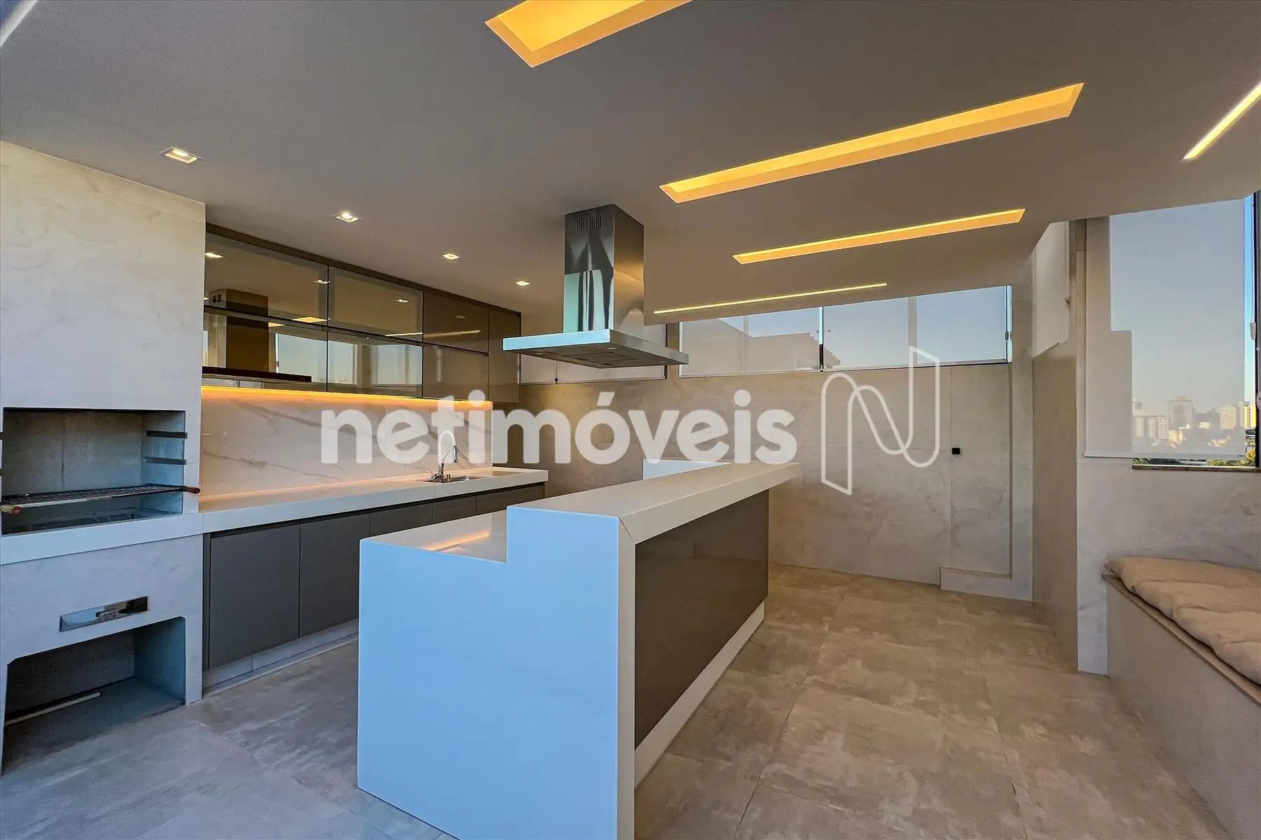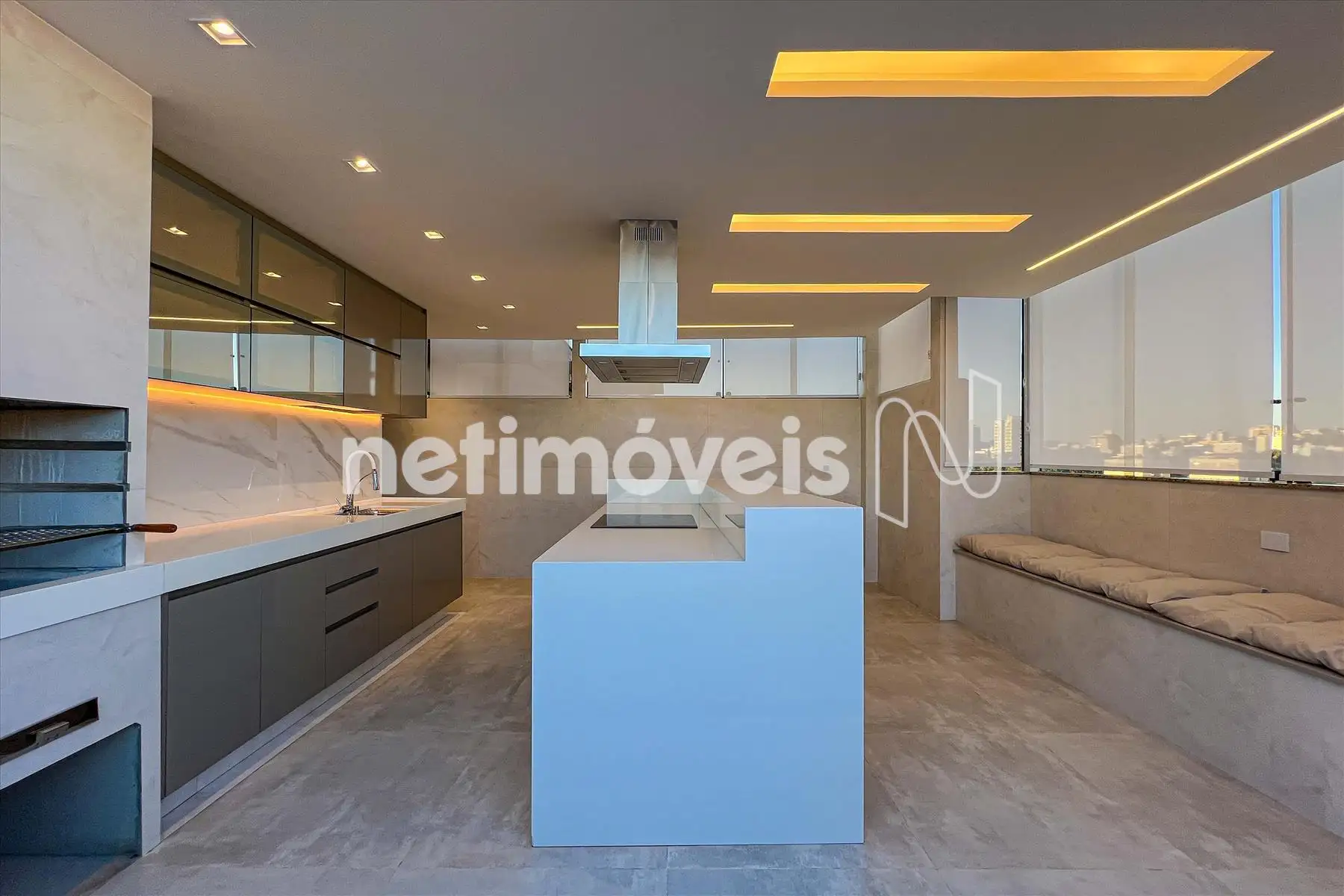 Área gourmet toda montada com churrasqueira, fogão de indução, coifa e armários;
