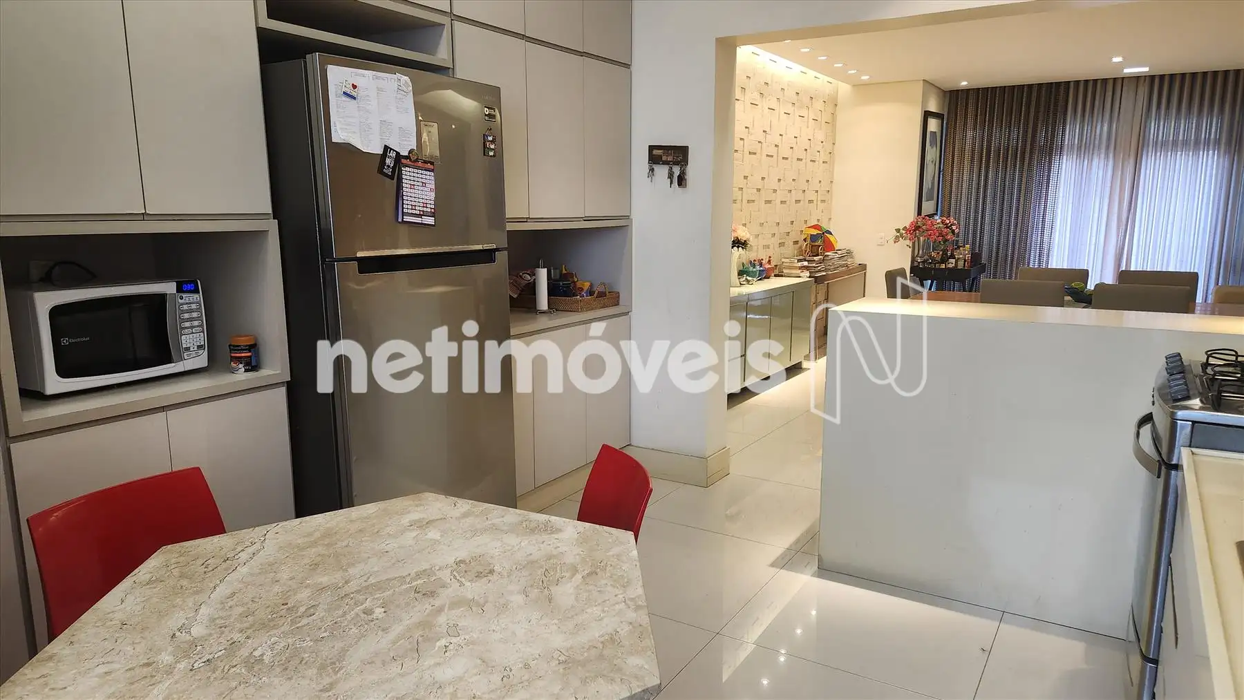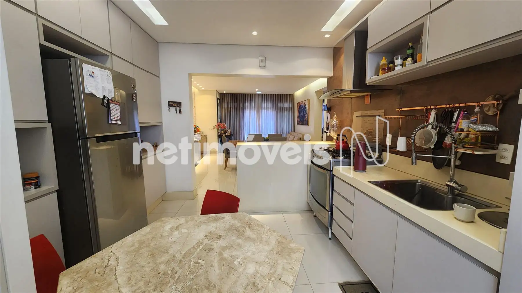 Cozinha planejada com armários de alto padrão, bancadas em pedra nobre e excelente funcionalidade
