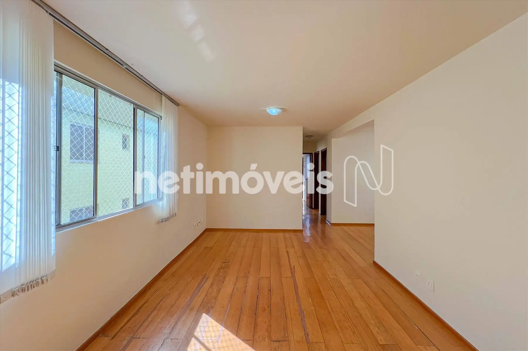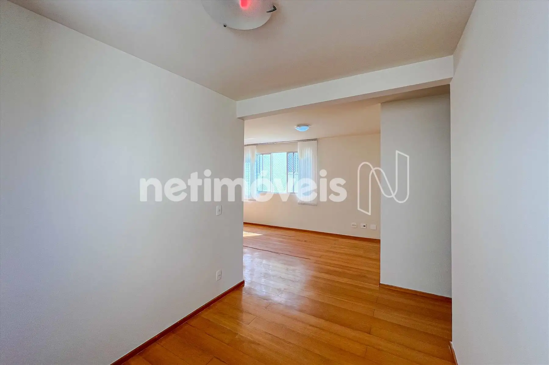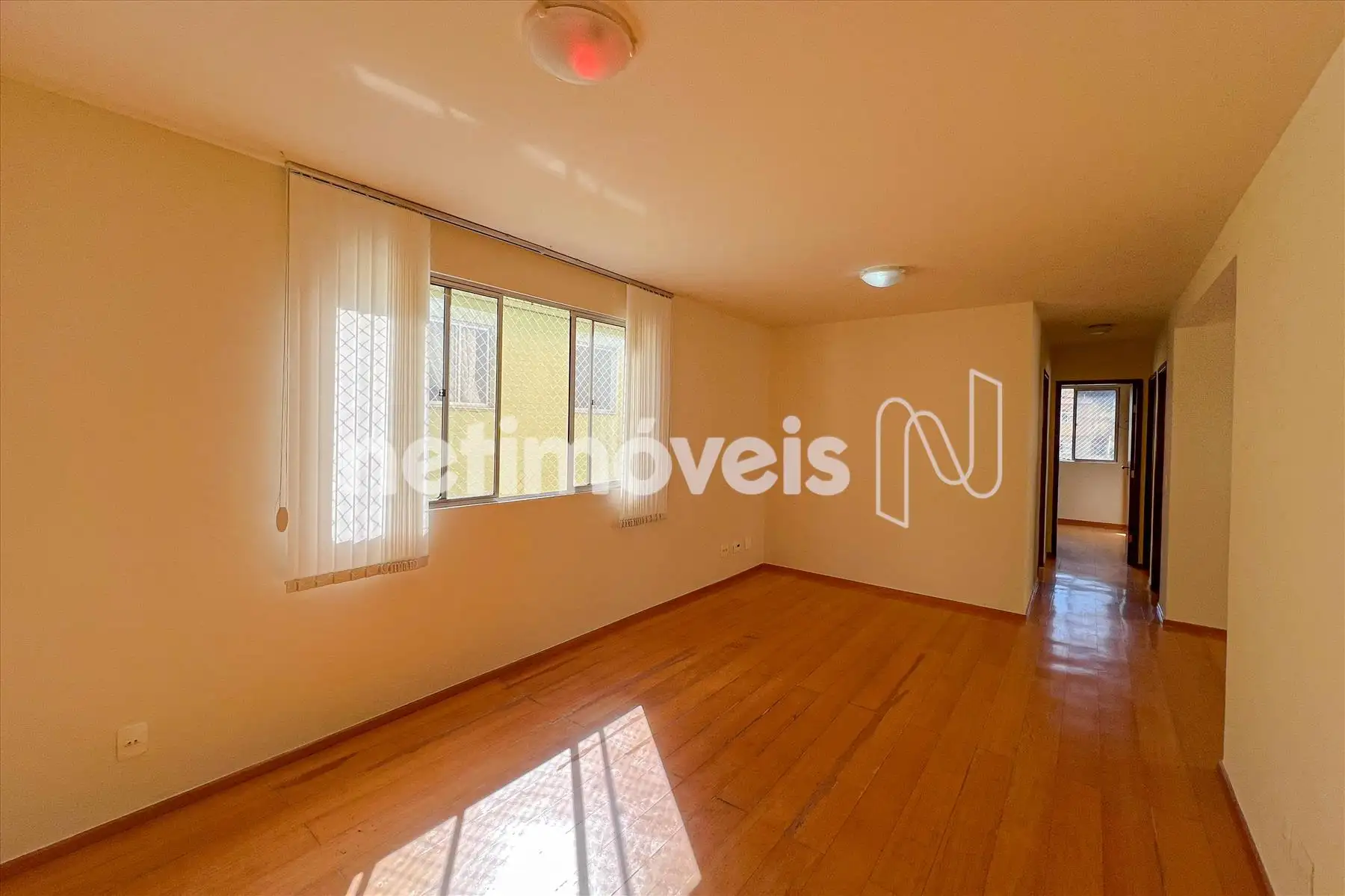 Sala 02 ambientes com cortinas e piso laminado de madeira.