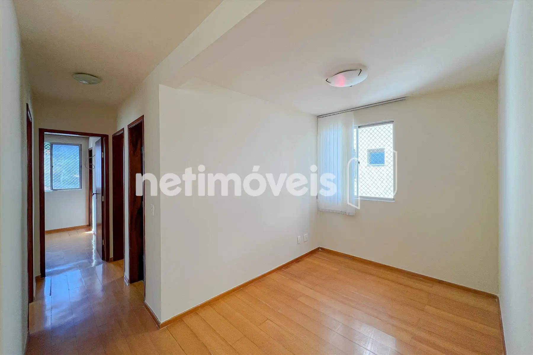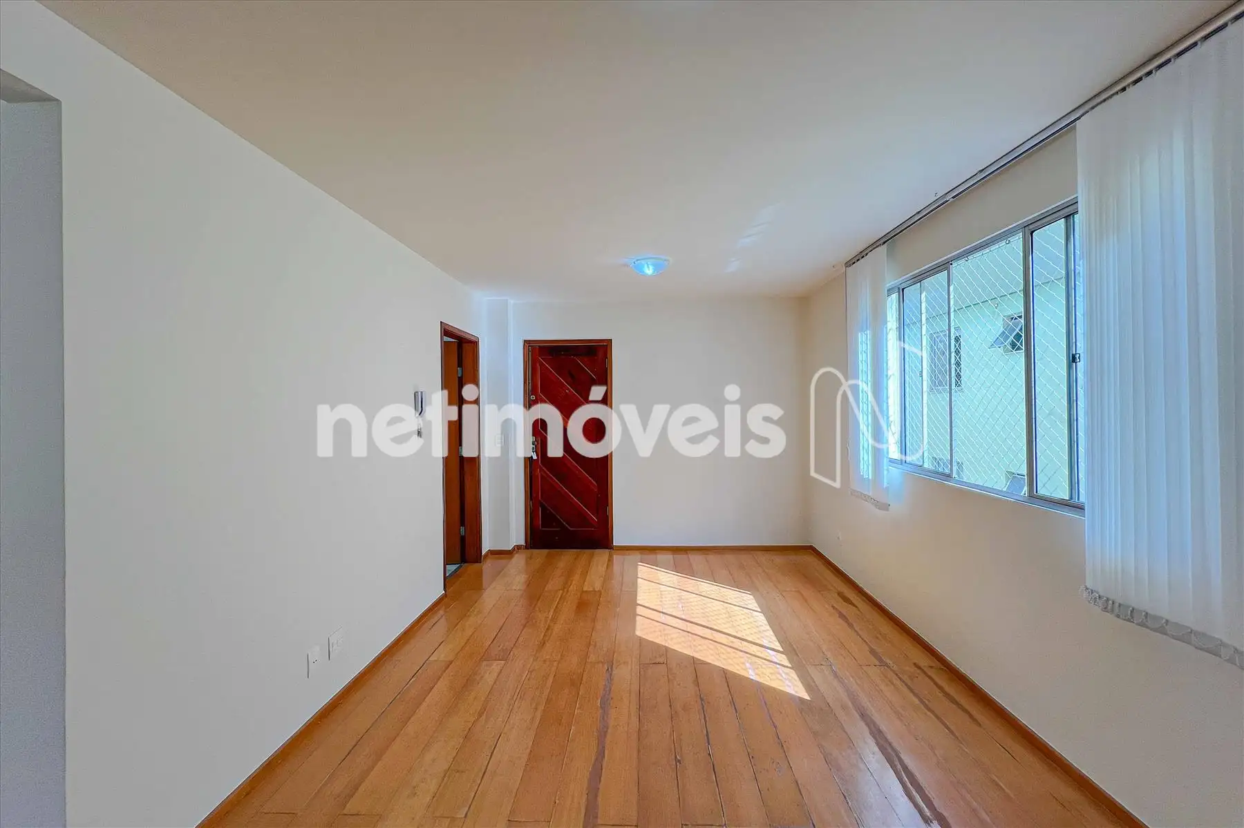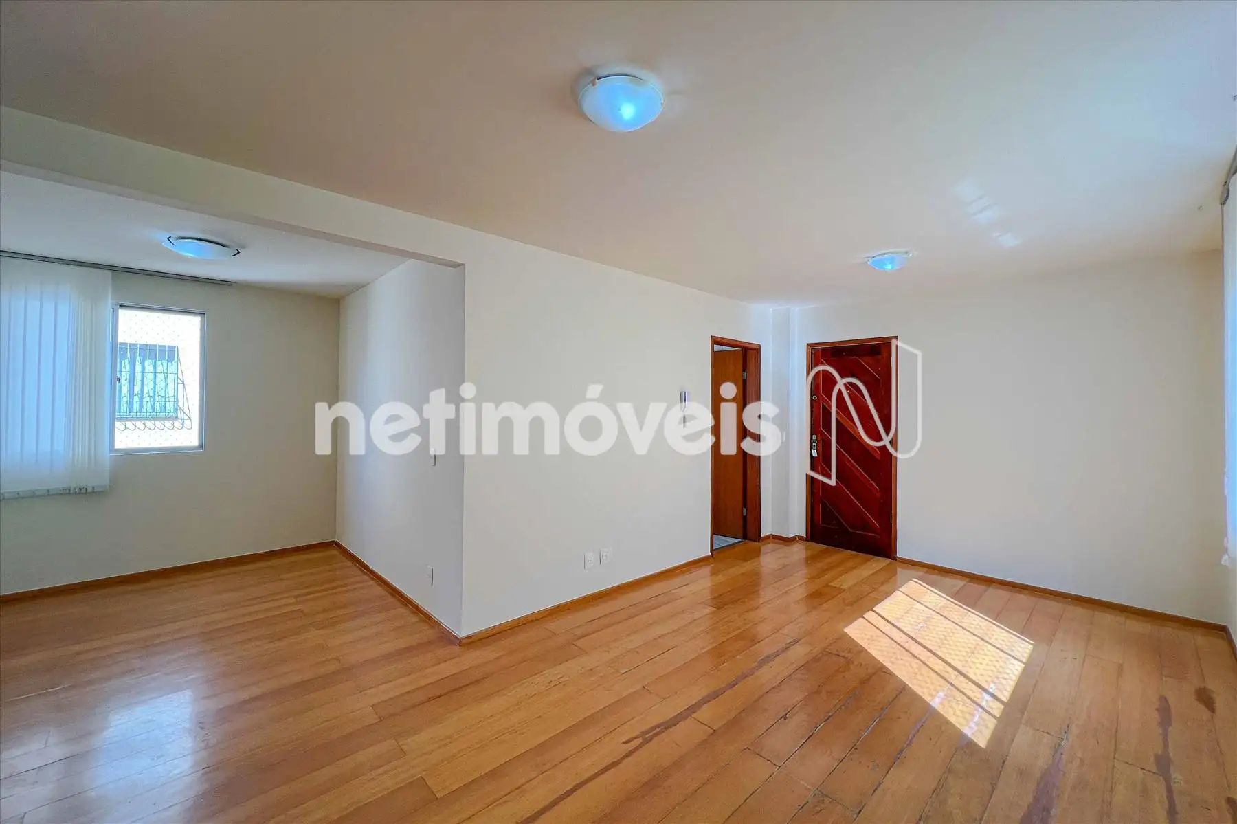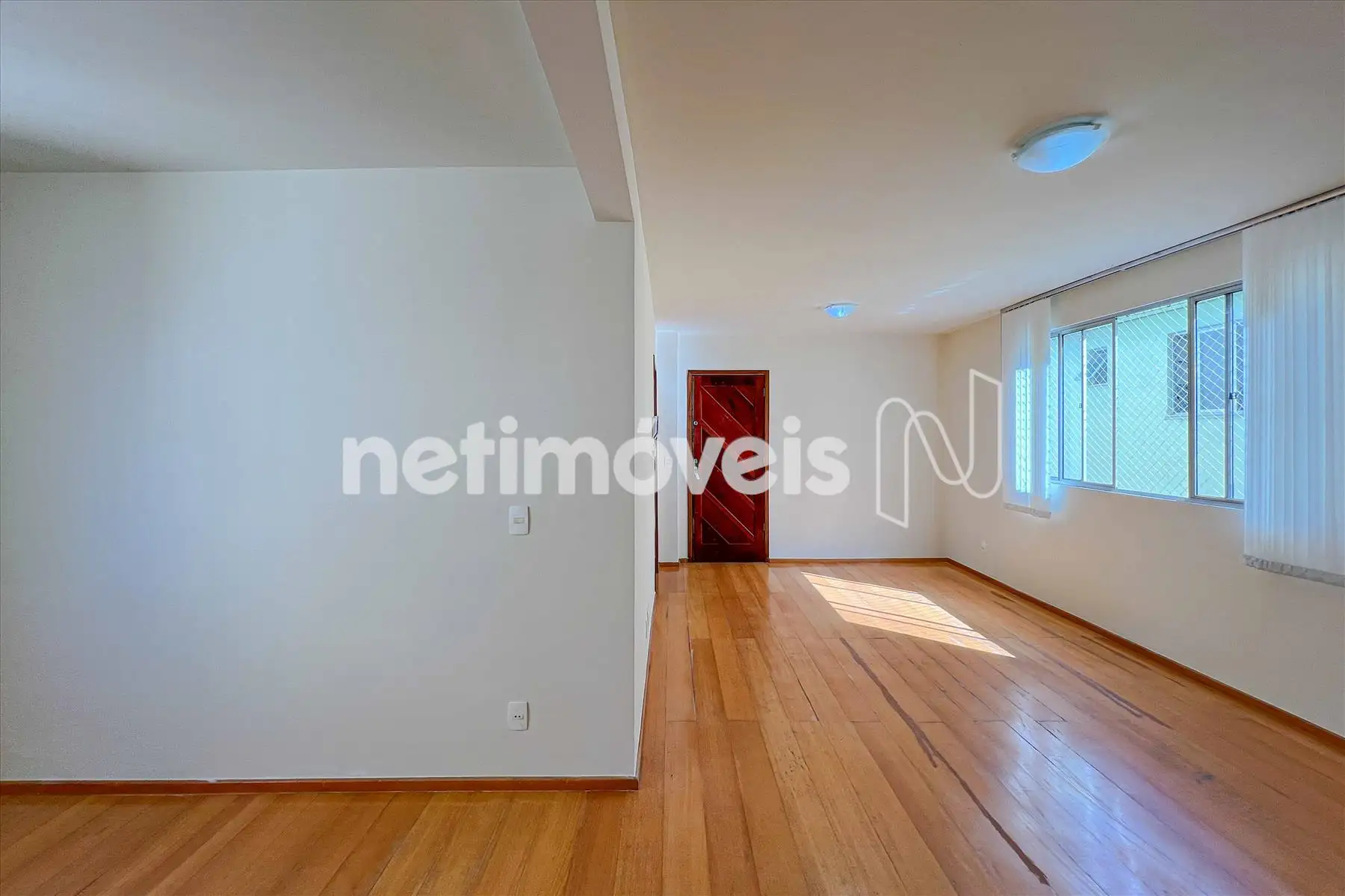 Sala 02 ambientes com cortinas e piso laminado de madeira.