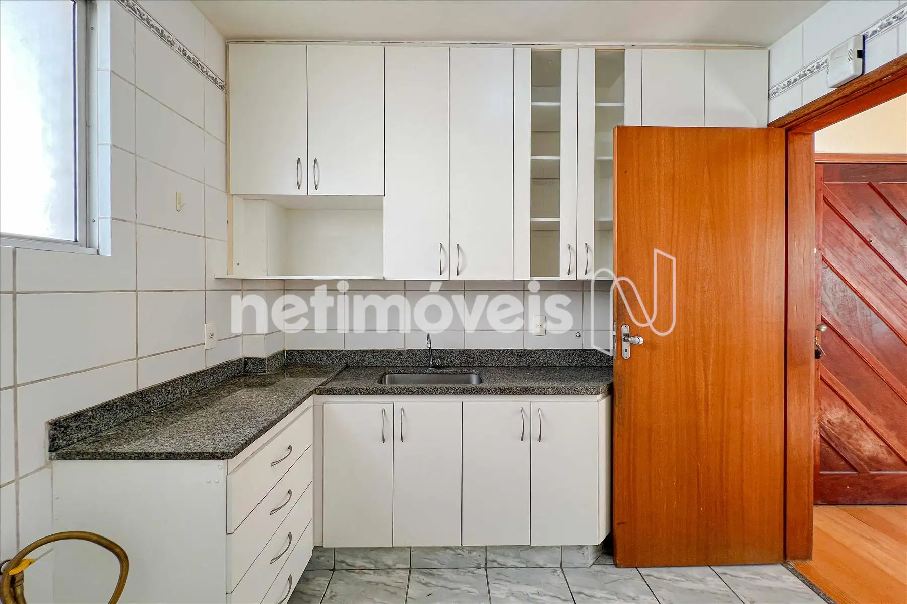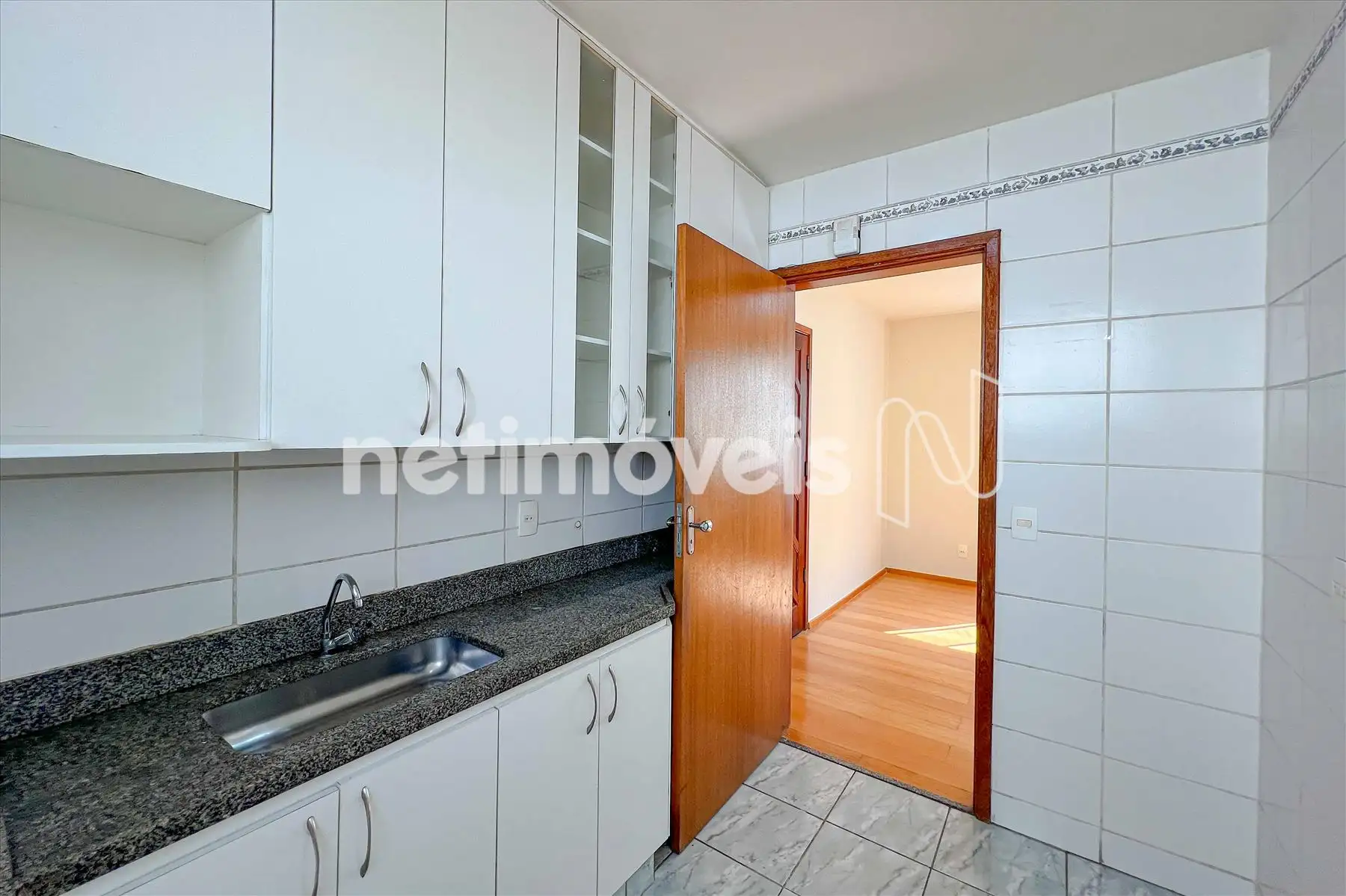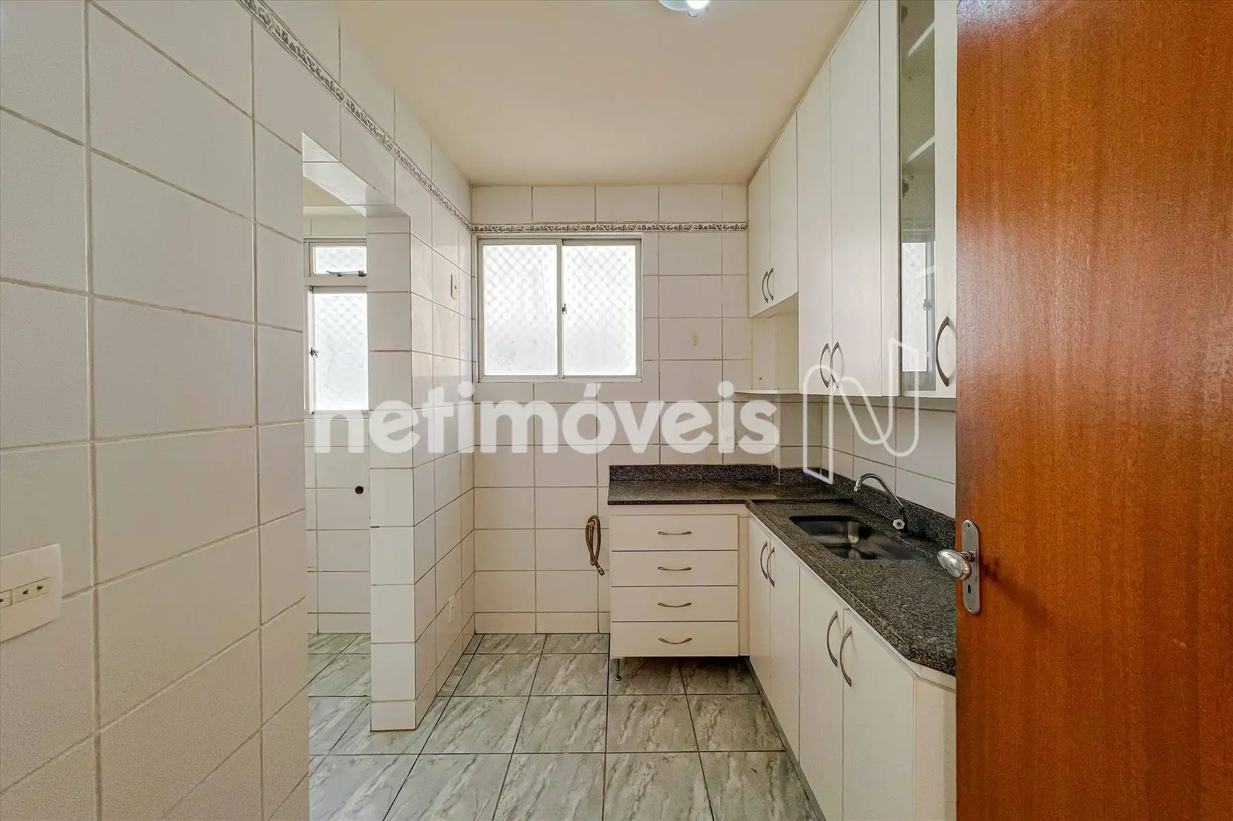 Cozinha azulejada até o teto com armários acima e abaixo da pia com bancada em granito e piso em cerâmica.