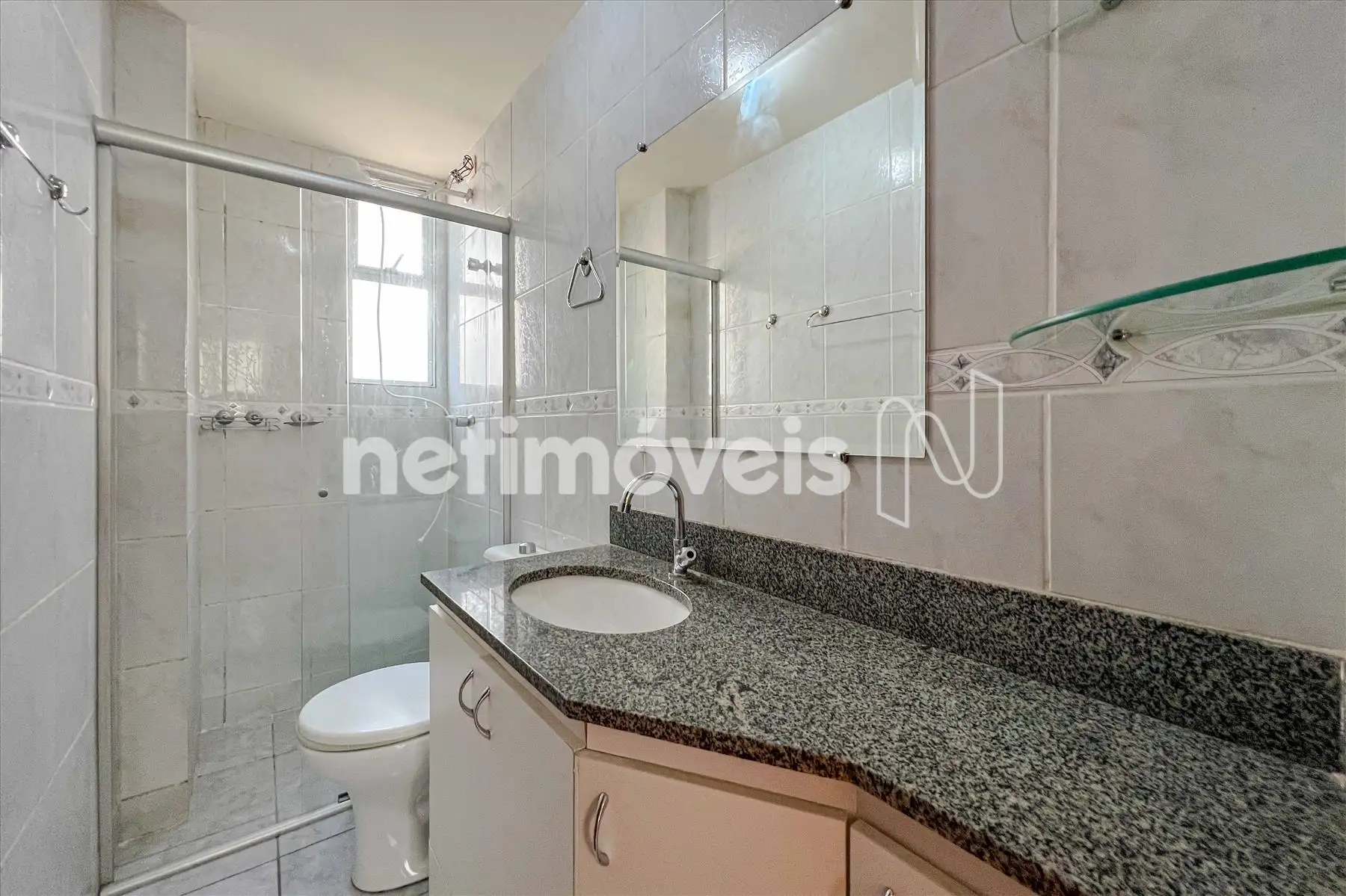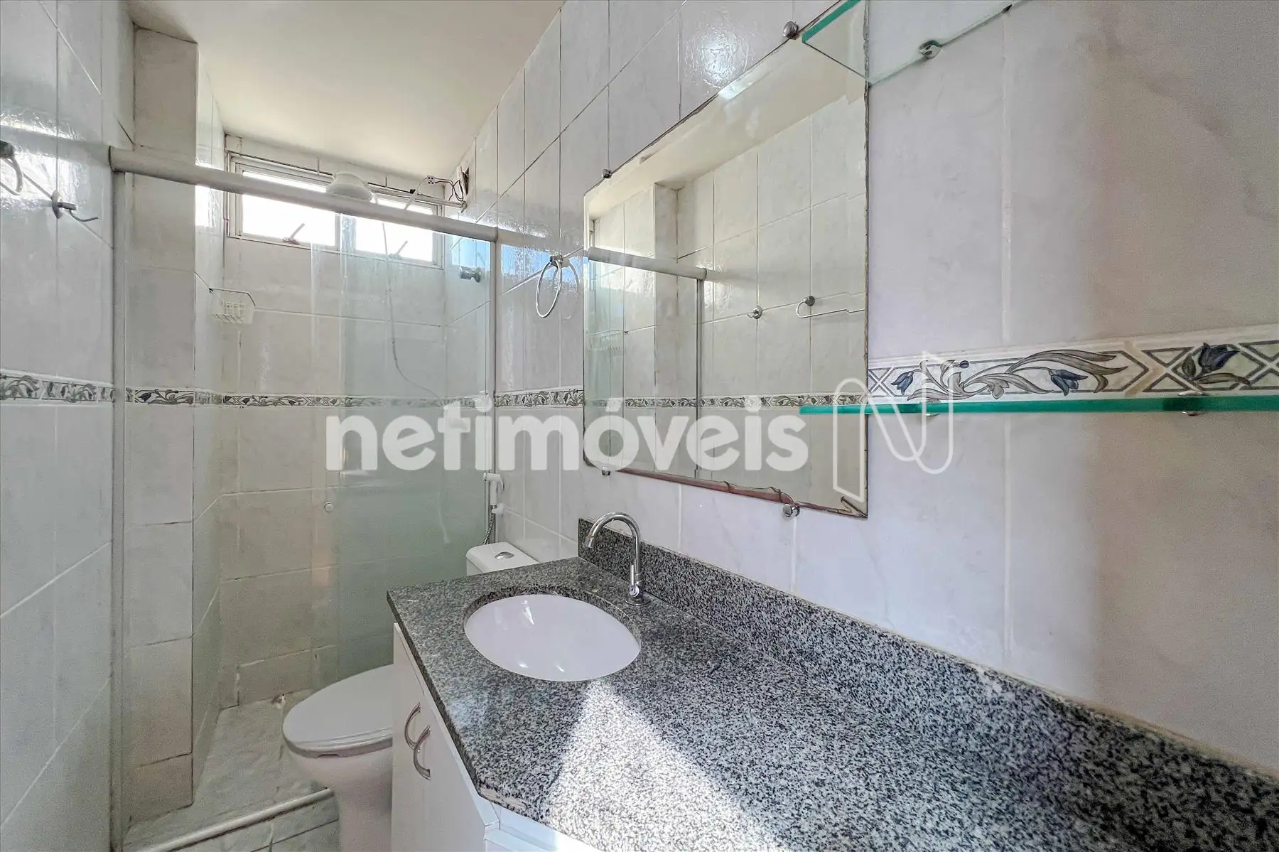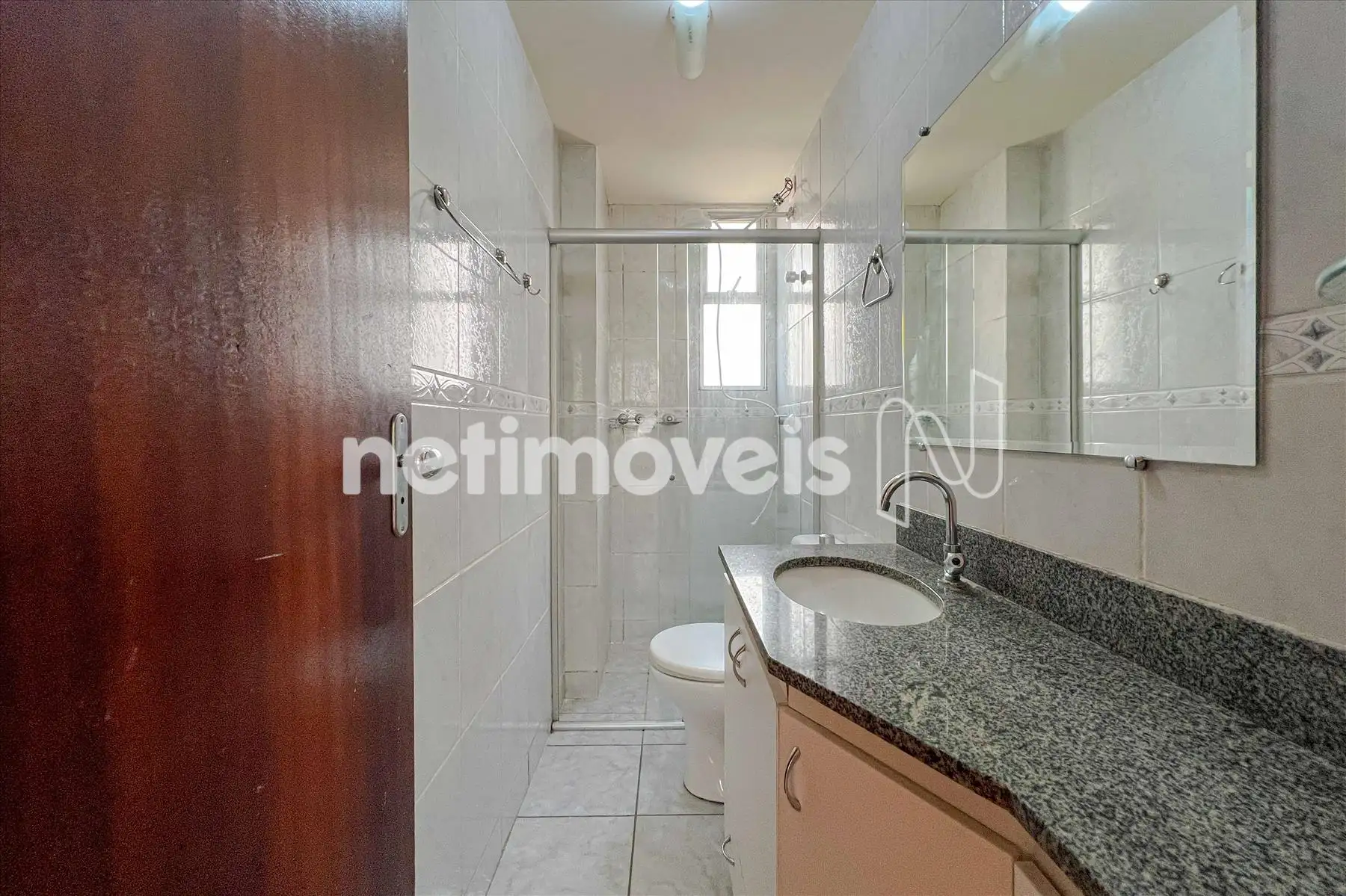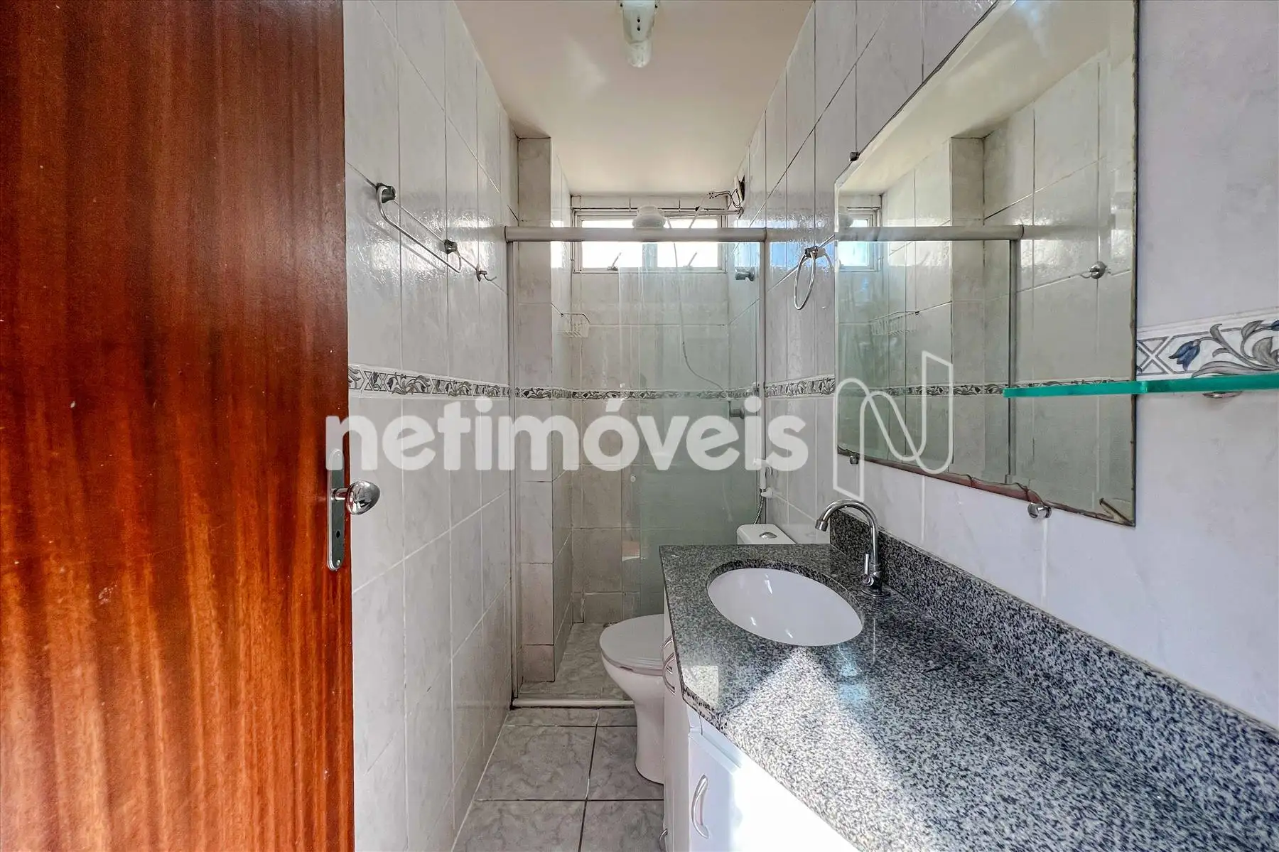 Banho social azulejado até o teto com box em blindex, espelho, armário abaixo da pia com bancada em granito e piso em cerâmica, corredor piso laminado de madeira.