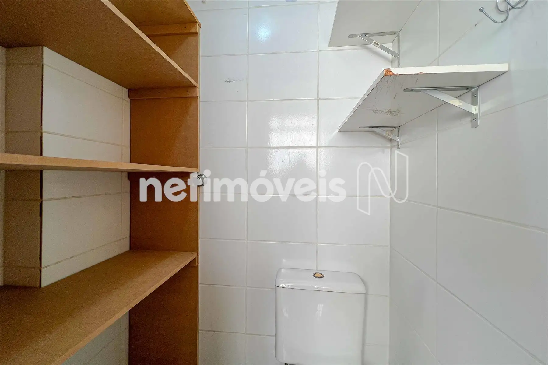 Banho de empregada azulejada até o teto e piso em cerâmica.