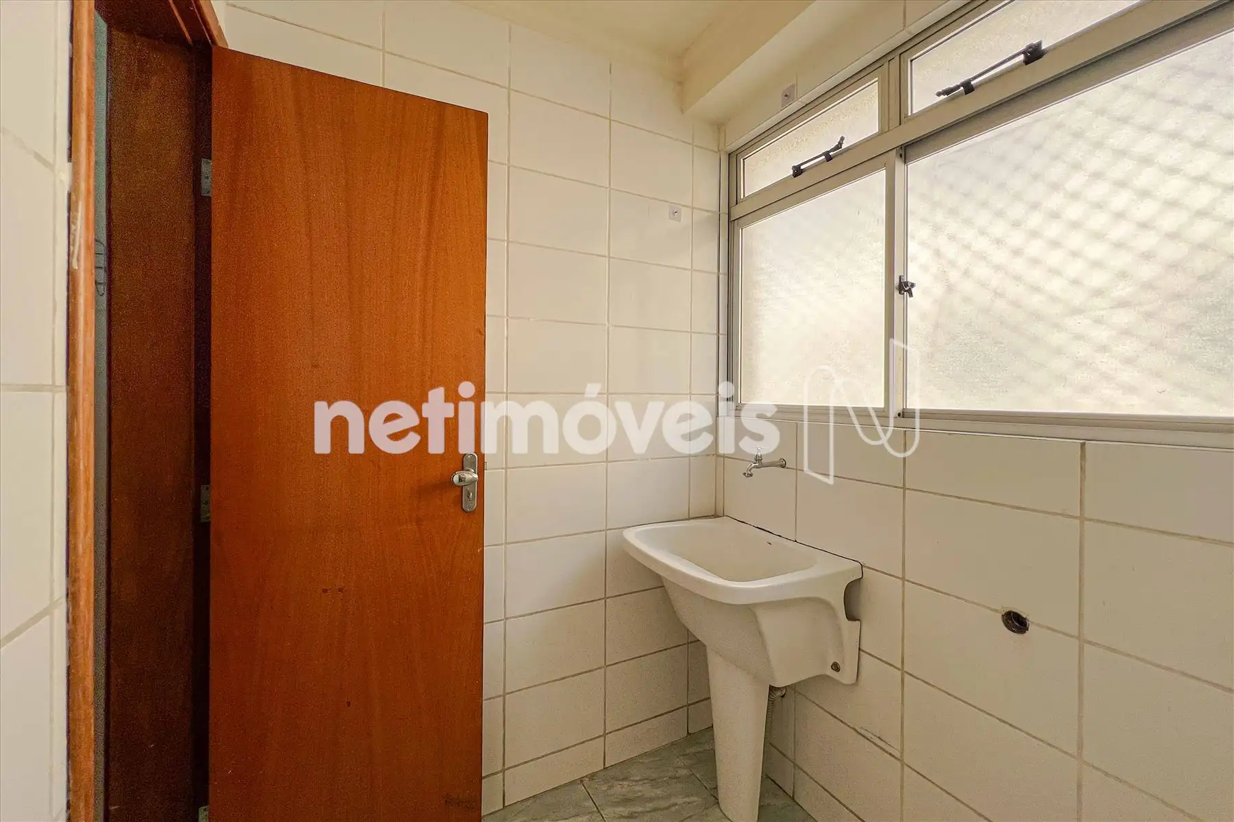 Área de serviço azulejada até o teto e piso em cerâmica.