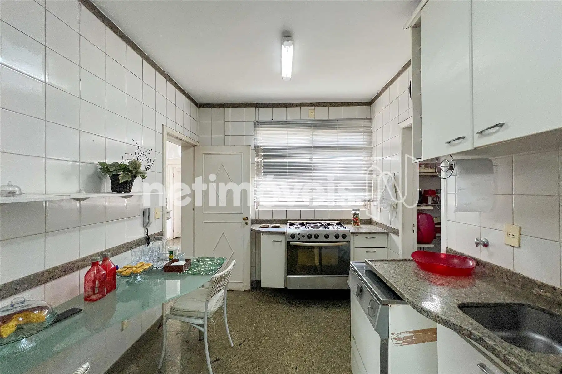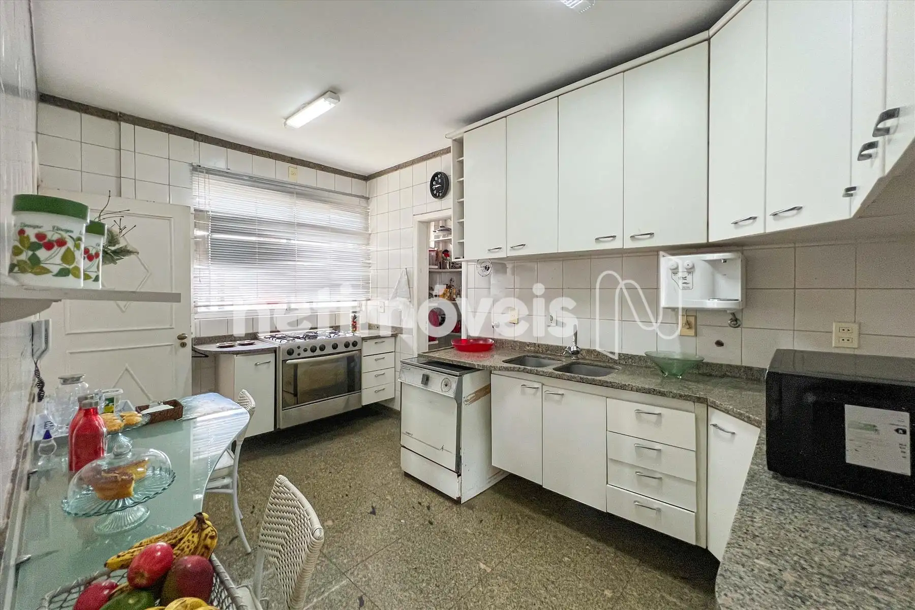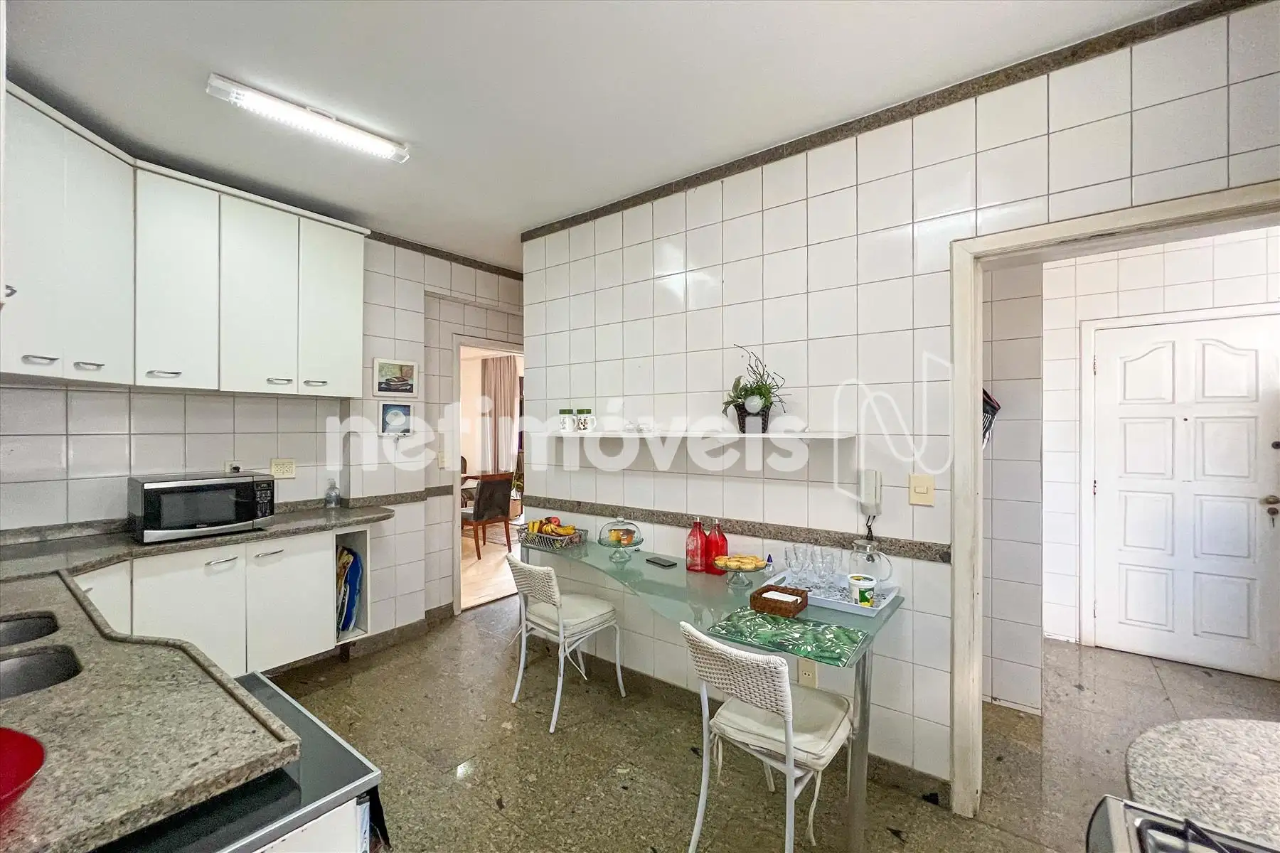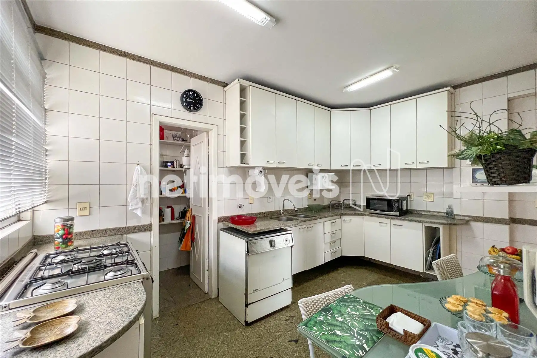 Cozinha com despensa, bancada em granito e armários sob e sobre a bancada;