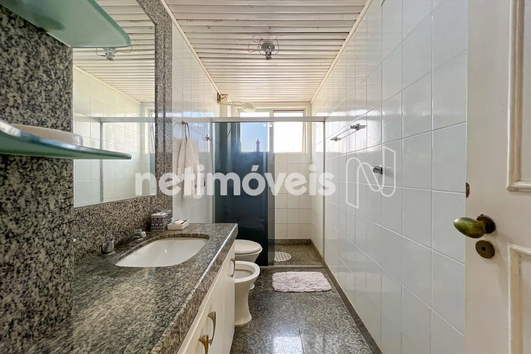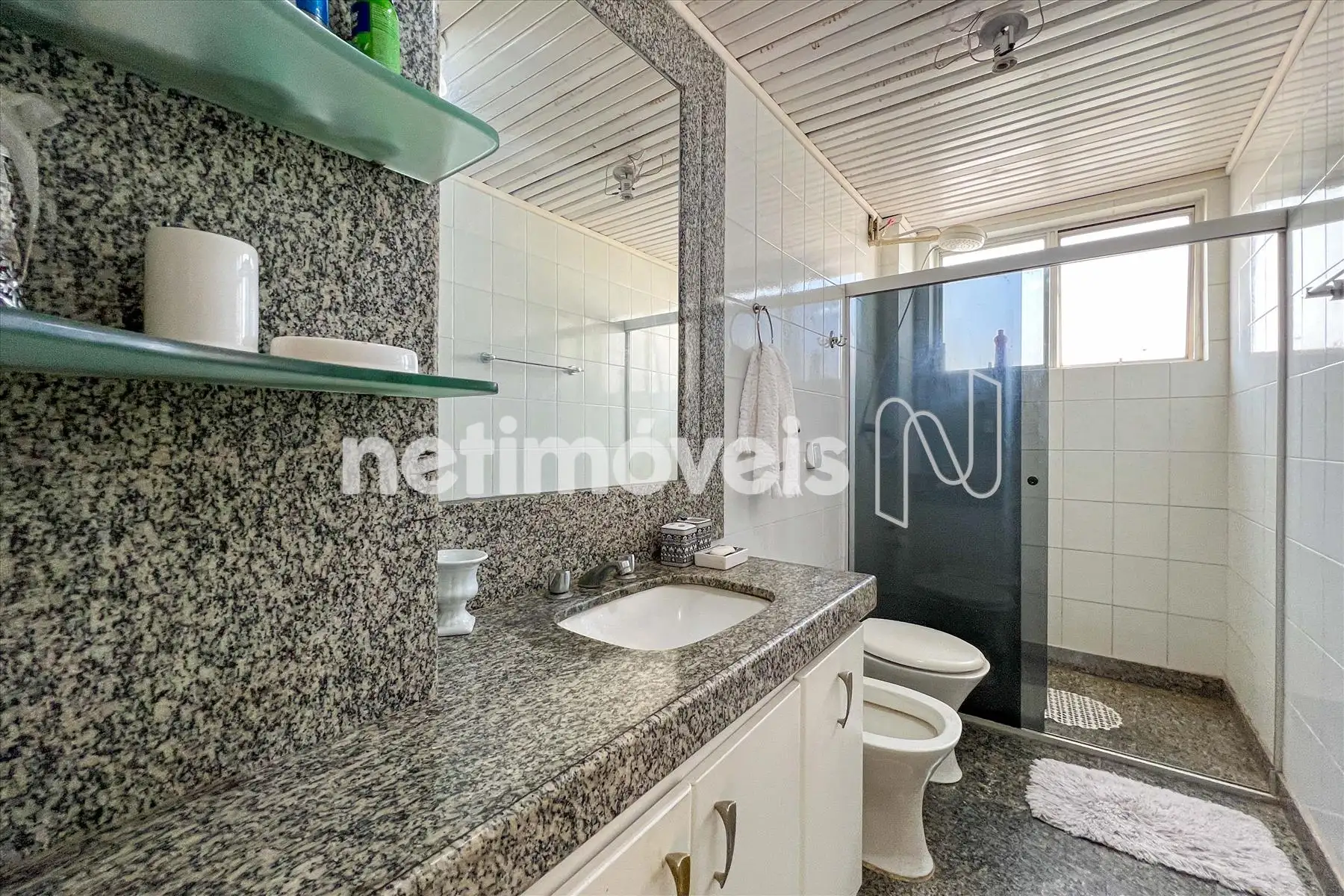 Banho social com bancada, armário, box blindex e piso em granito;