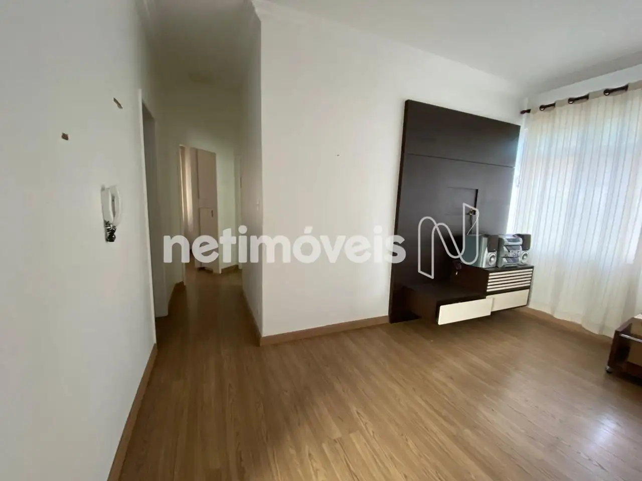 Sala para 2 ambientes com painel, piso laminado