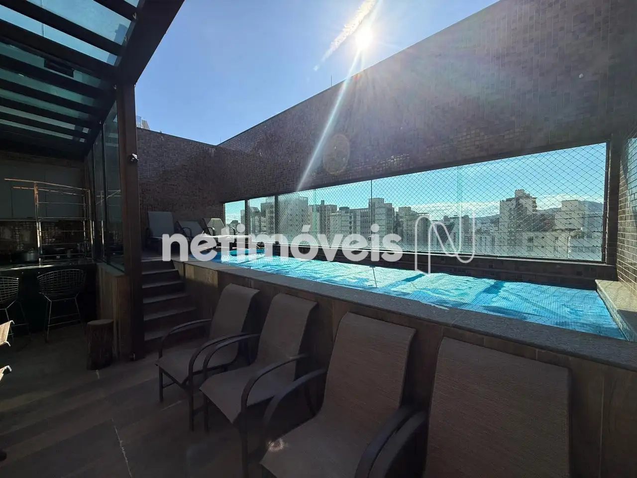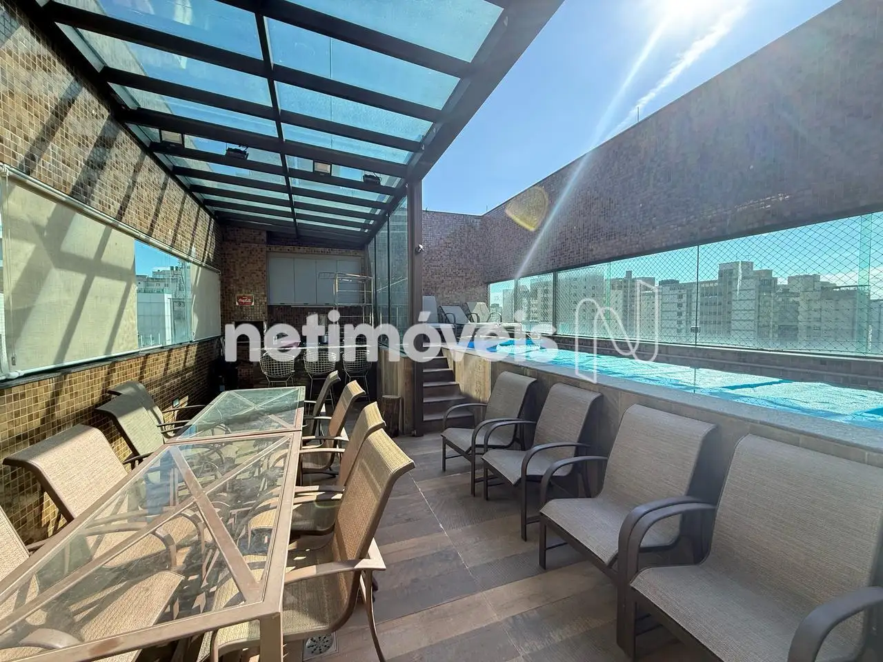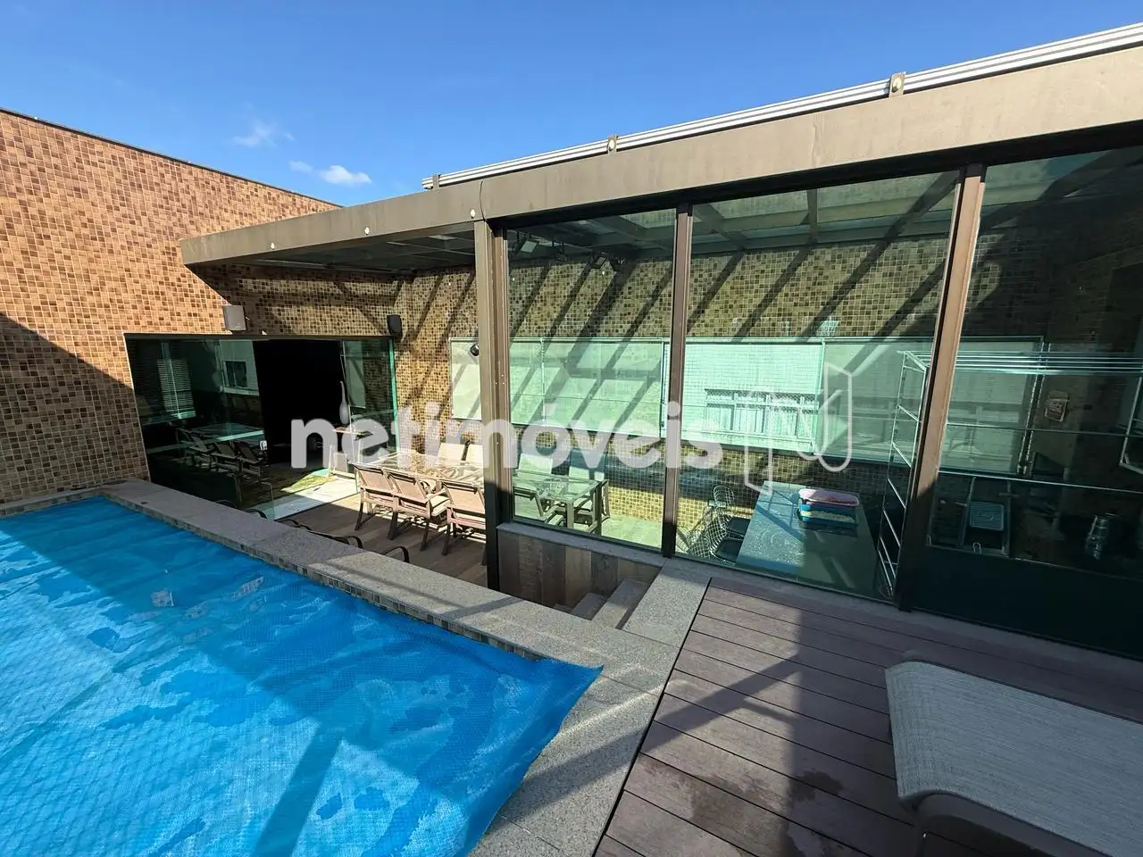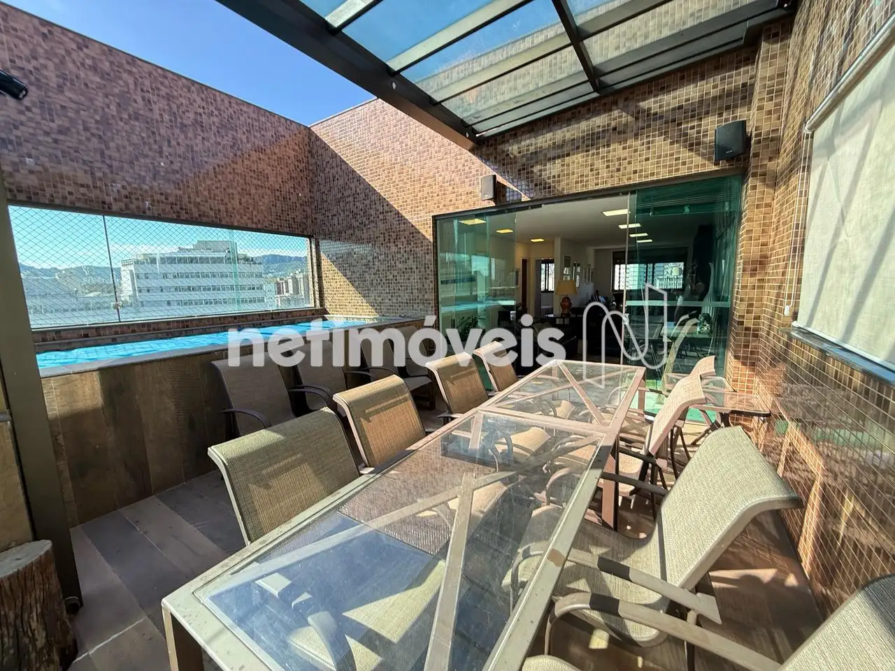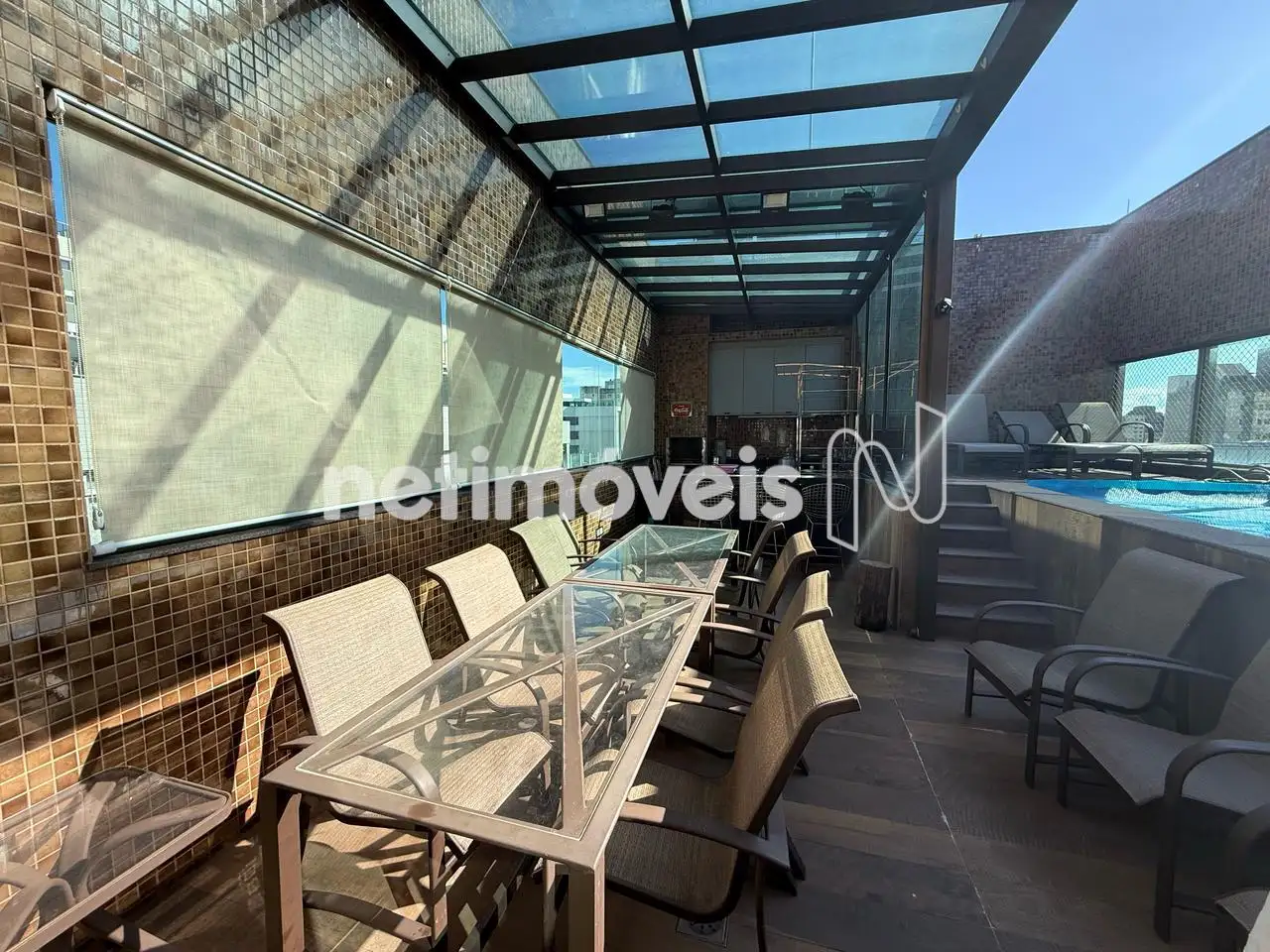 Área externa com gourmet, teto retrátil e piscina aquecida.