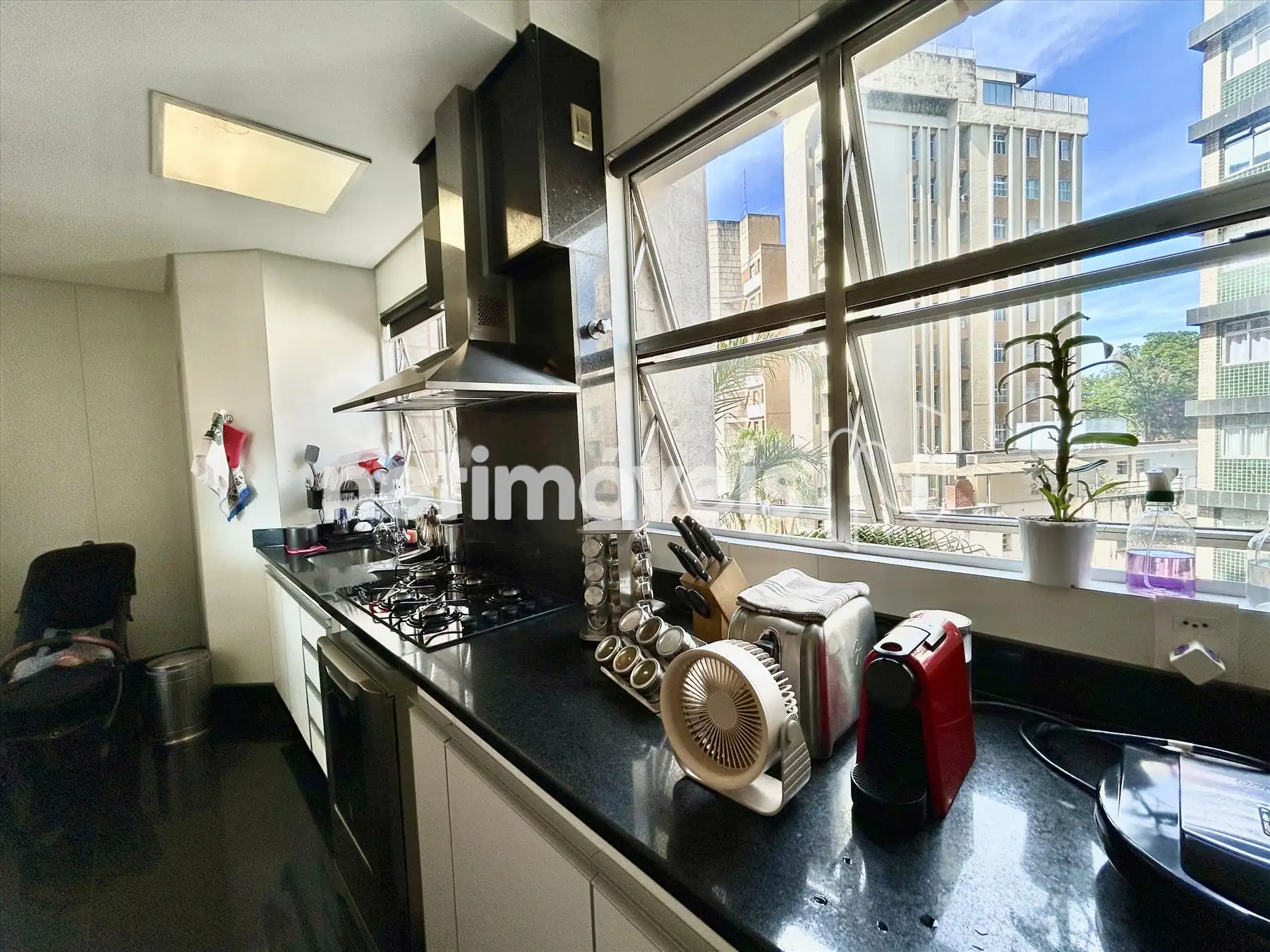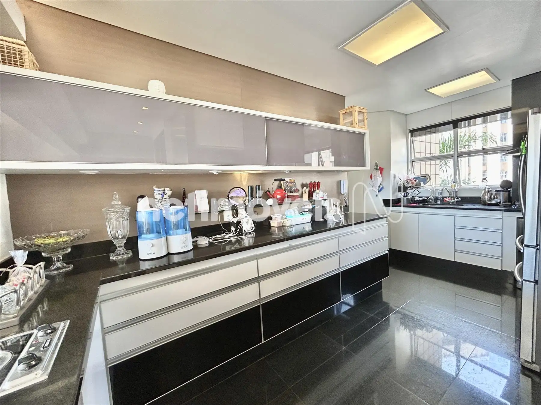 - Cozinha com armários, bancadas e piso em granito.
