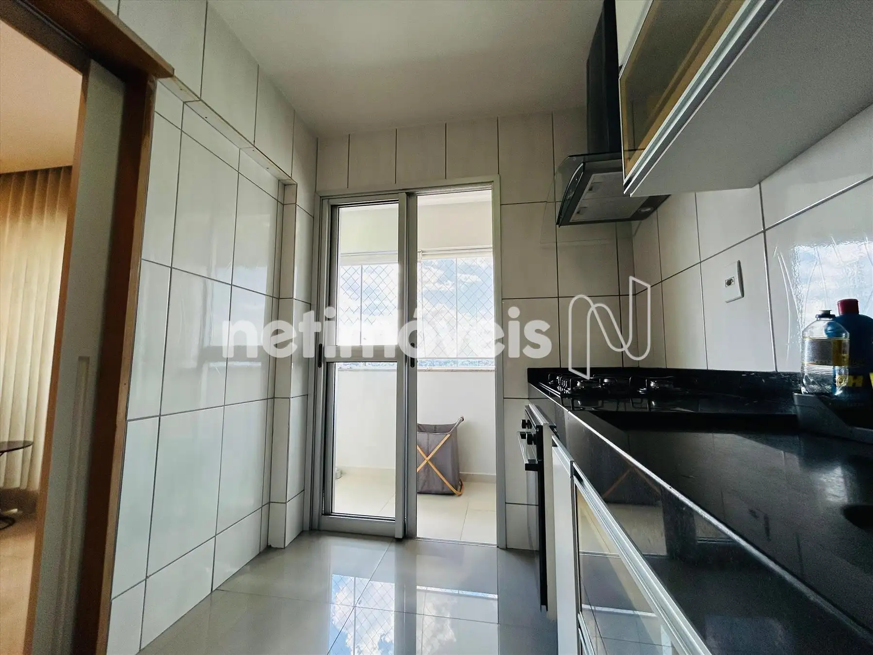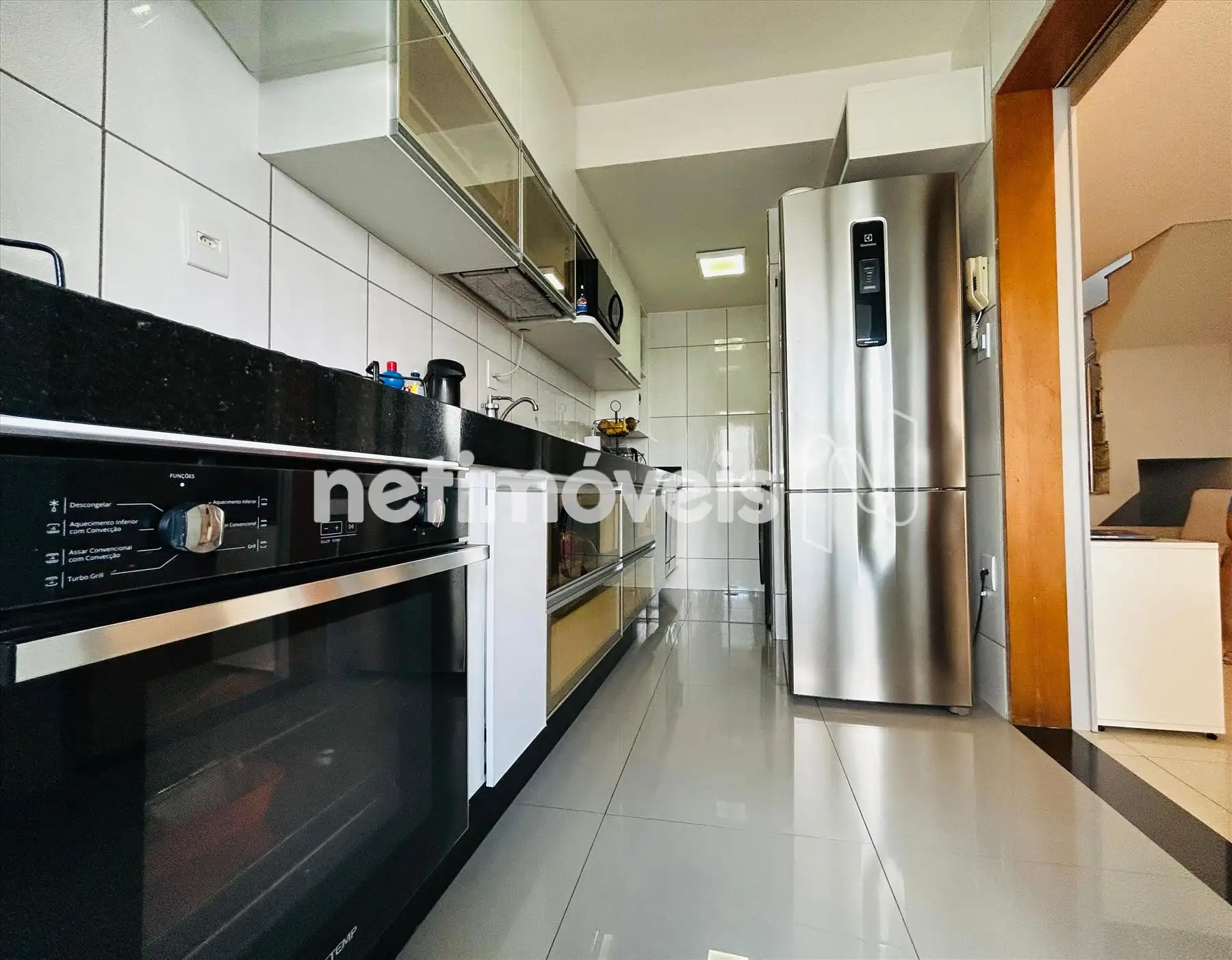 Cozinha com armários, piso e bancada em granito.