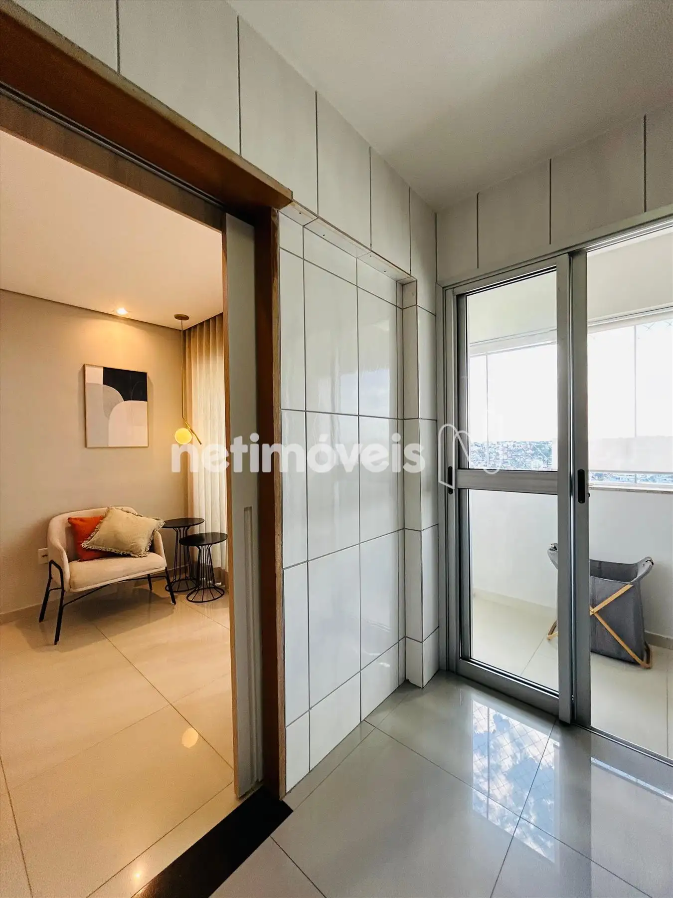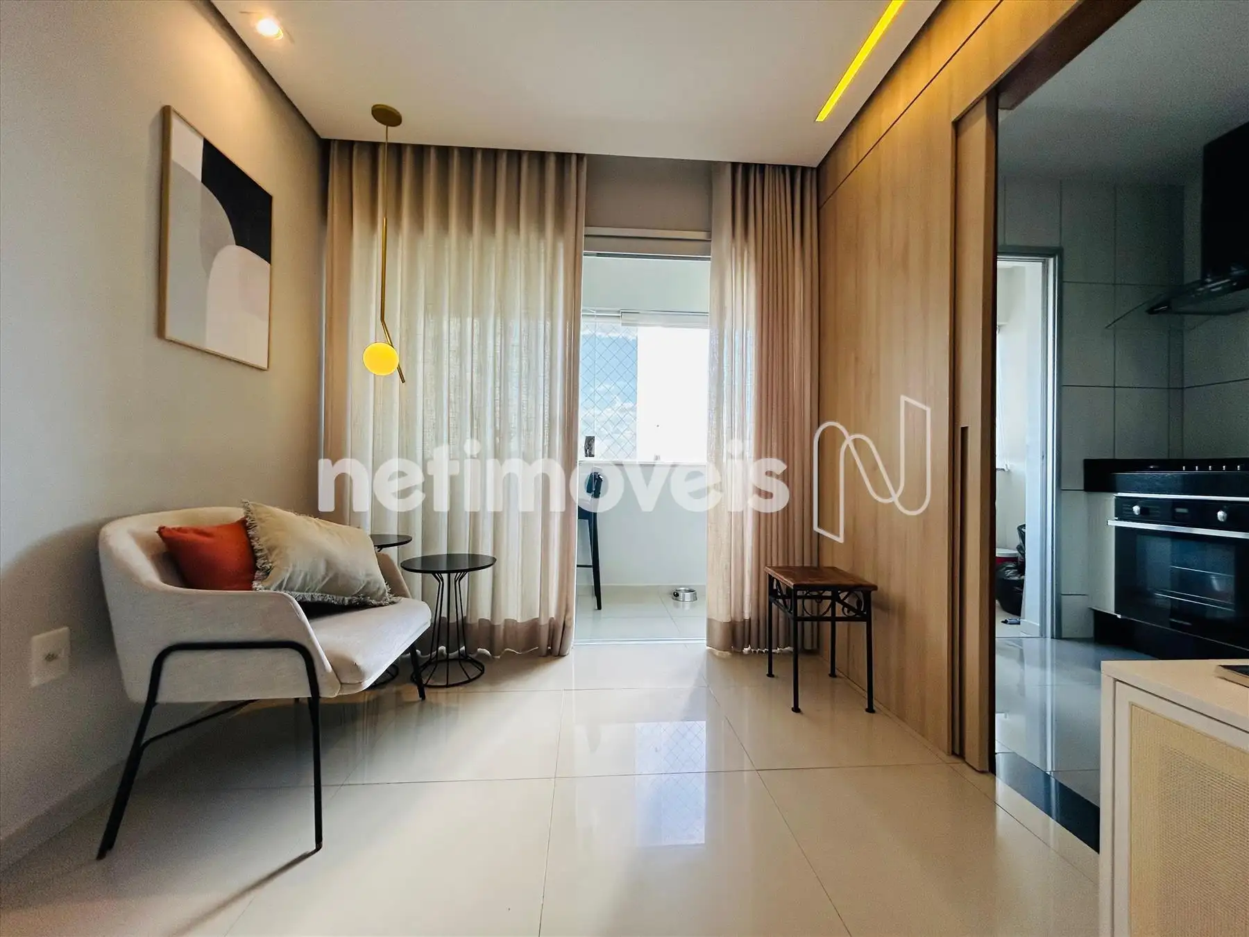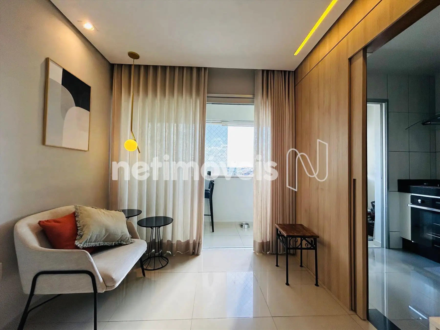 Sala com varanda incorporada, com piso em porcelanato