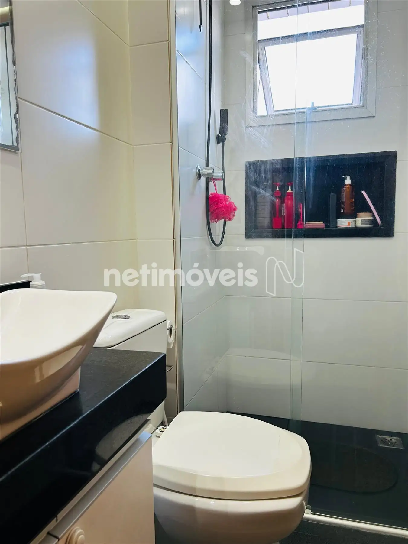 Banho suíte com armários, box blindex, piso e bancada em granito.
