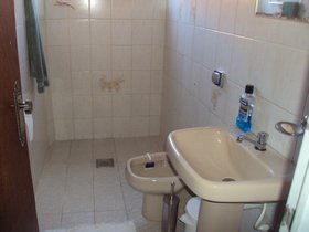 Banhos social e suite com piso em cerâmica.