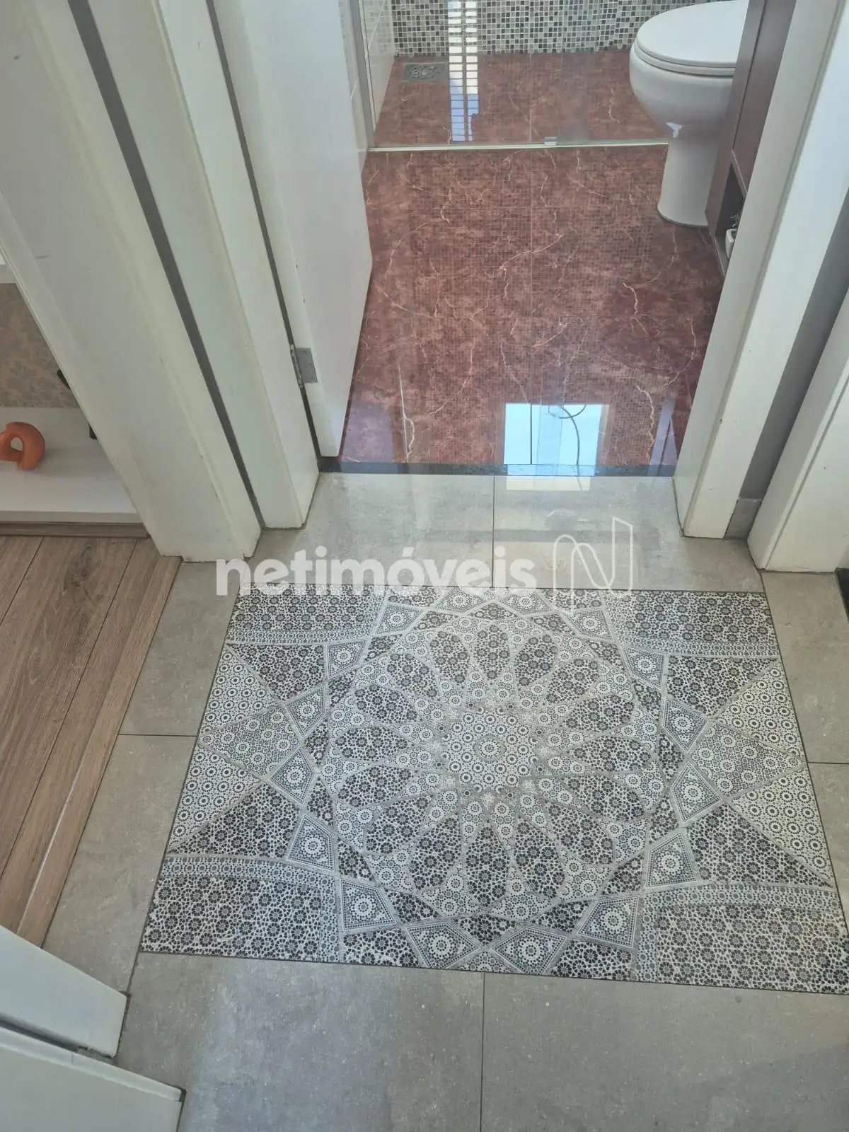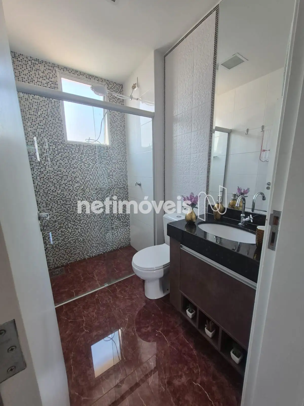 * Banho social com elegante piso em granito marrom marmorizado, bancada em granito e armário.