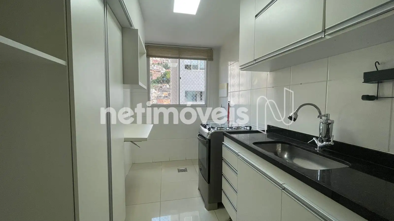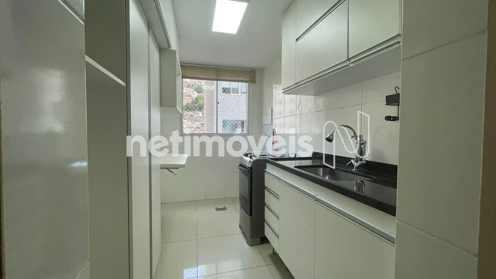 Cozinha com armários, piso e bancada em granito.