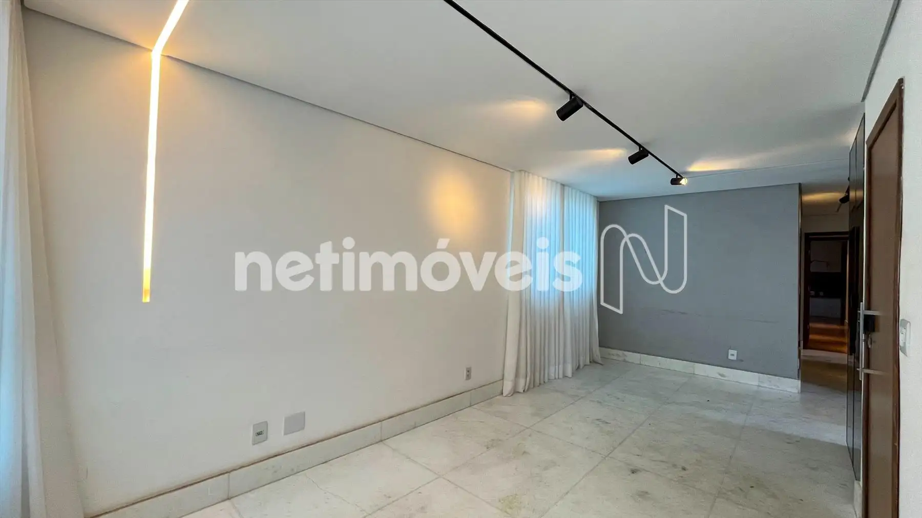 Sala ampla para dois ambientes, com piso em porcelanato, teto rebaixado em gesso e iluminação planejada, integrada à cozinha.