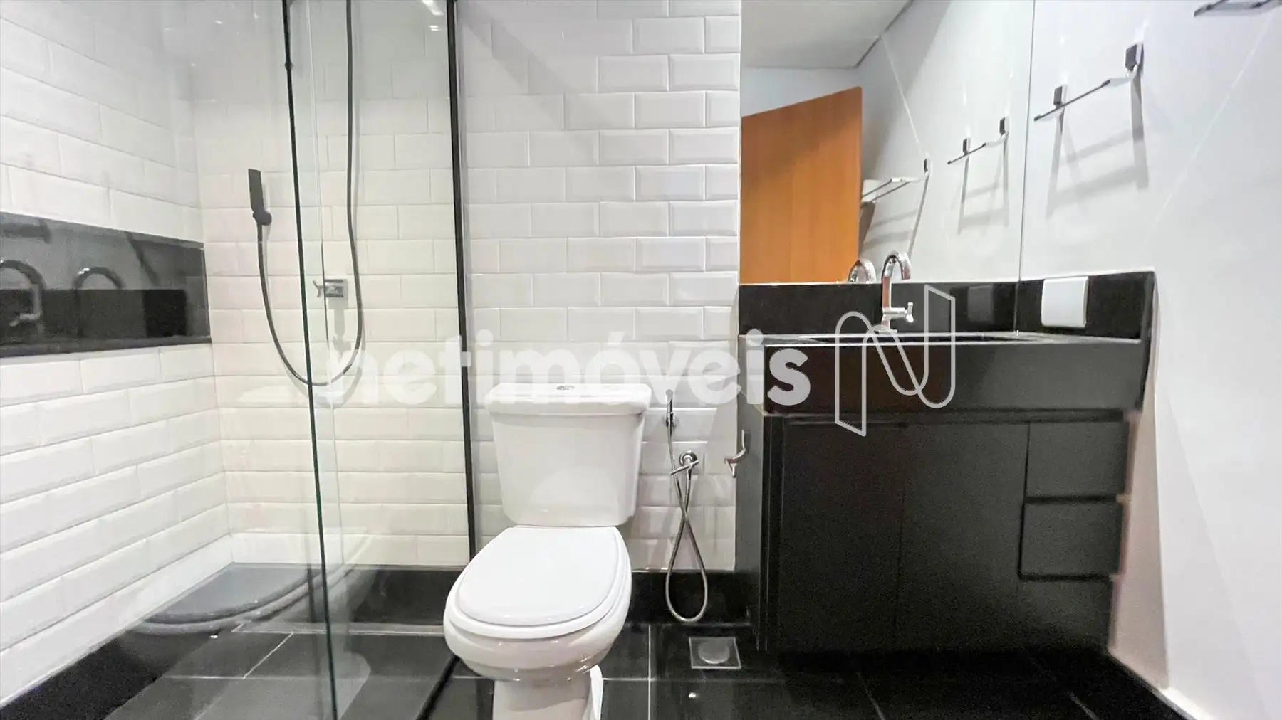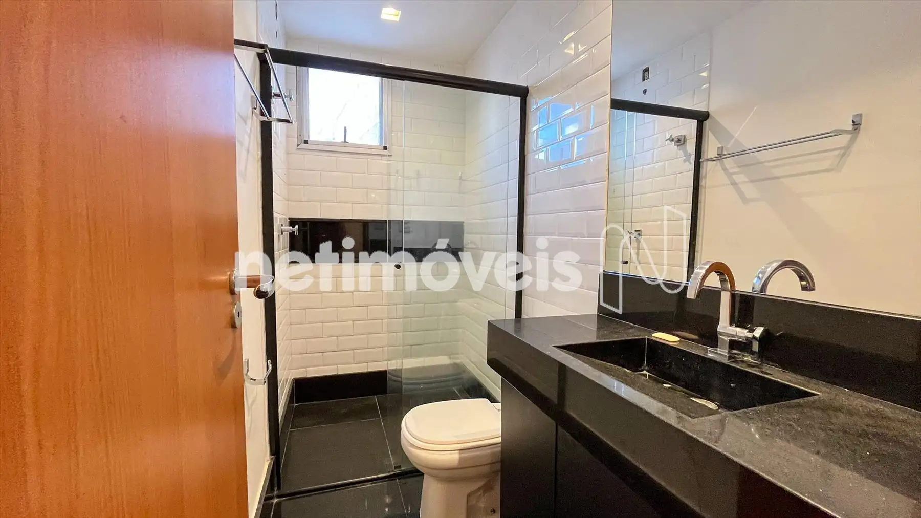 Banheiros sociais elegantes, com granito preto, iluminação projetada, espelhos, armários e box em blindex.