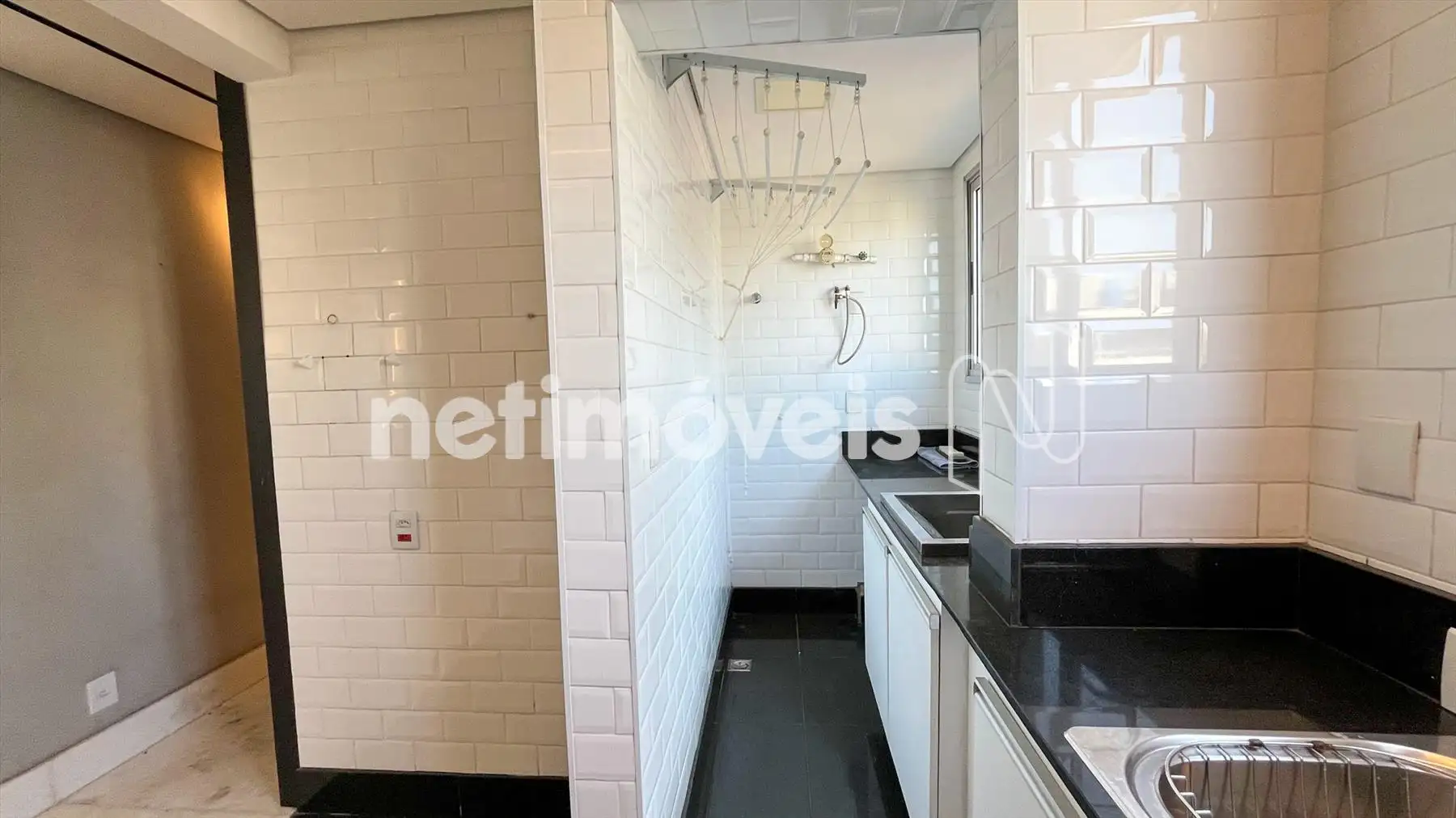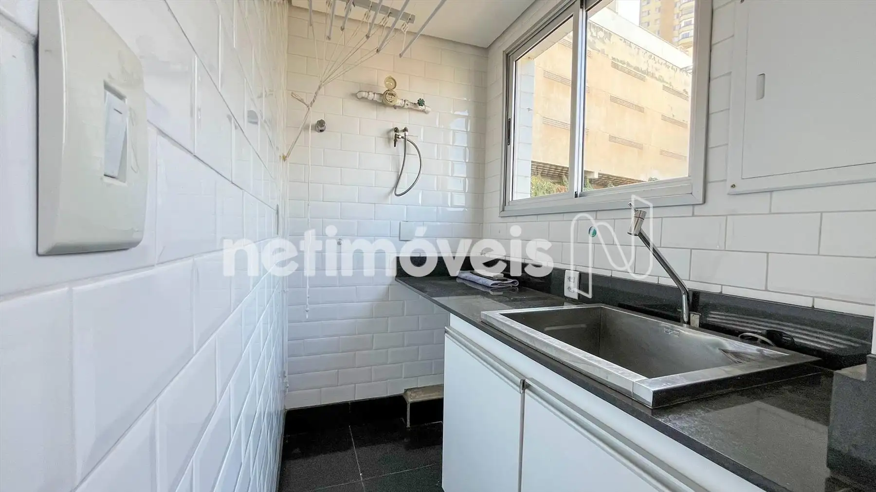 Área de serviço independente, com bancada em granito e tanque.