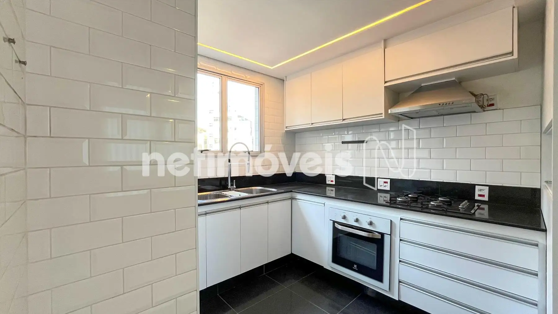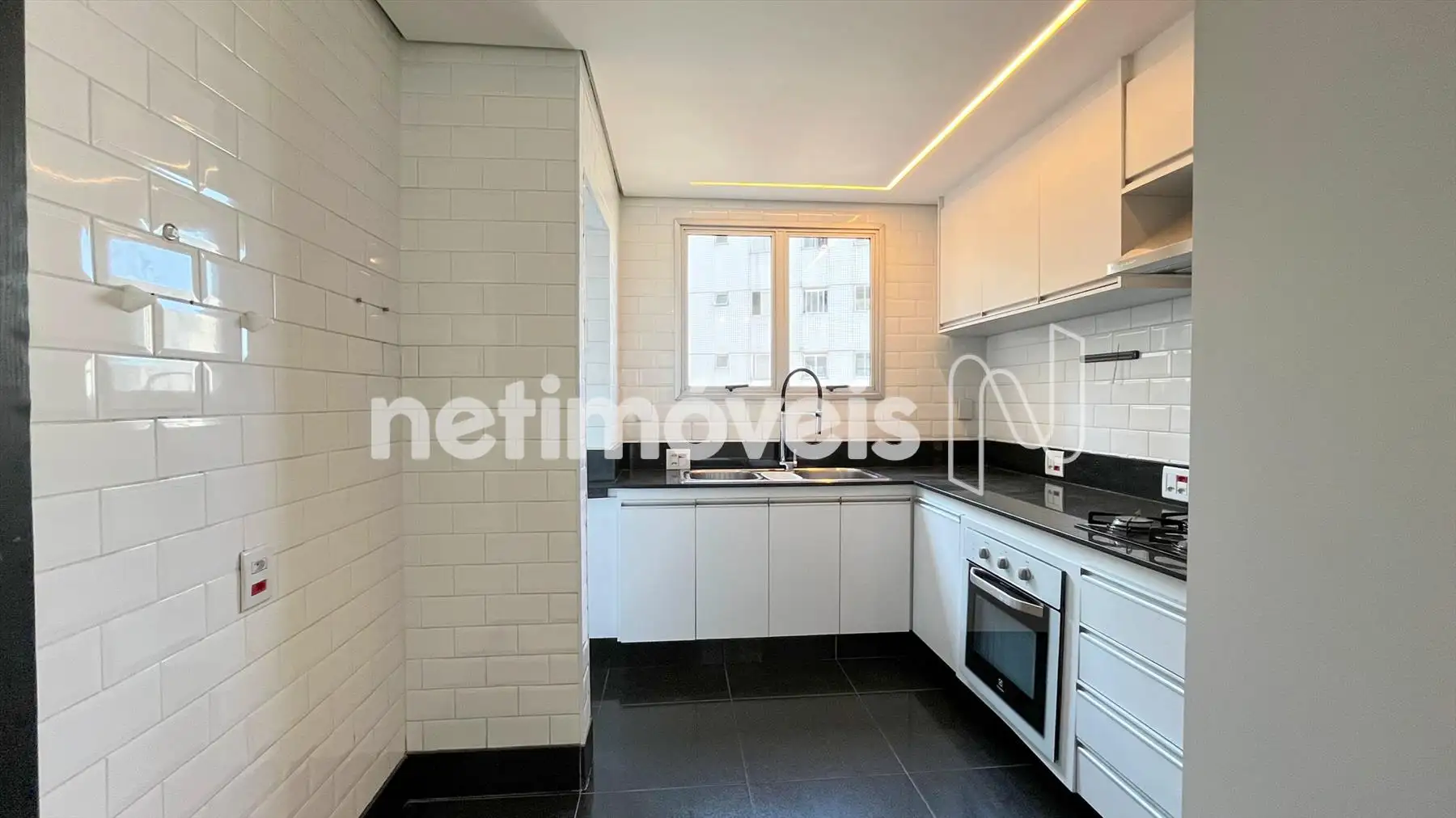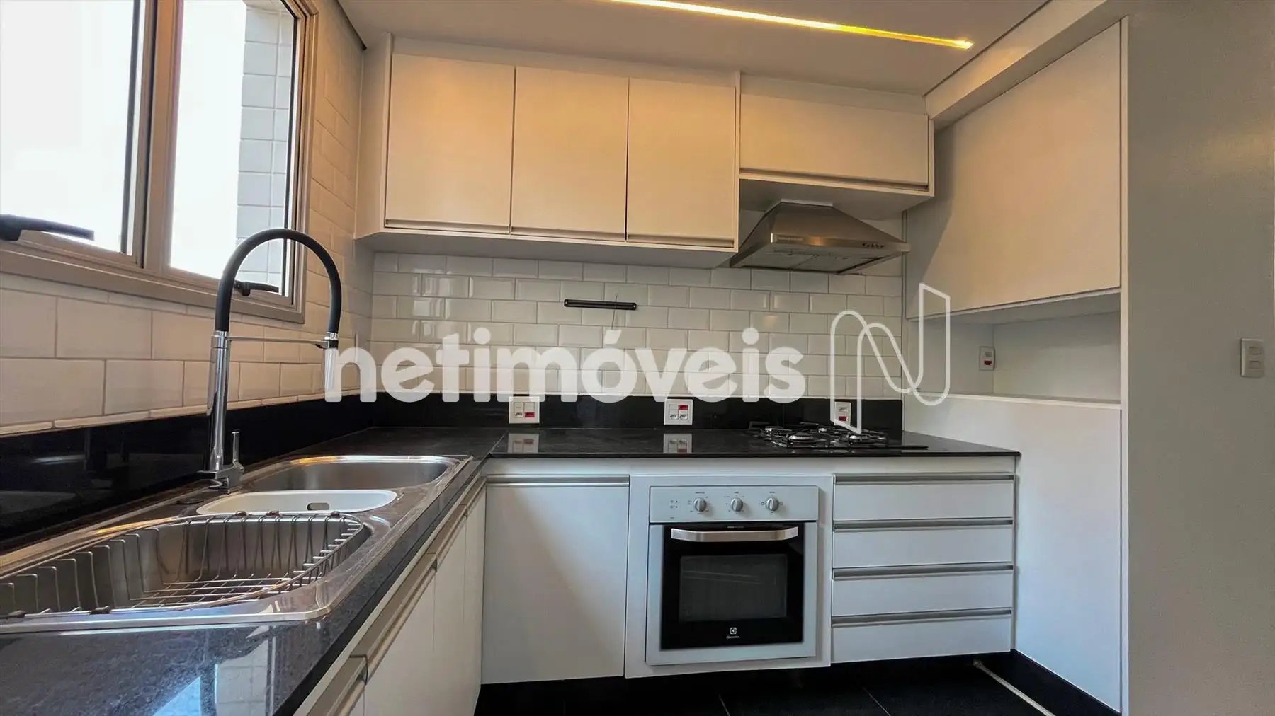 Cozinha moderna, com bancadas e piso em granito, armários planejados e coifa.