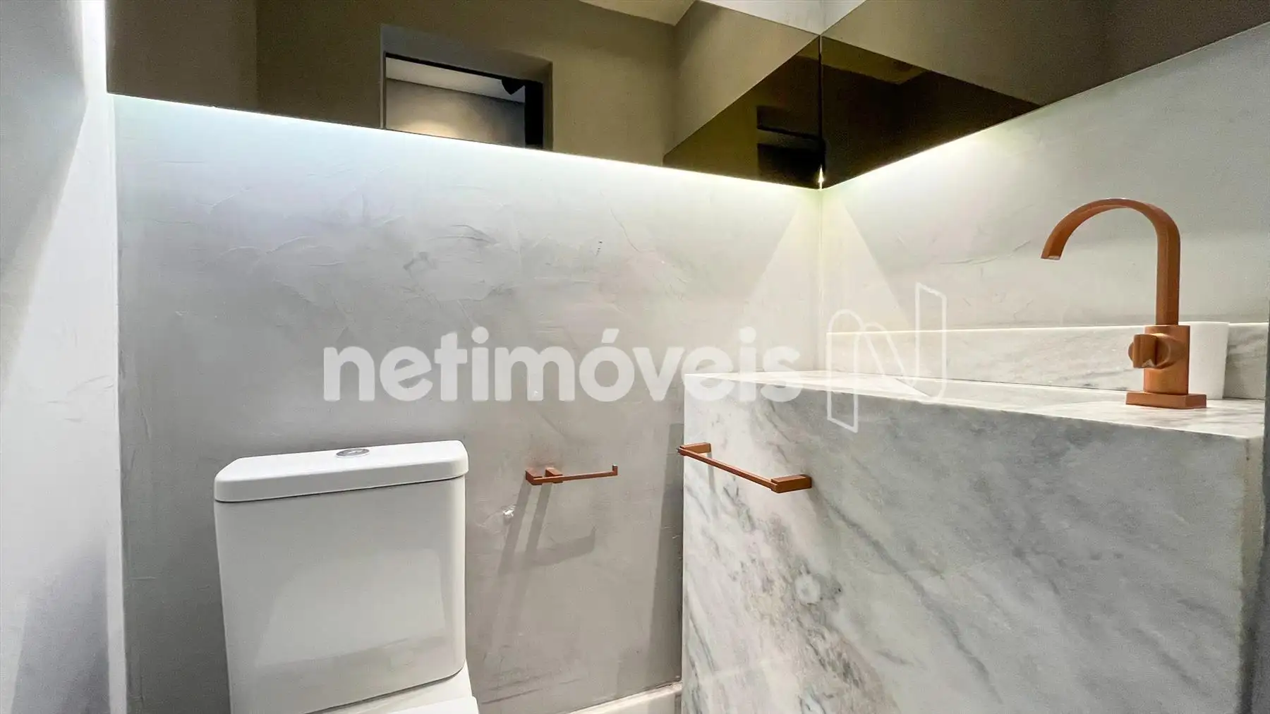 Lavabo sofisticado, com bancada em mármore e teto rebaixado.