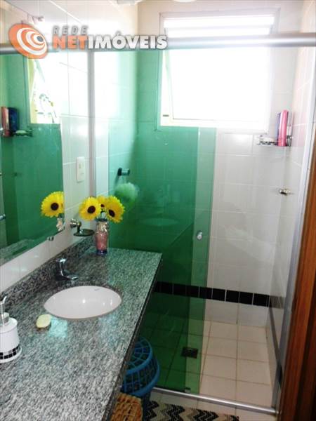 Banho social e suíte com box em vidro temperado, espelho, pia em granito e piso em cerâmica