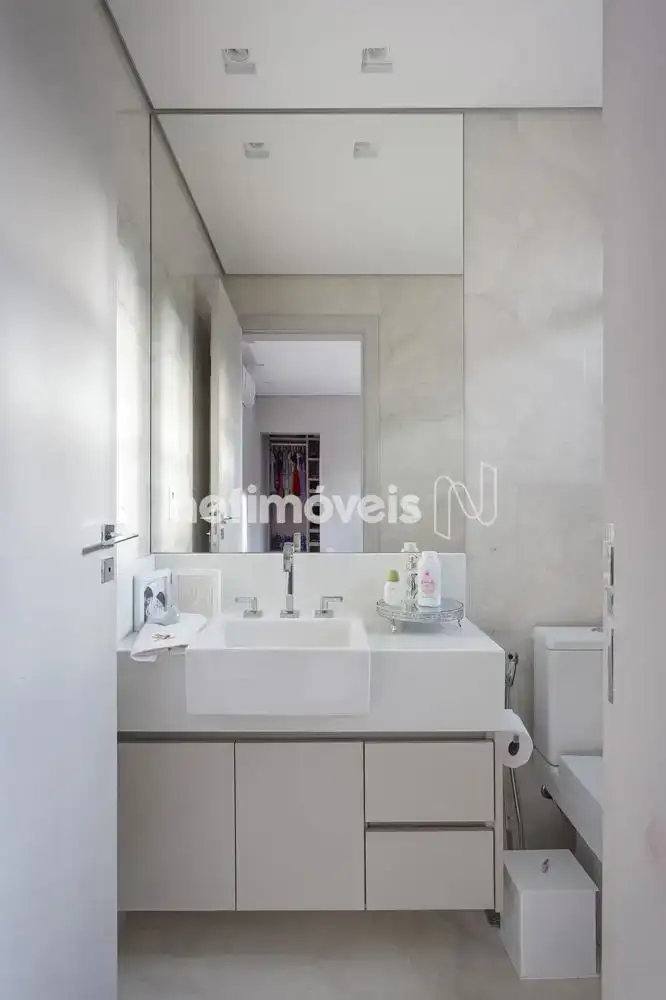 - Revestimento em porcelanato de grande formato, bancada em nanoglass no lavabo.