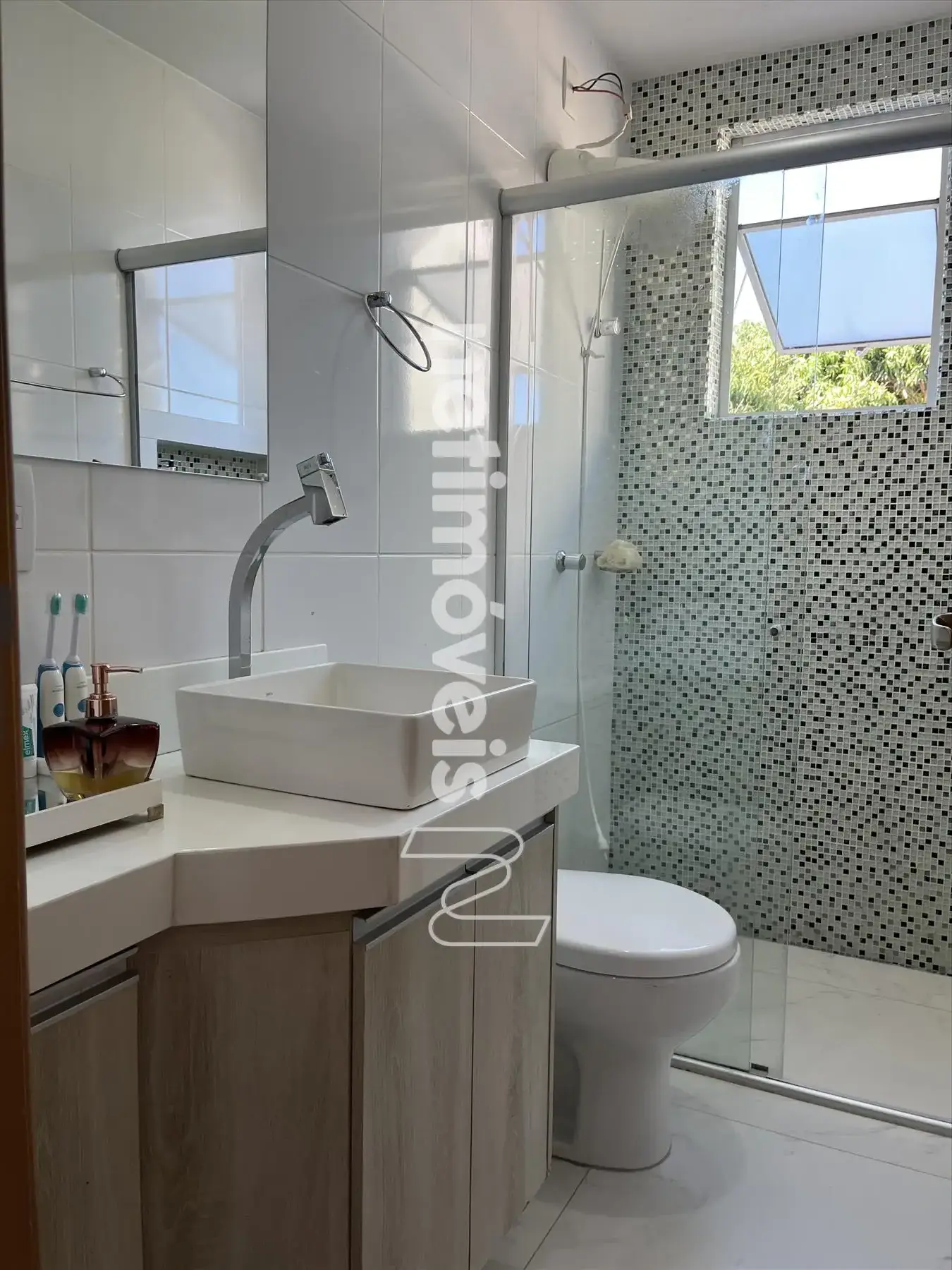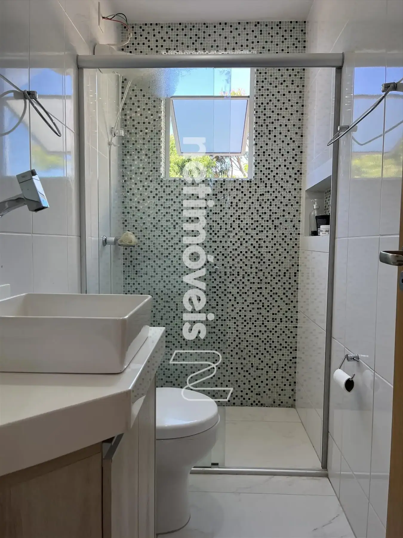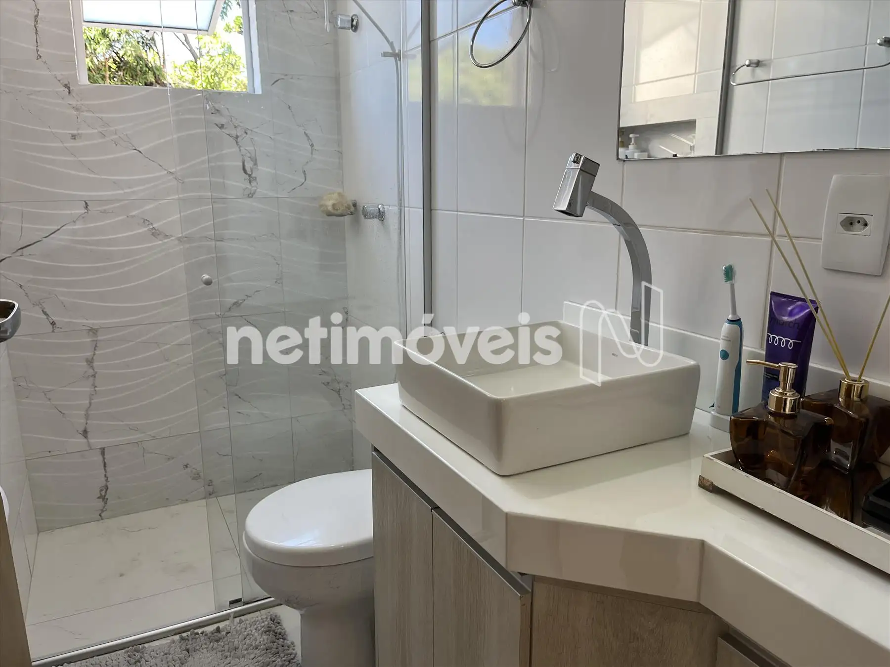 Banheiros da suíte e social com nicho, box, espelho, bancada em Nanoglass com bojo suspenso e armários sobe as bancadas;