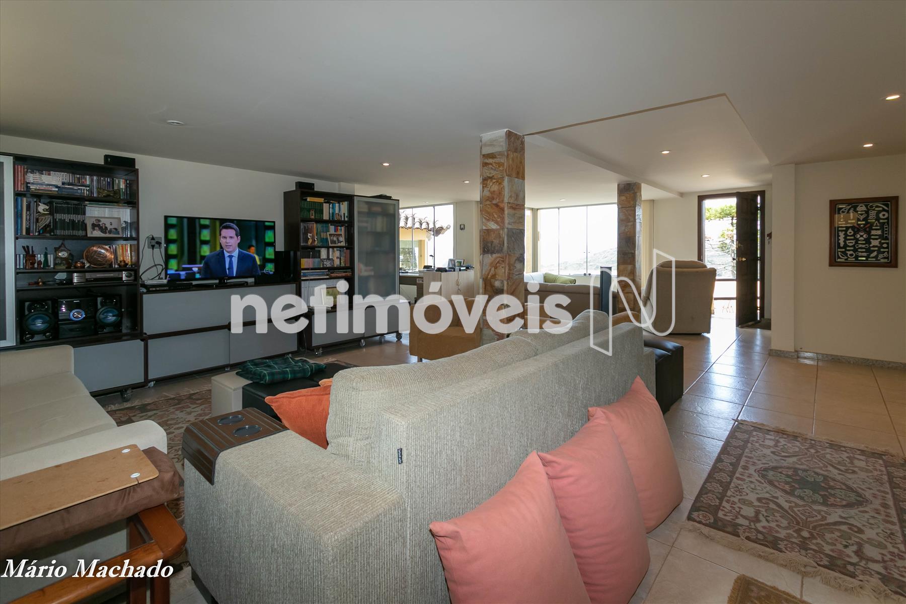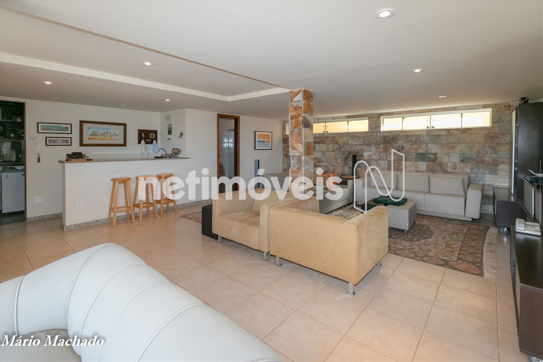 Salão amplo com escritório e adega com bar.
