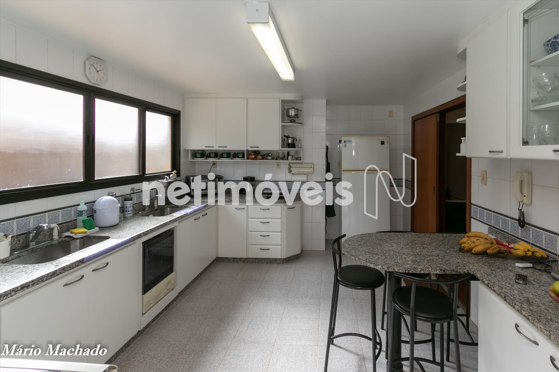 Cozinha ampla com armários, bancada para lanches em granito. Lavanderia.