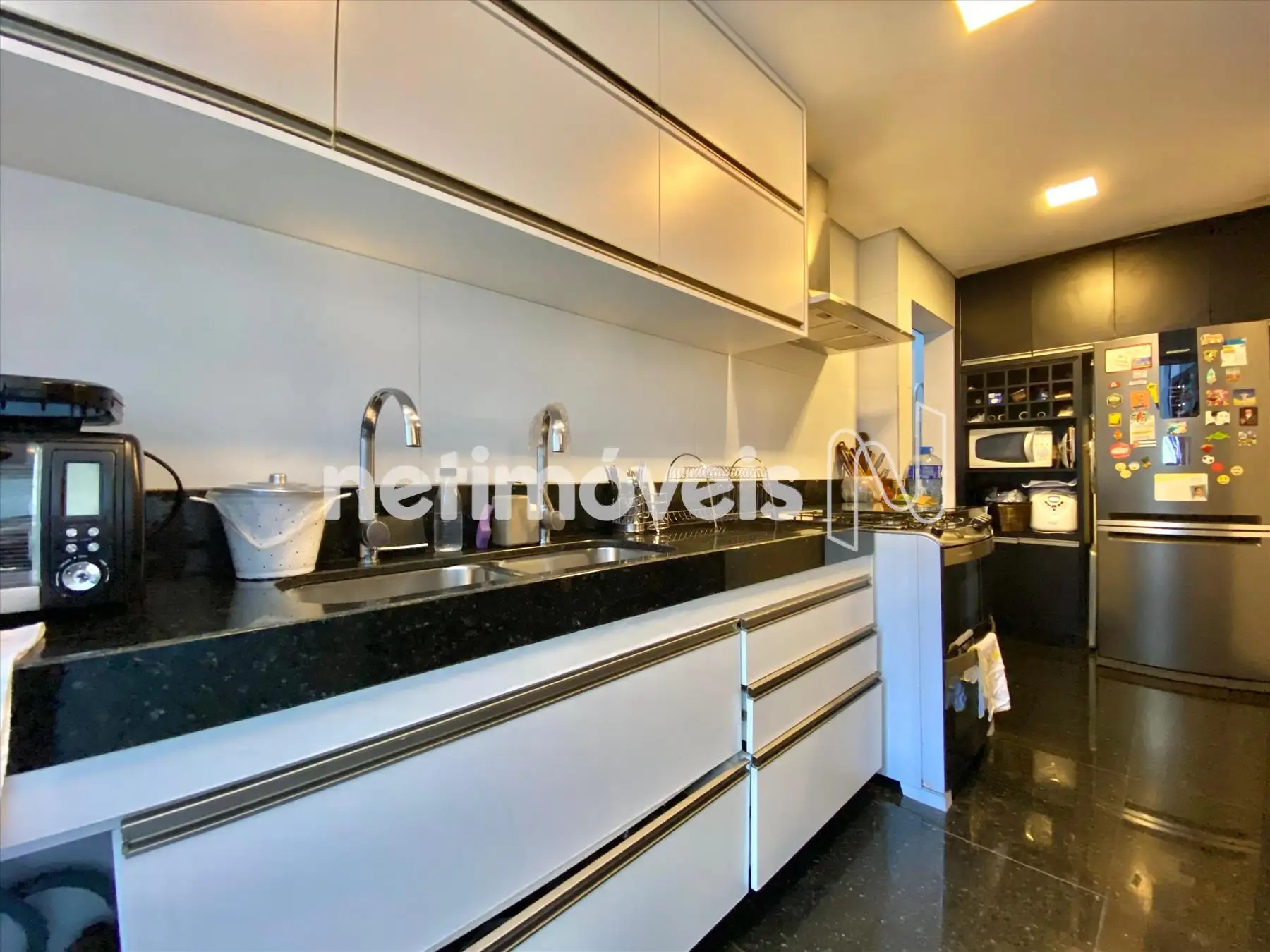 Copa funcional e cozinha planejada com armários, bancada e piso em granito.