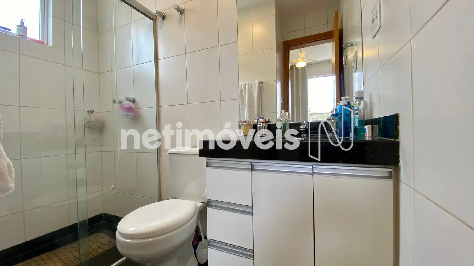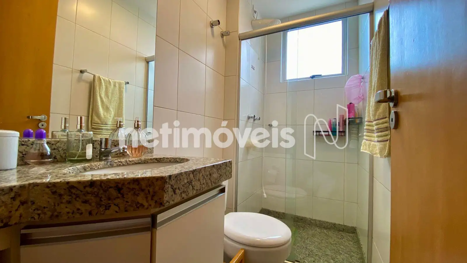 - Banho social com armário com armário planejado e box em vidro blindex, piso e bancada em granito.
