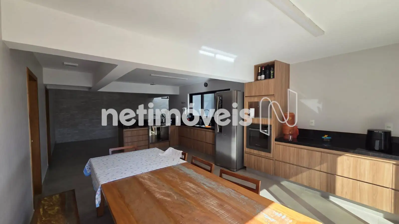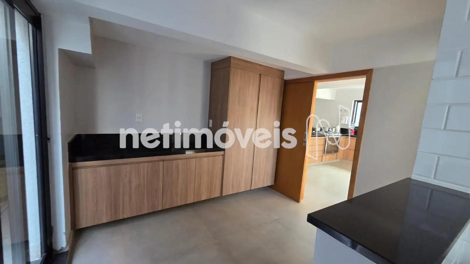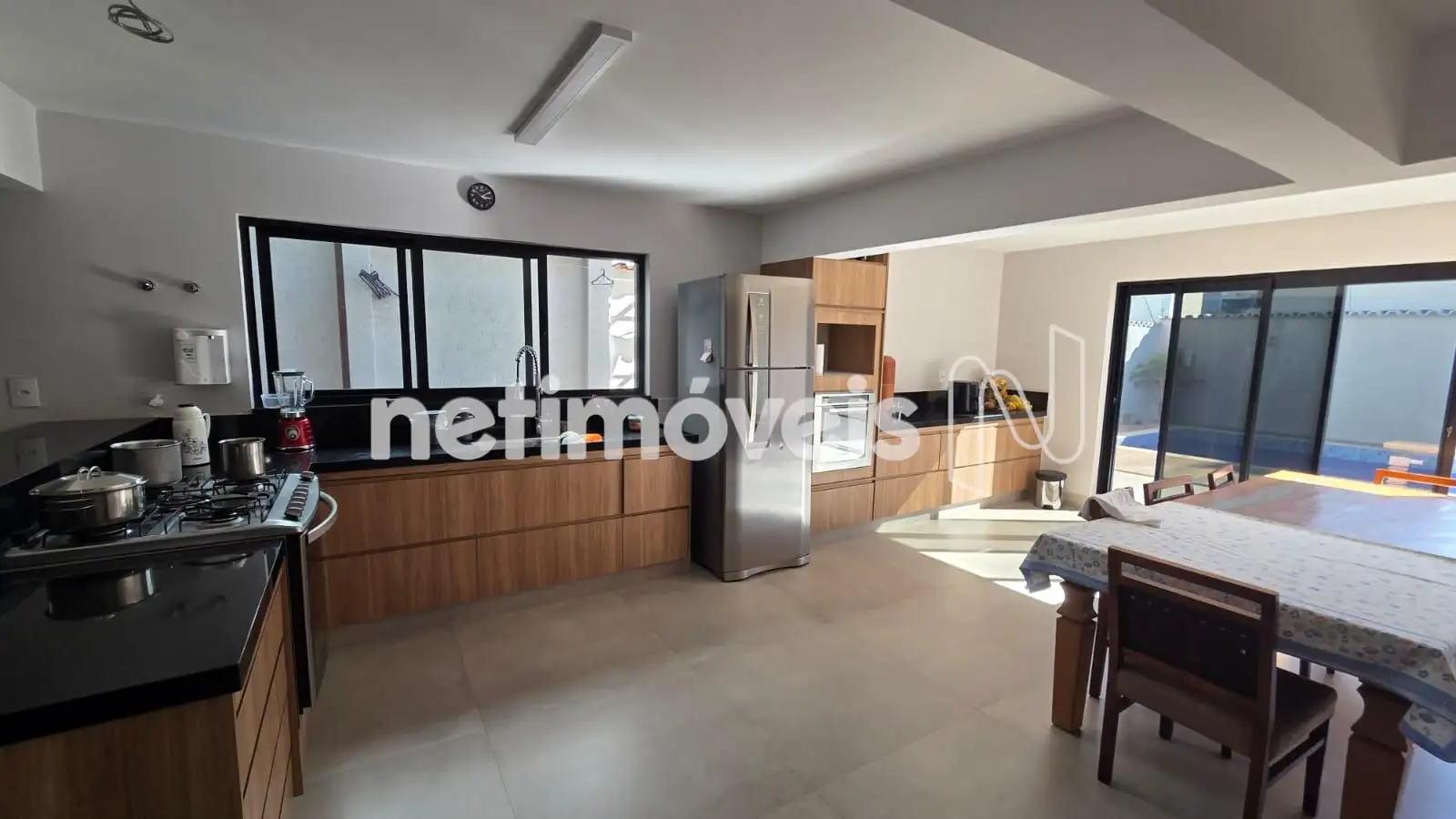 - Cozinha com armários, piso porcelanato e bancadas em granito, integrada com a piscina e espaço gourmet