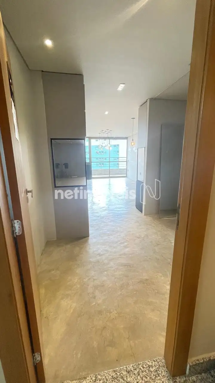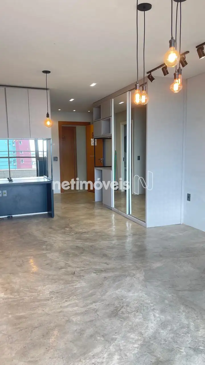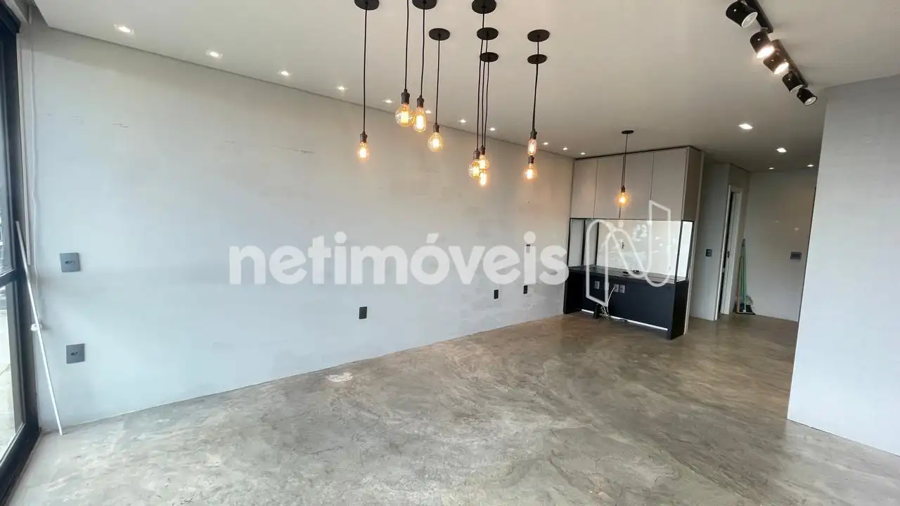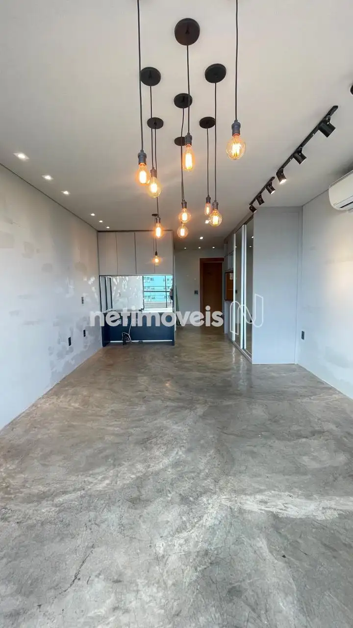 Sala com ar-condicionado, armário planejado e varanda incorporada com vista privilegiada. Piso em cimento queimado. Sala possui janelas com venezianas e esquadrias de alumínio