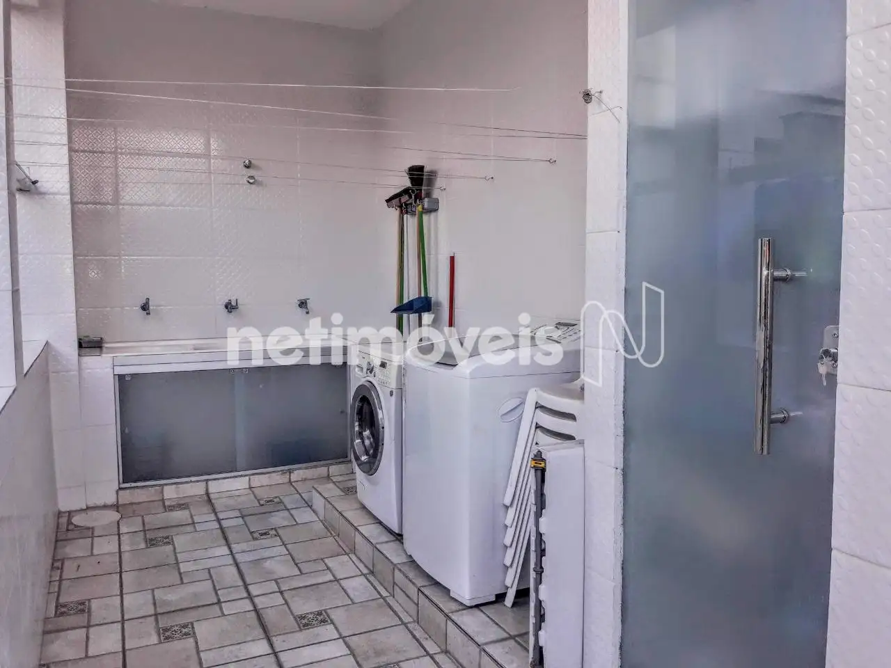 - Lavanderia coberta com armário sob a pia e prateleiras.