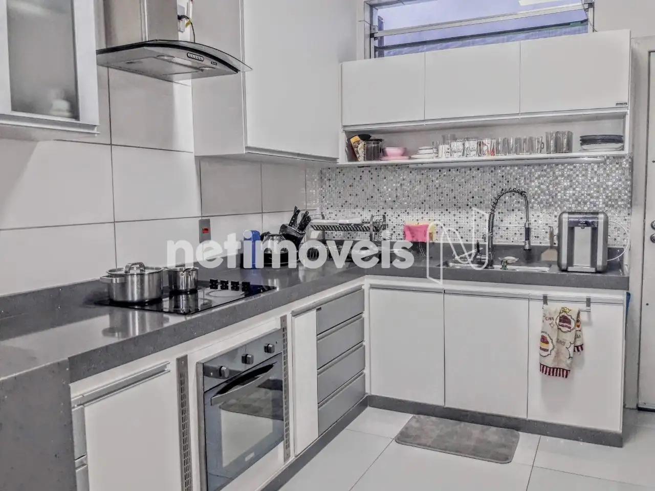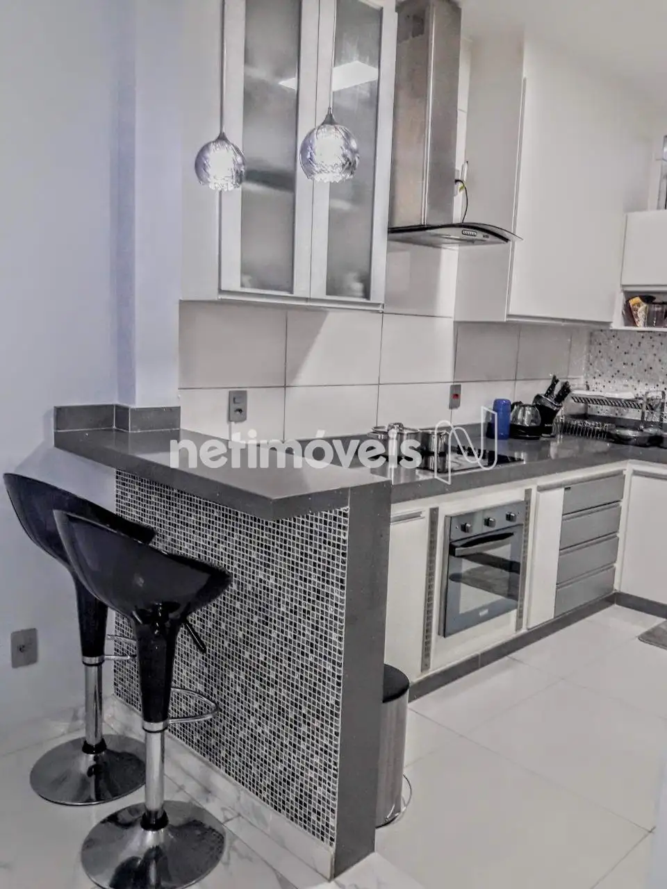 - Cozinha americana com pia e bancada em granito, cooktop, forno elétrico, coifa em inox e armários planejados; piso em porcelanato com aquecimento solar nas torneiras.