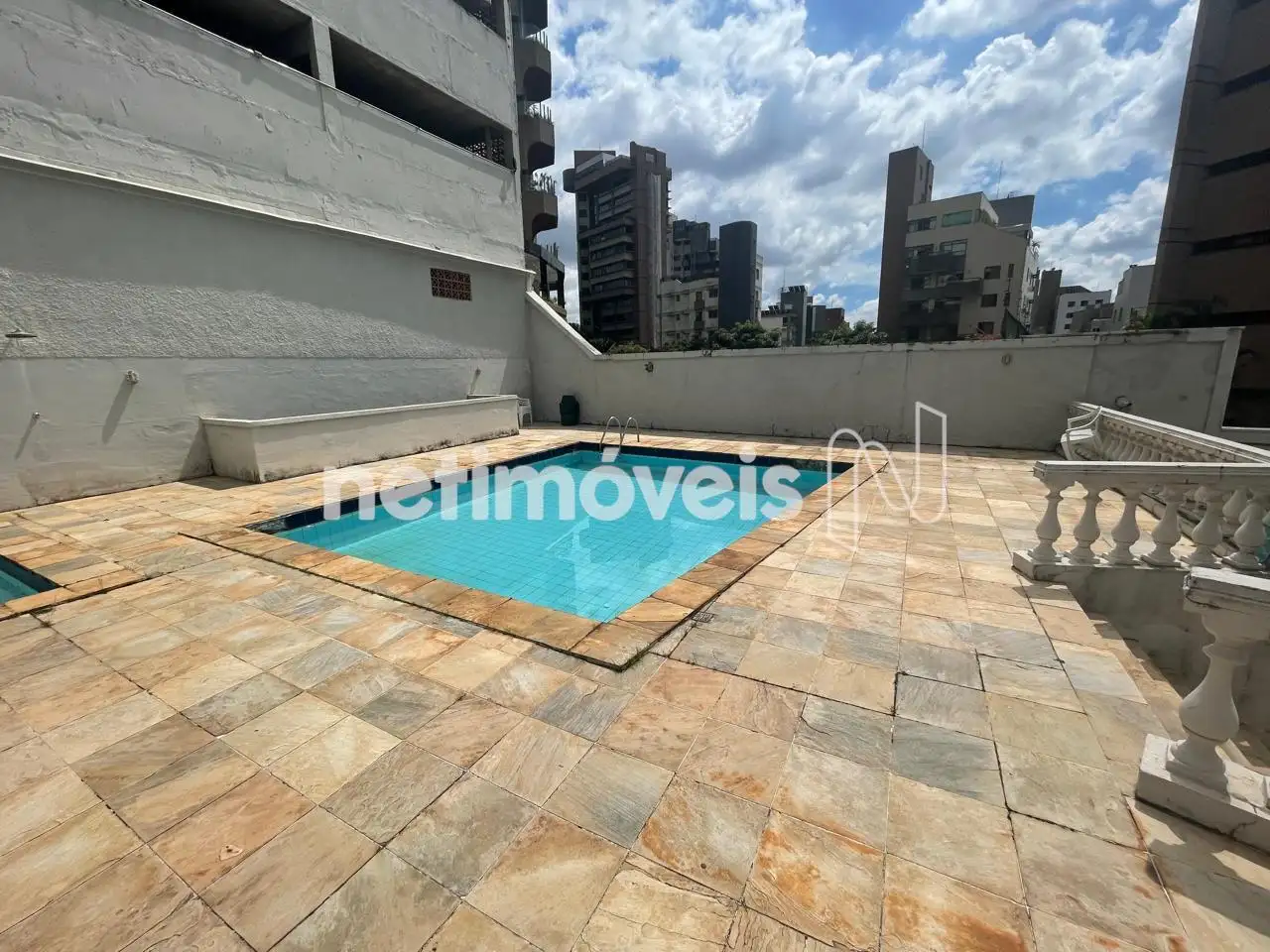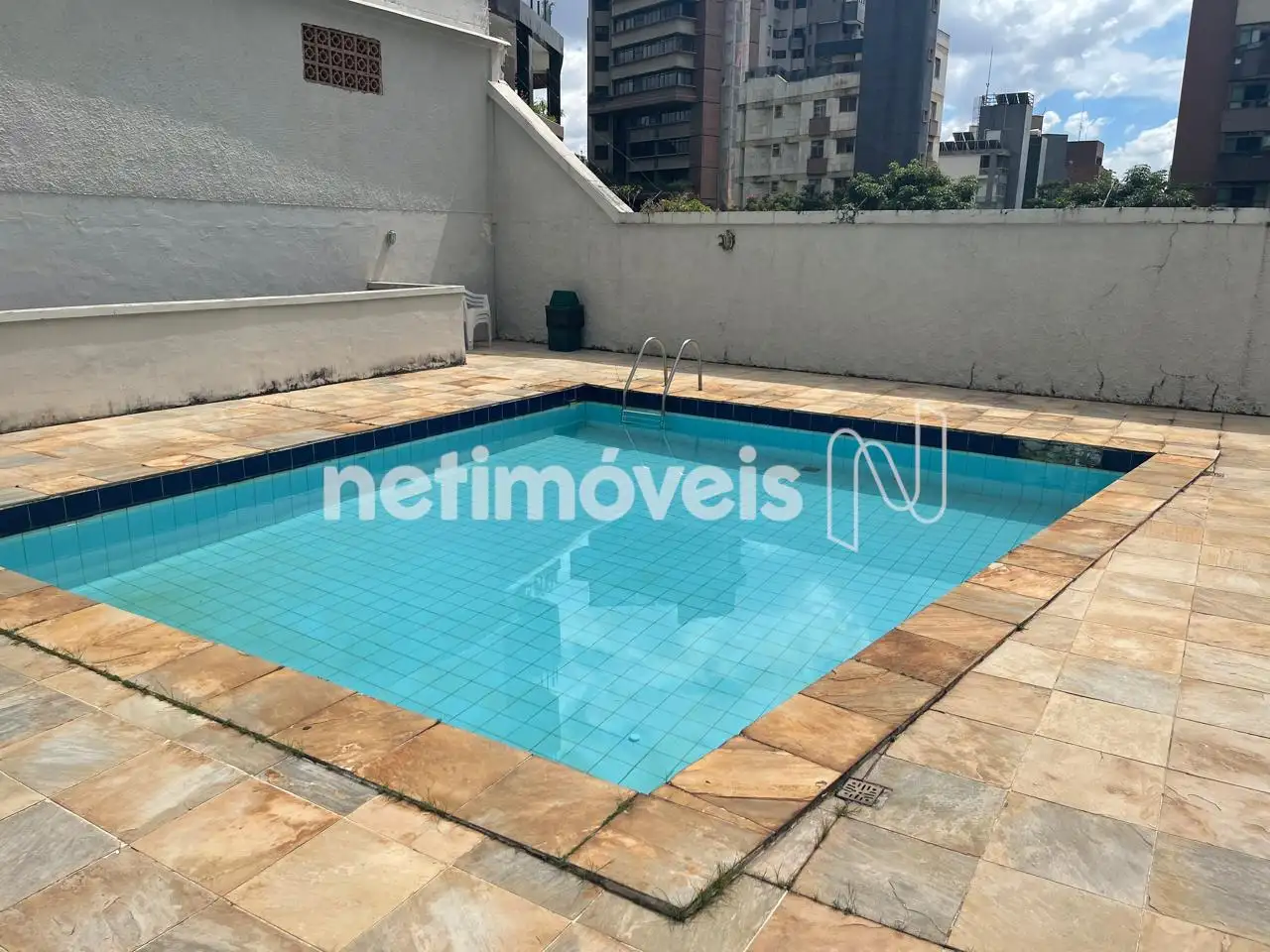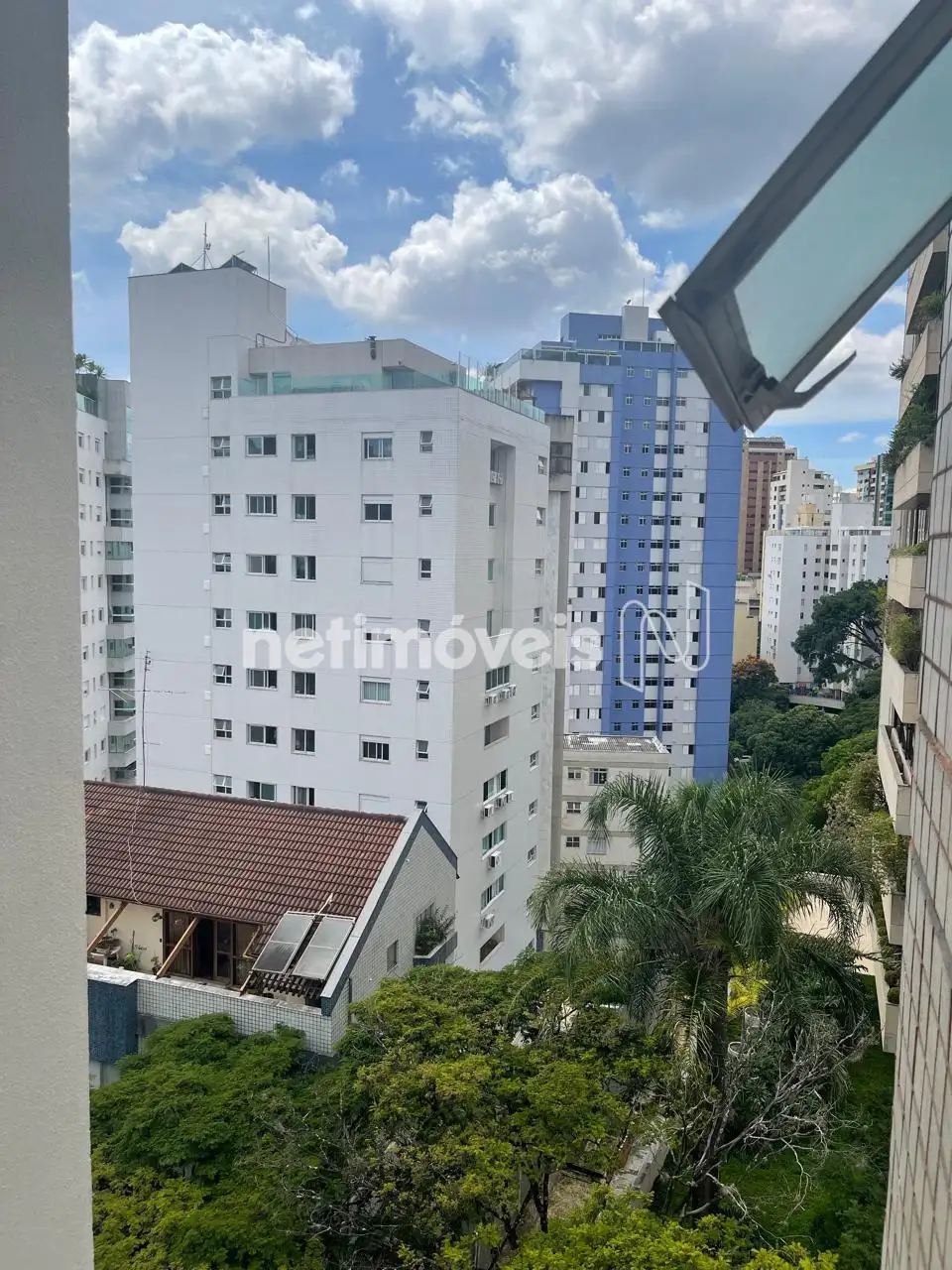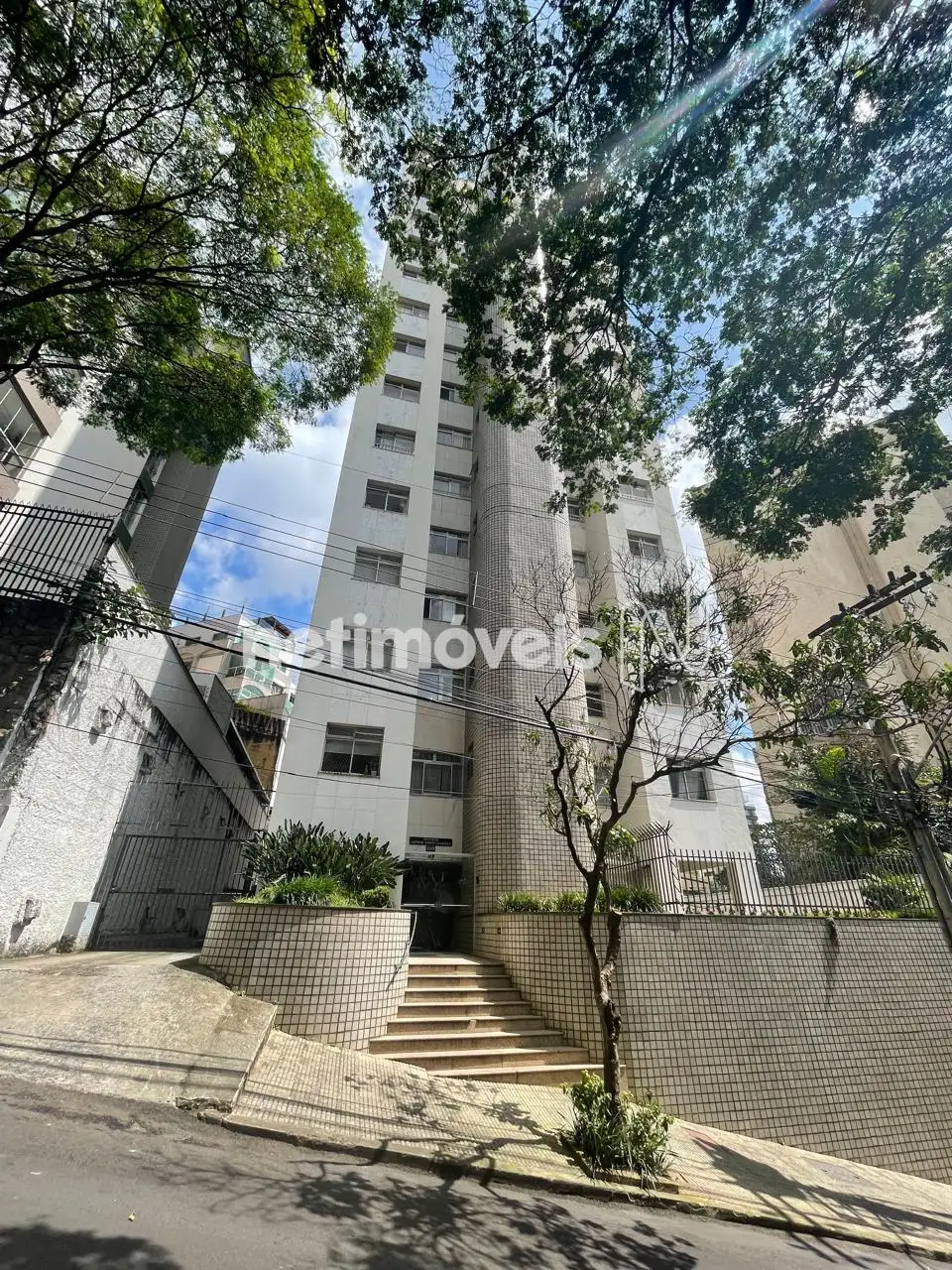 Prédio com fachada revestida, a meia quadra da avenida bandeirantes.