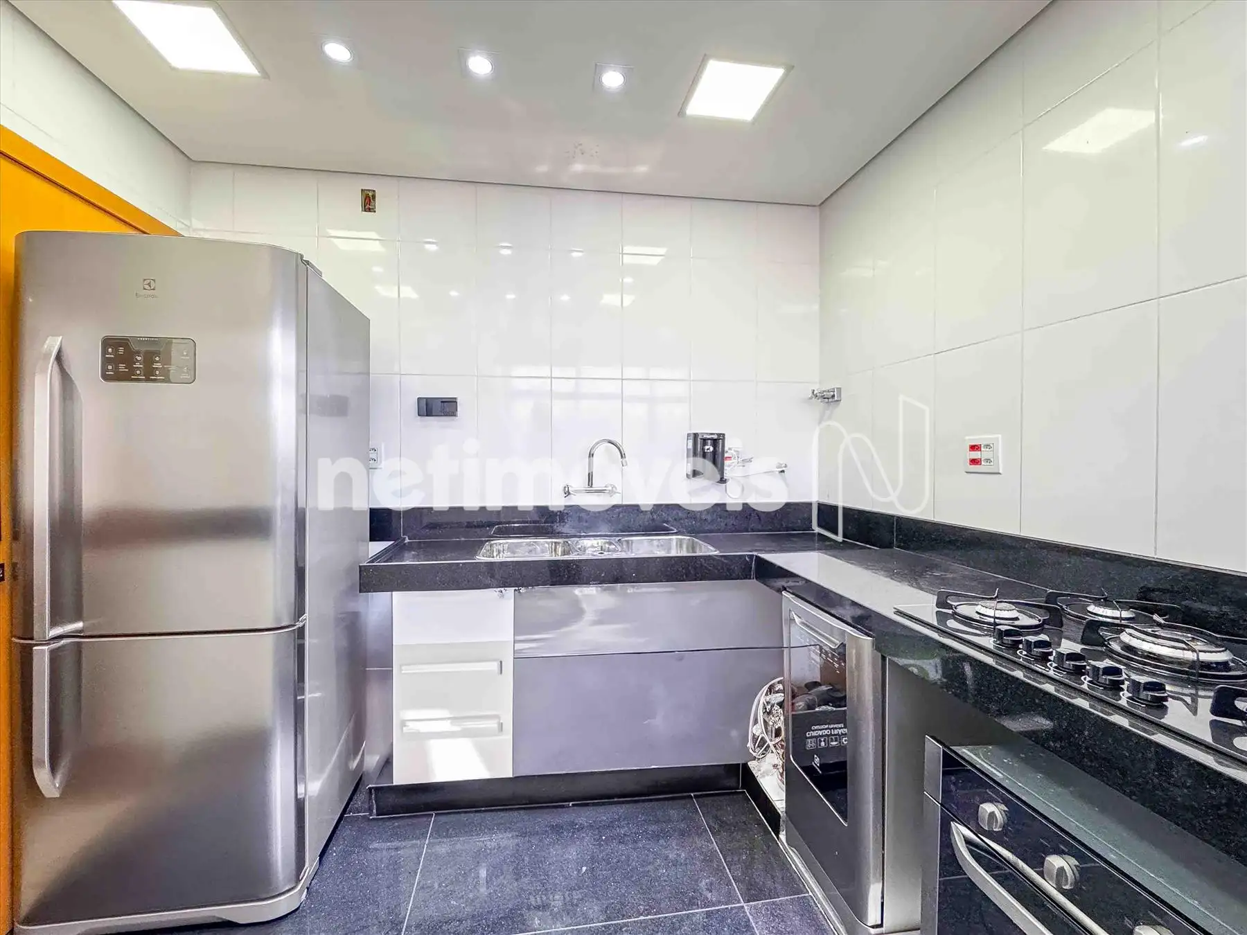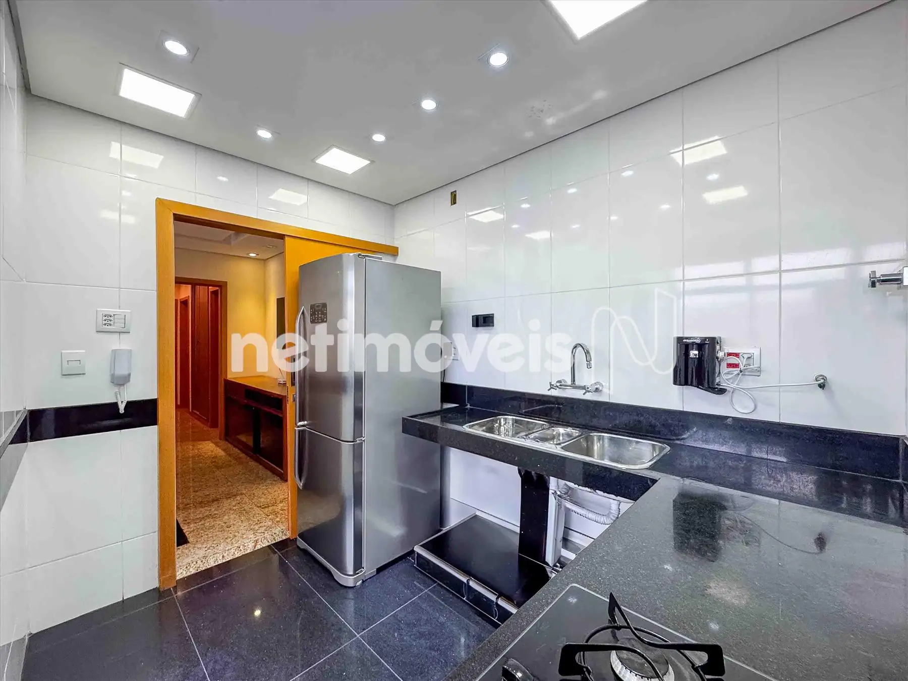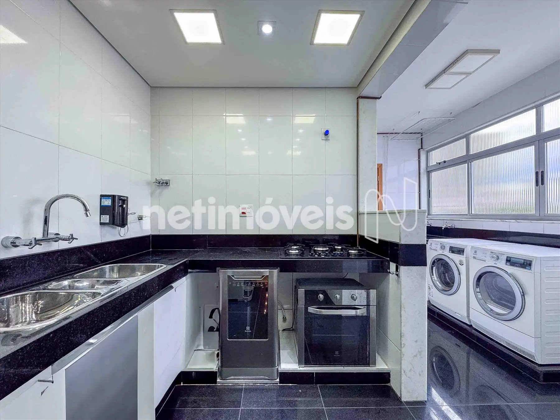 - Cozinha reformada com Bojo Triplo em Inox, piso em granito preto, bancada em granito preto;