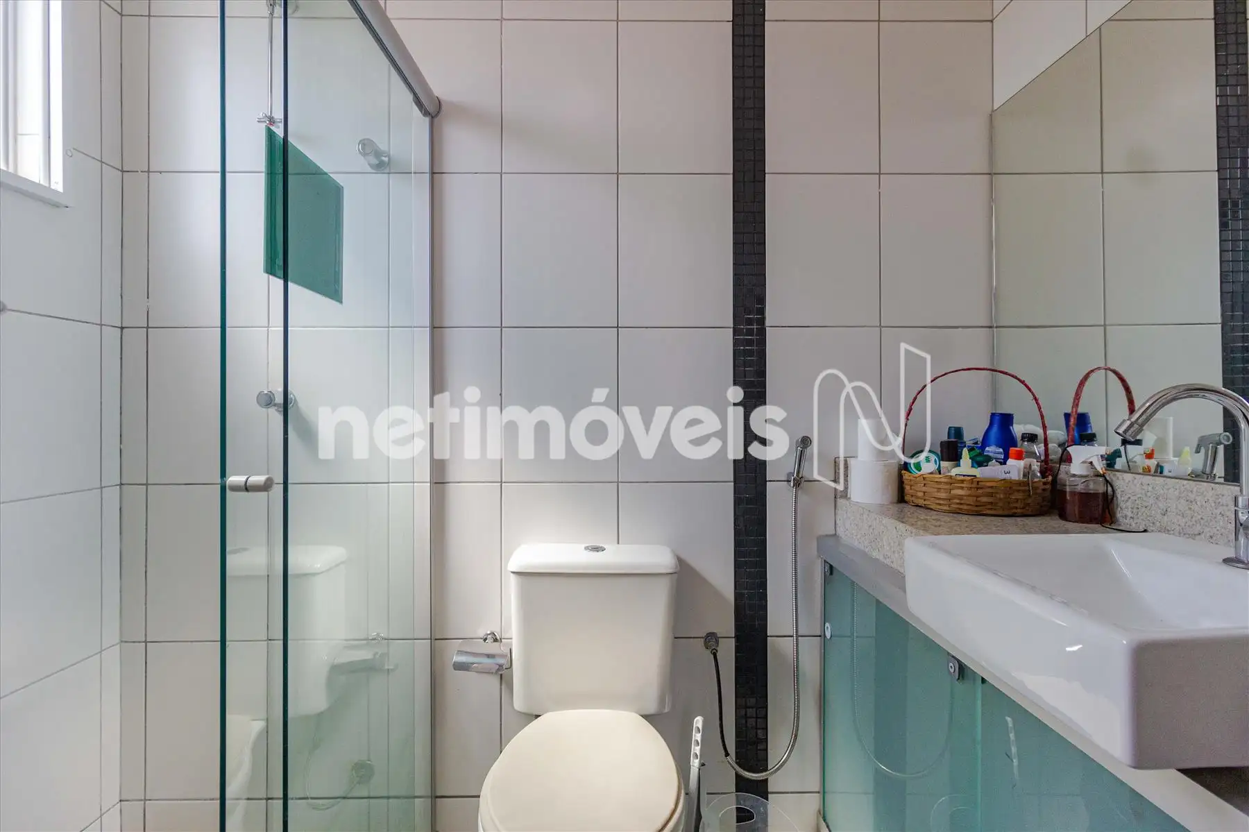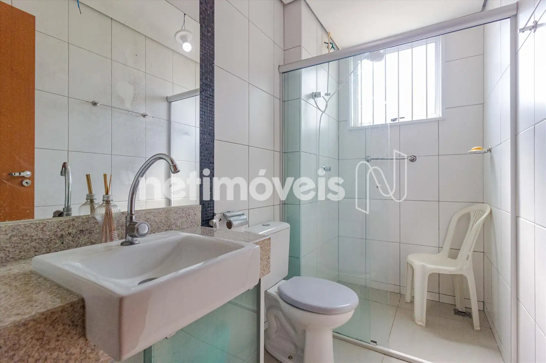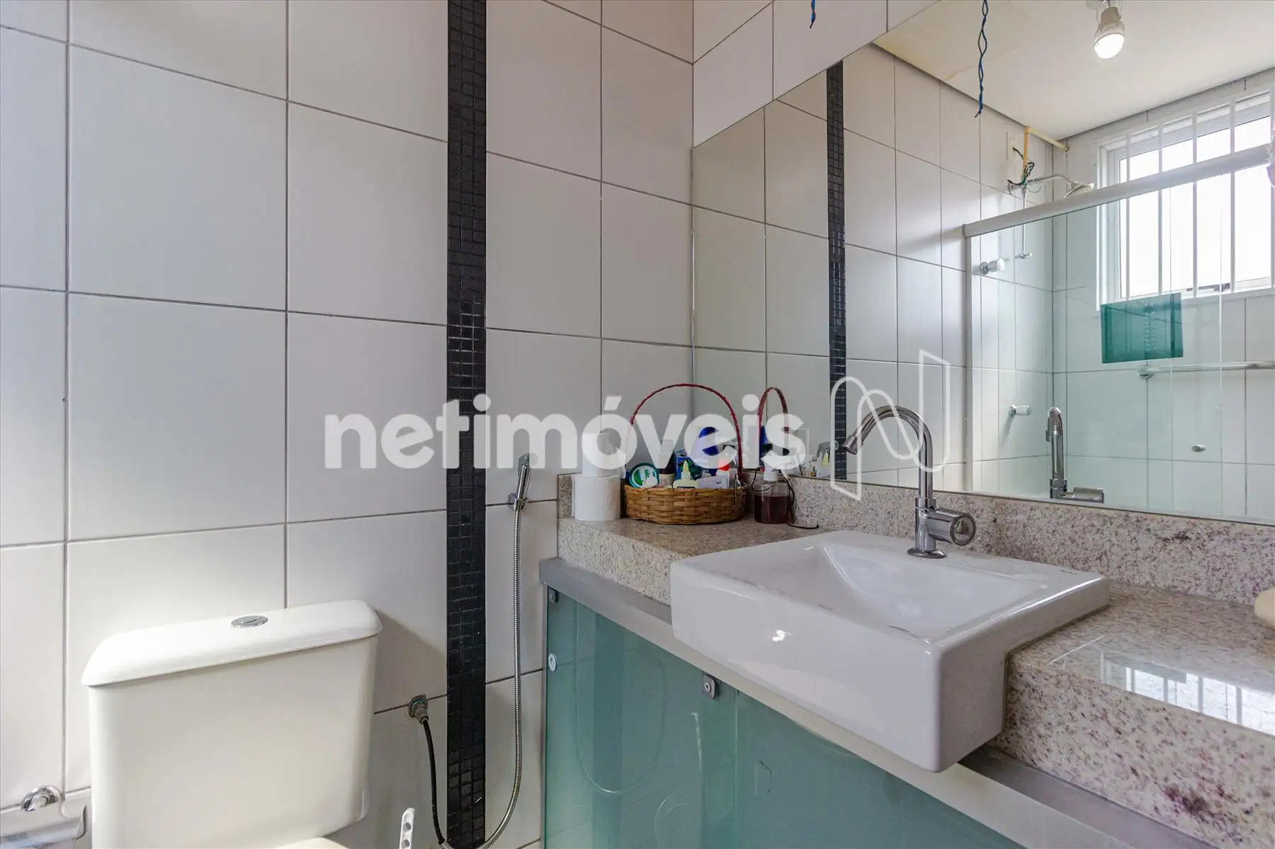 * Banhos social e suite com bancada em granito, piso porcelanato, armários e box blindex;