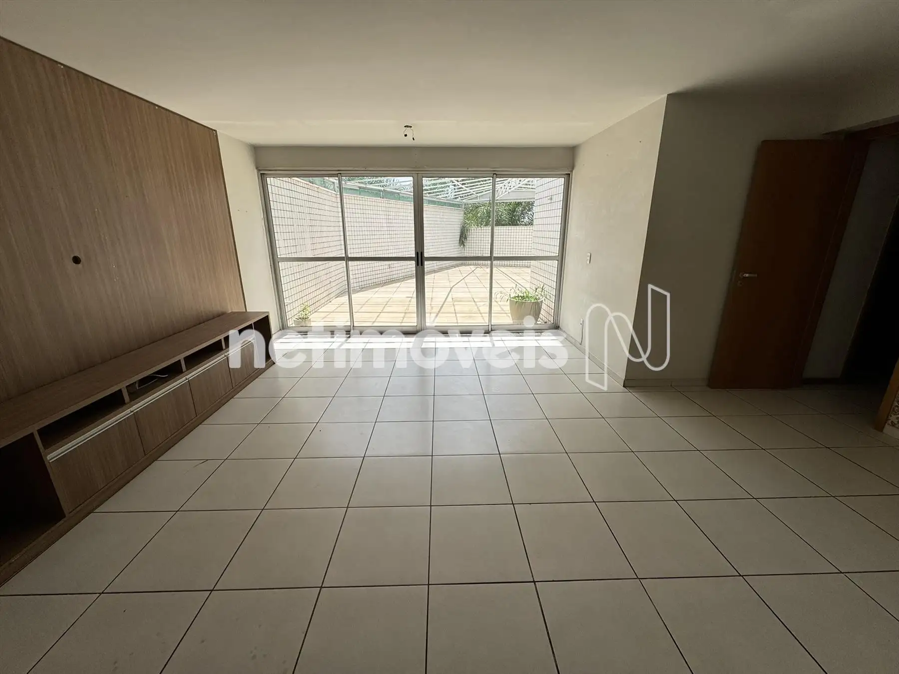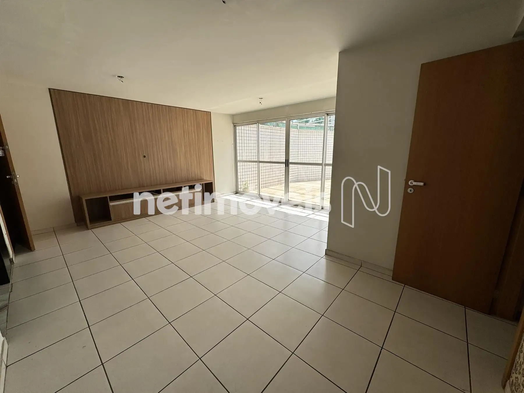Sala com painel de TV planejado incorporada a área privativa, com piso em porcelanato.