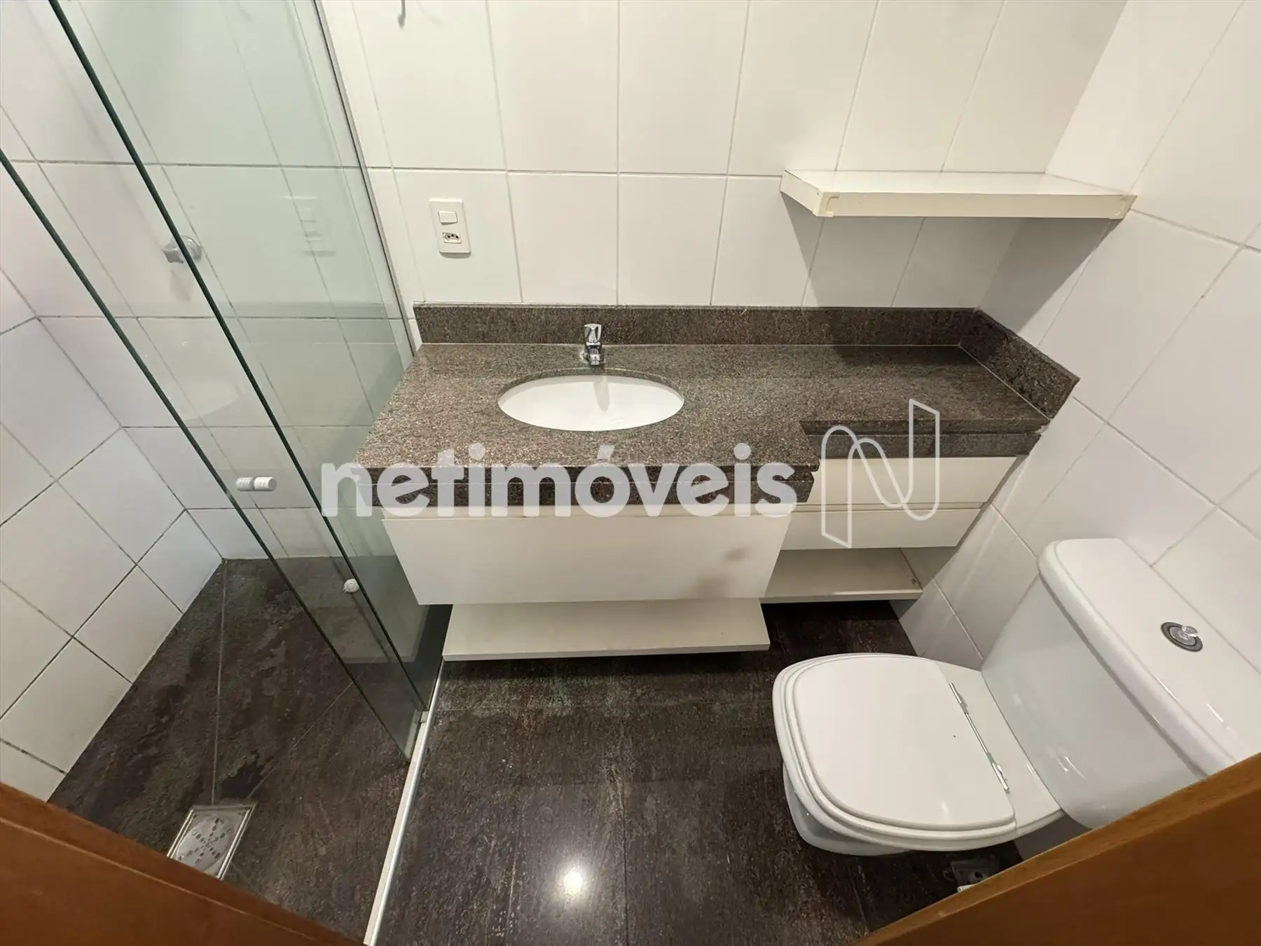 Banho suíte e social com armários, box blindex, piso e bancada em granito.