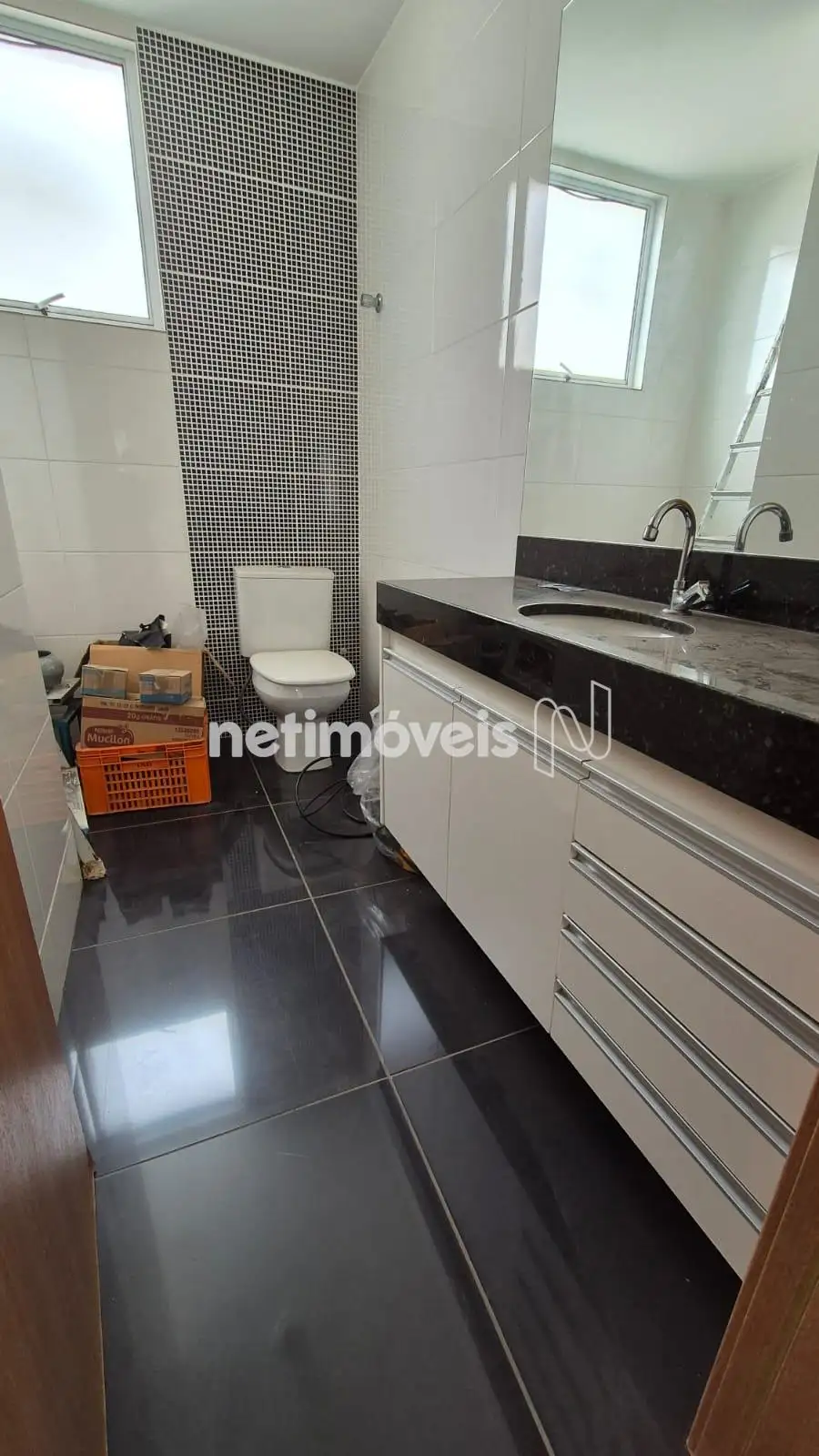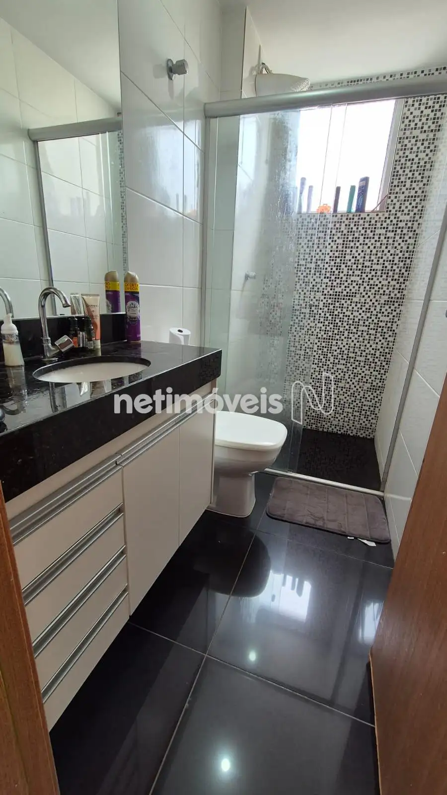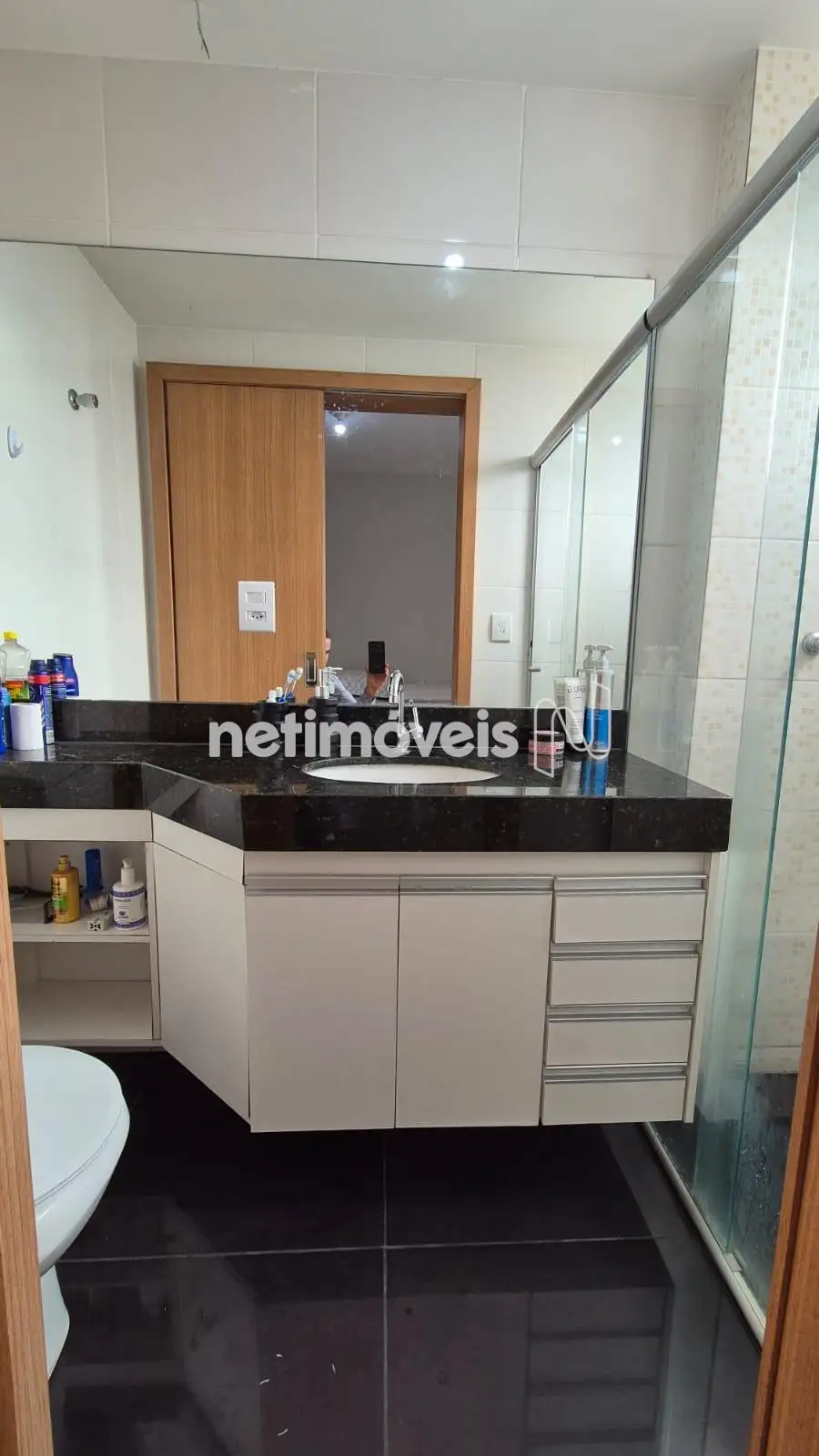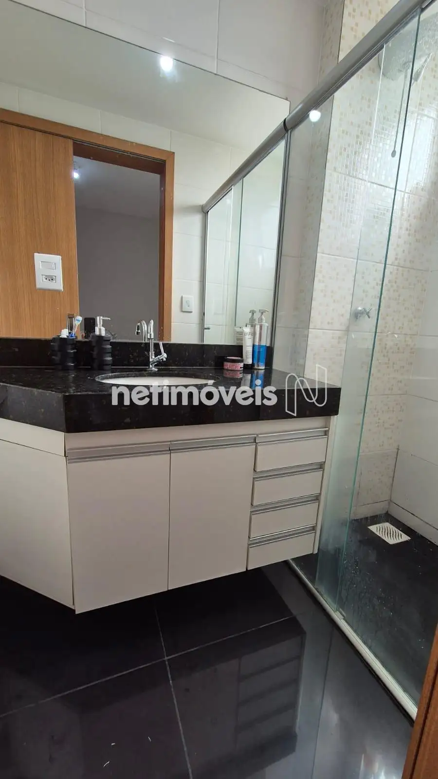 Banhos ( Suíte e Social ) piso em porcelanato, bancada em granito , armário, box em blindex,