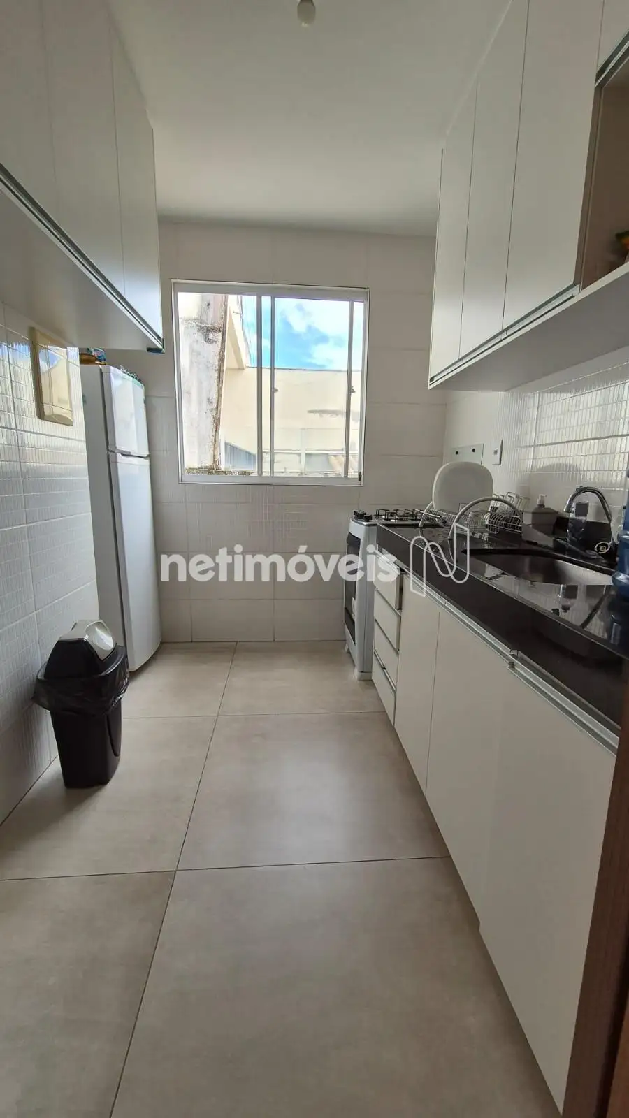 Cozinha, piso em porcelanato, bancada em granito com armários,