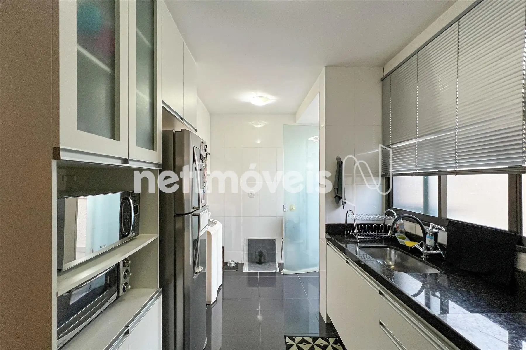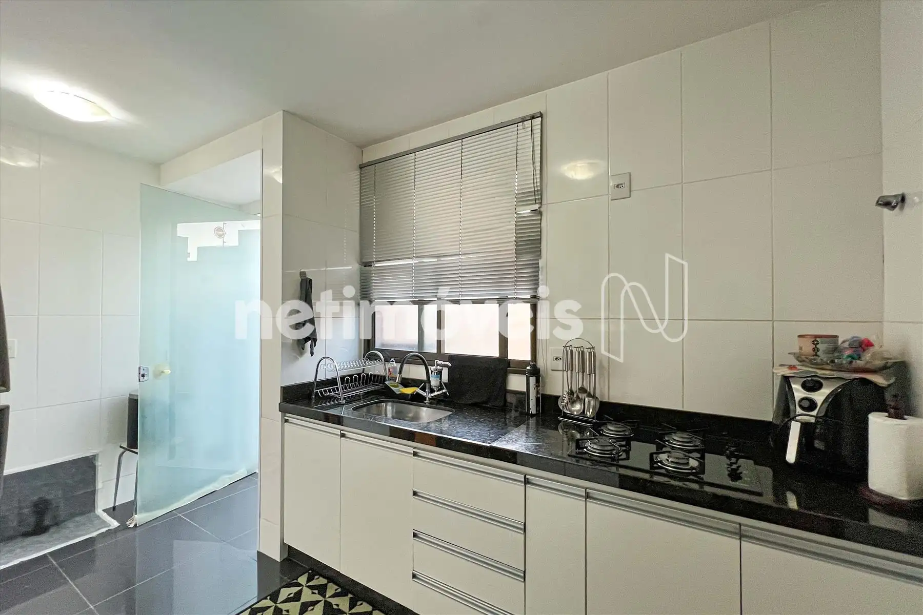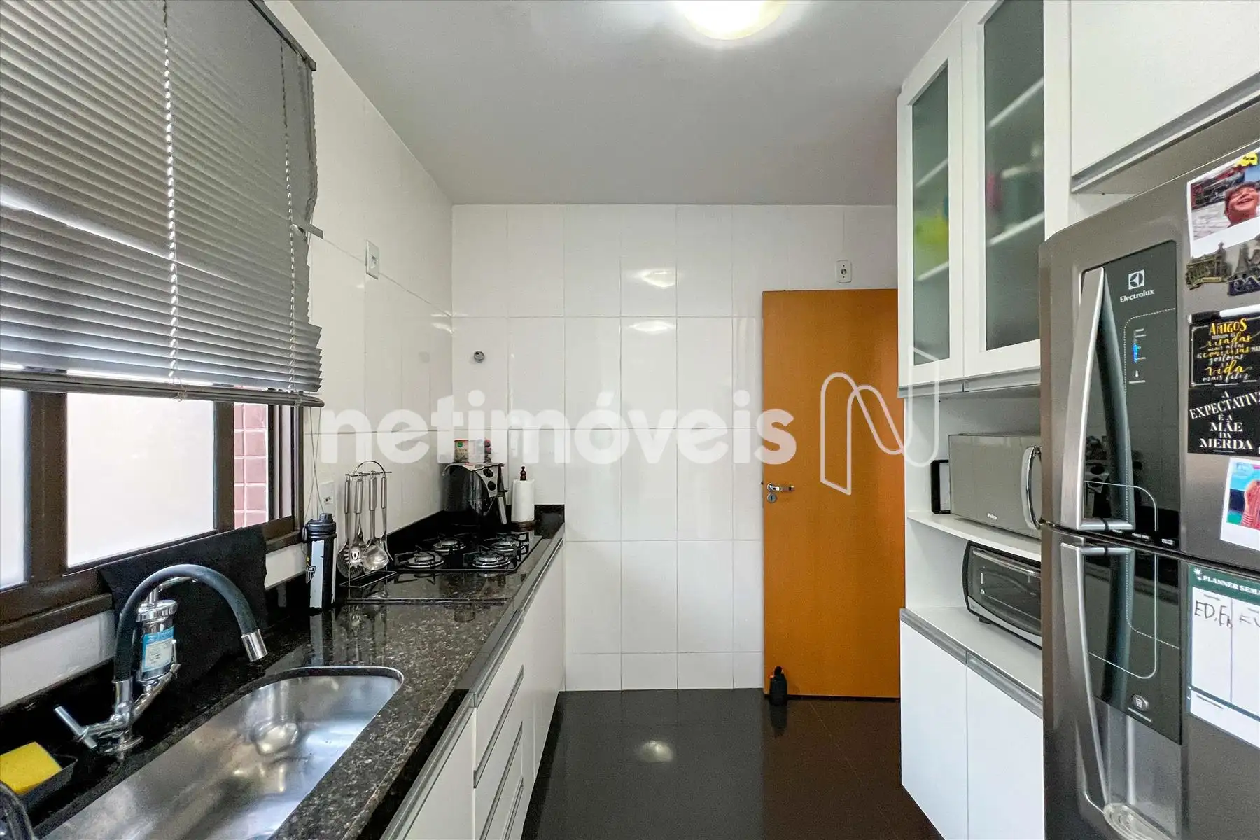 Cozinha com armários planejados, piso em granito, pia e bancada em granito;