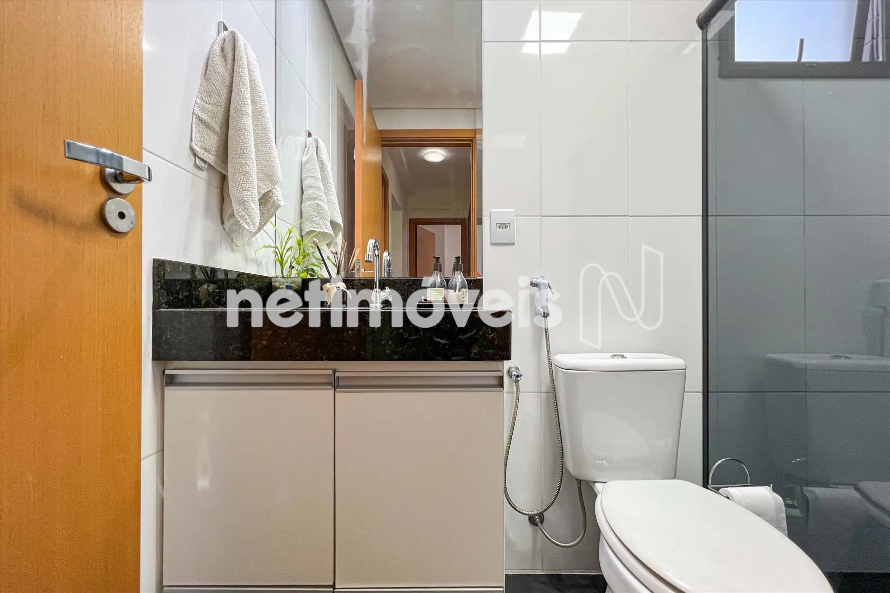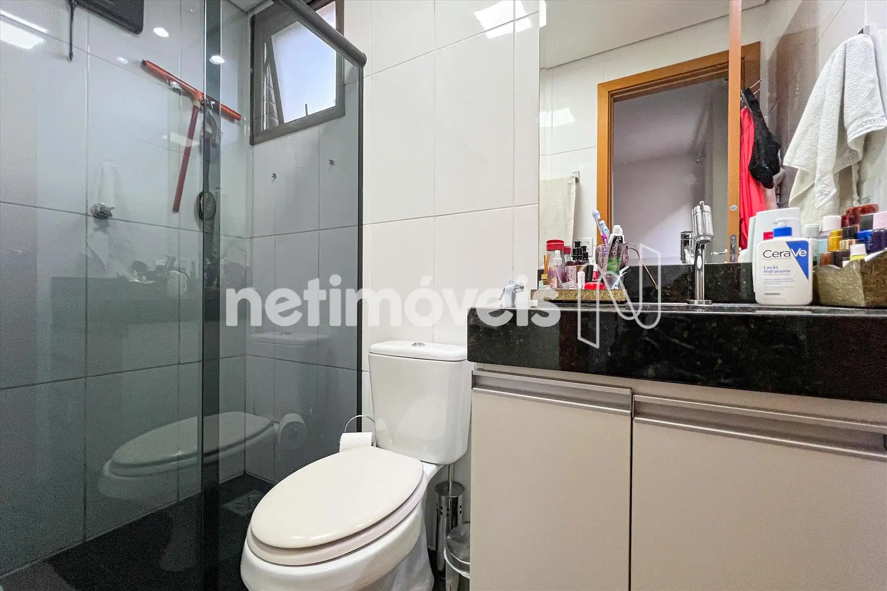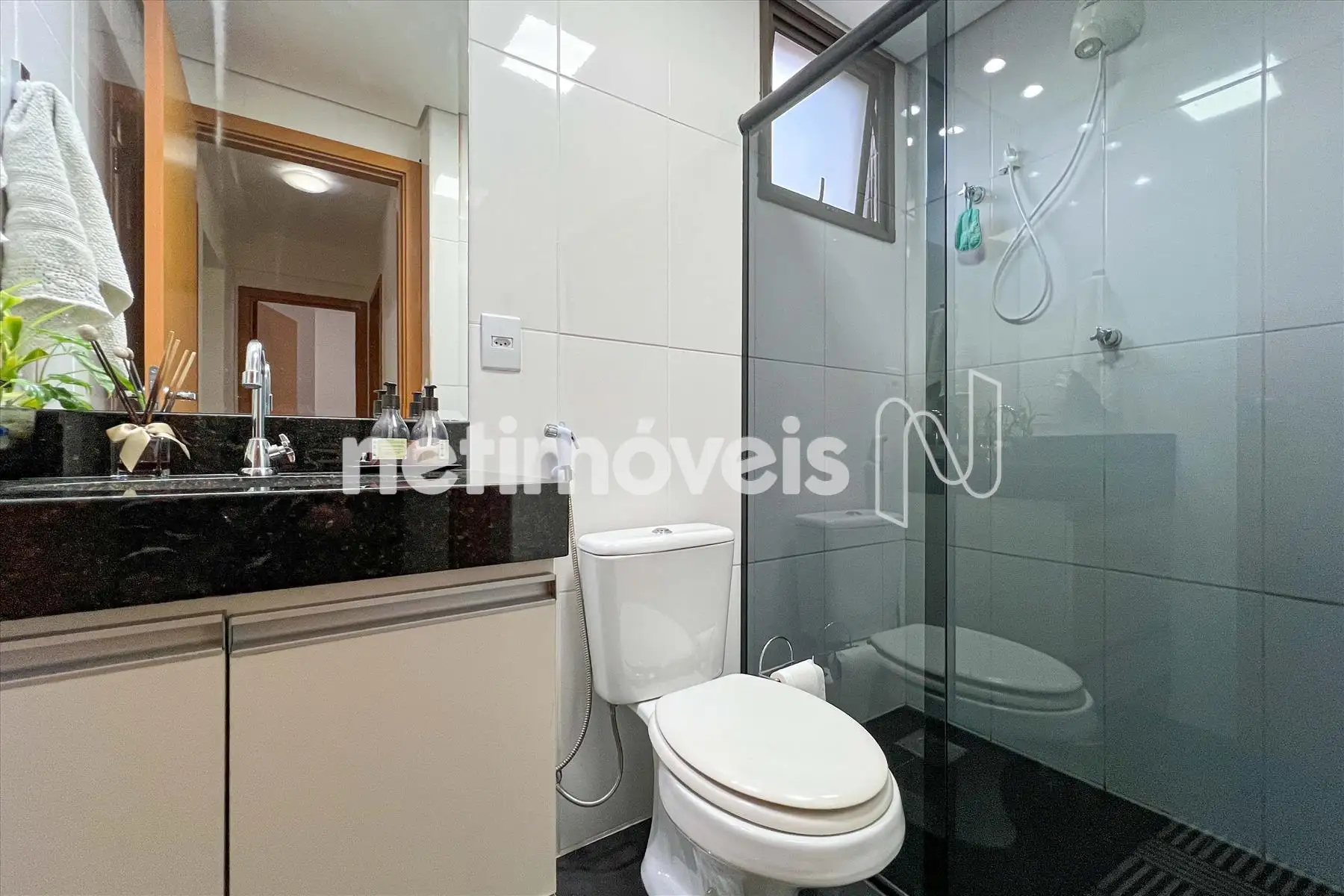 Um banho social com piso e bancada em granito, armários e box em blindex;