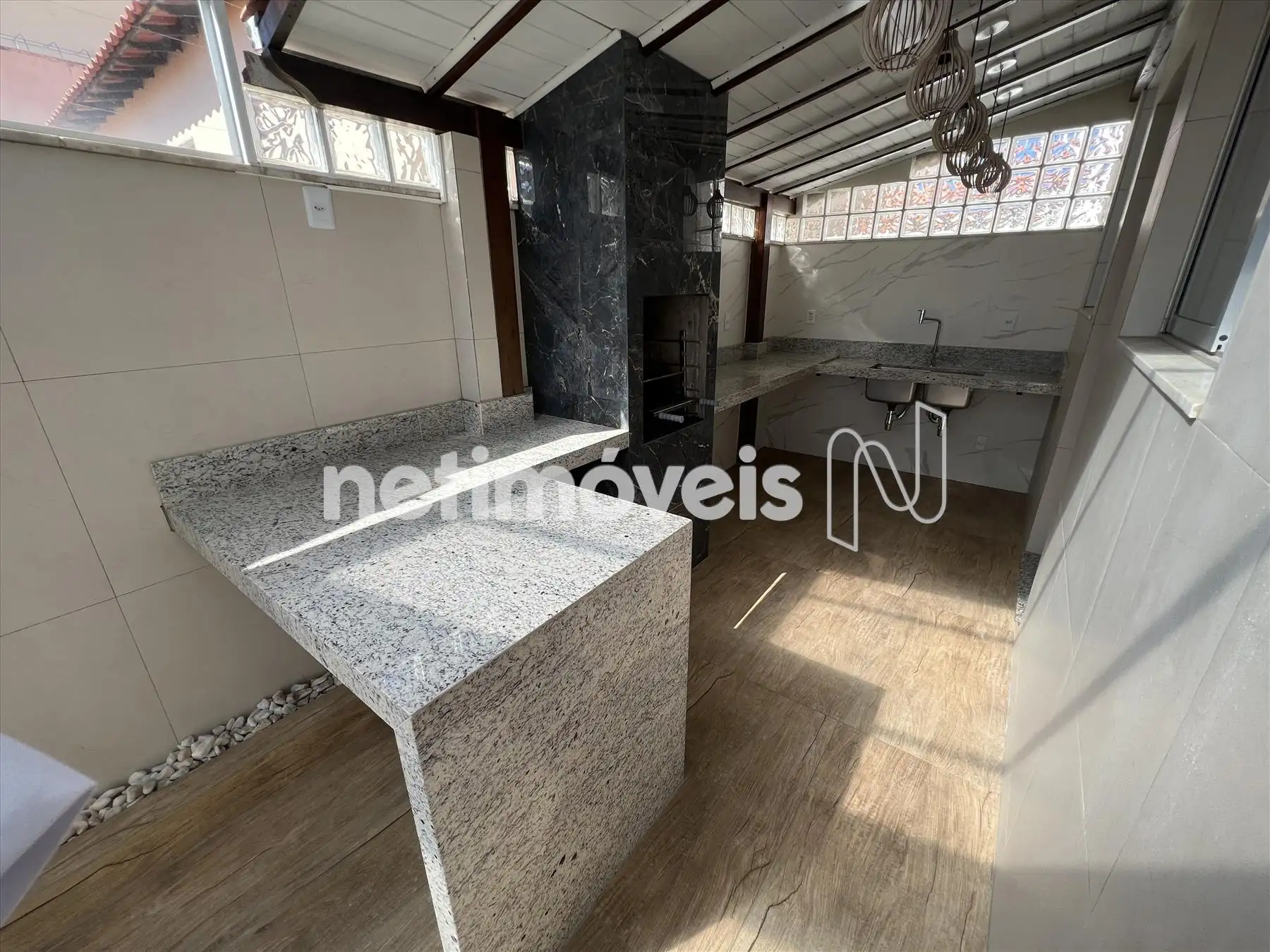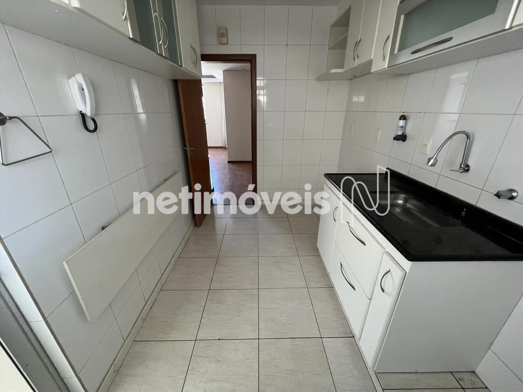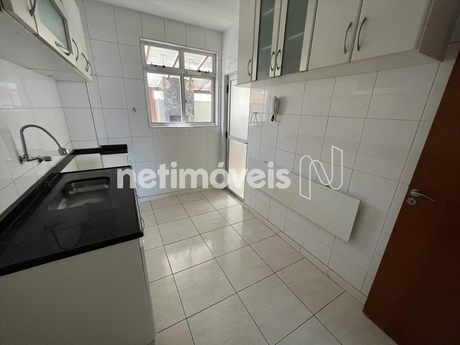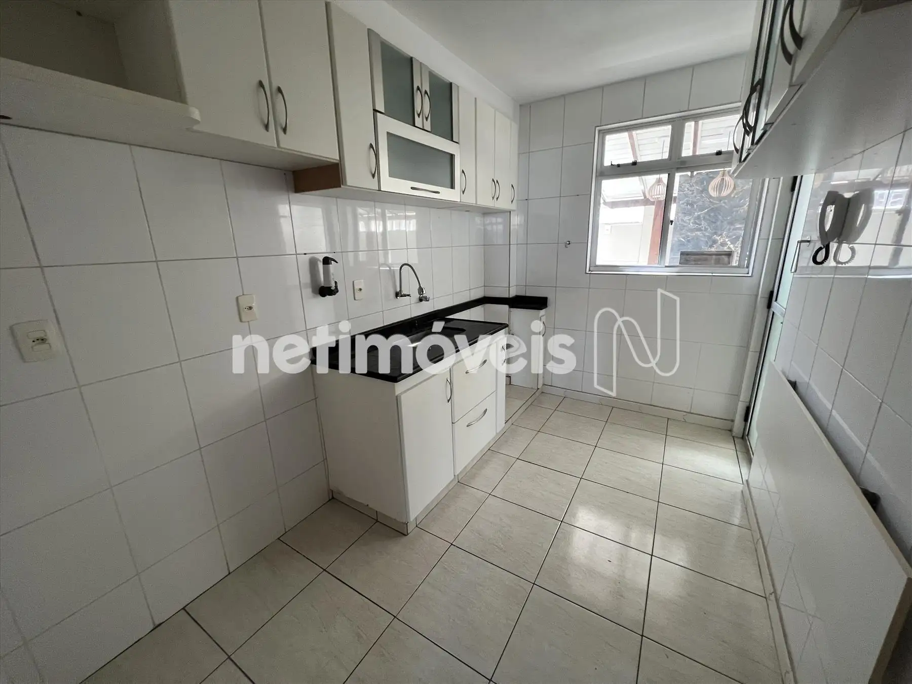 Cozinha ampla com armários, piso em cerâmica e bancada em granito.