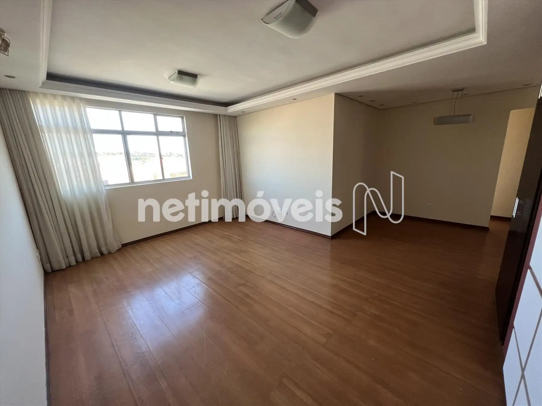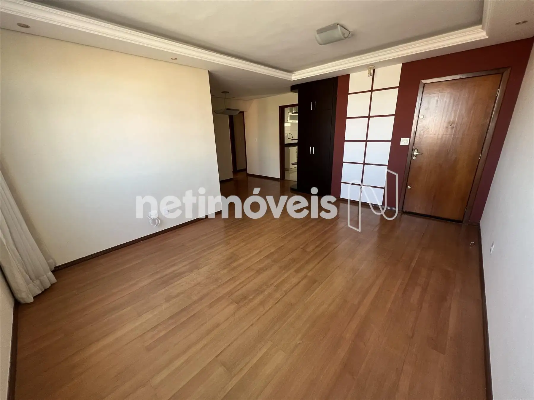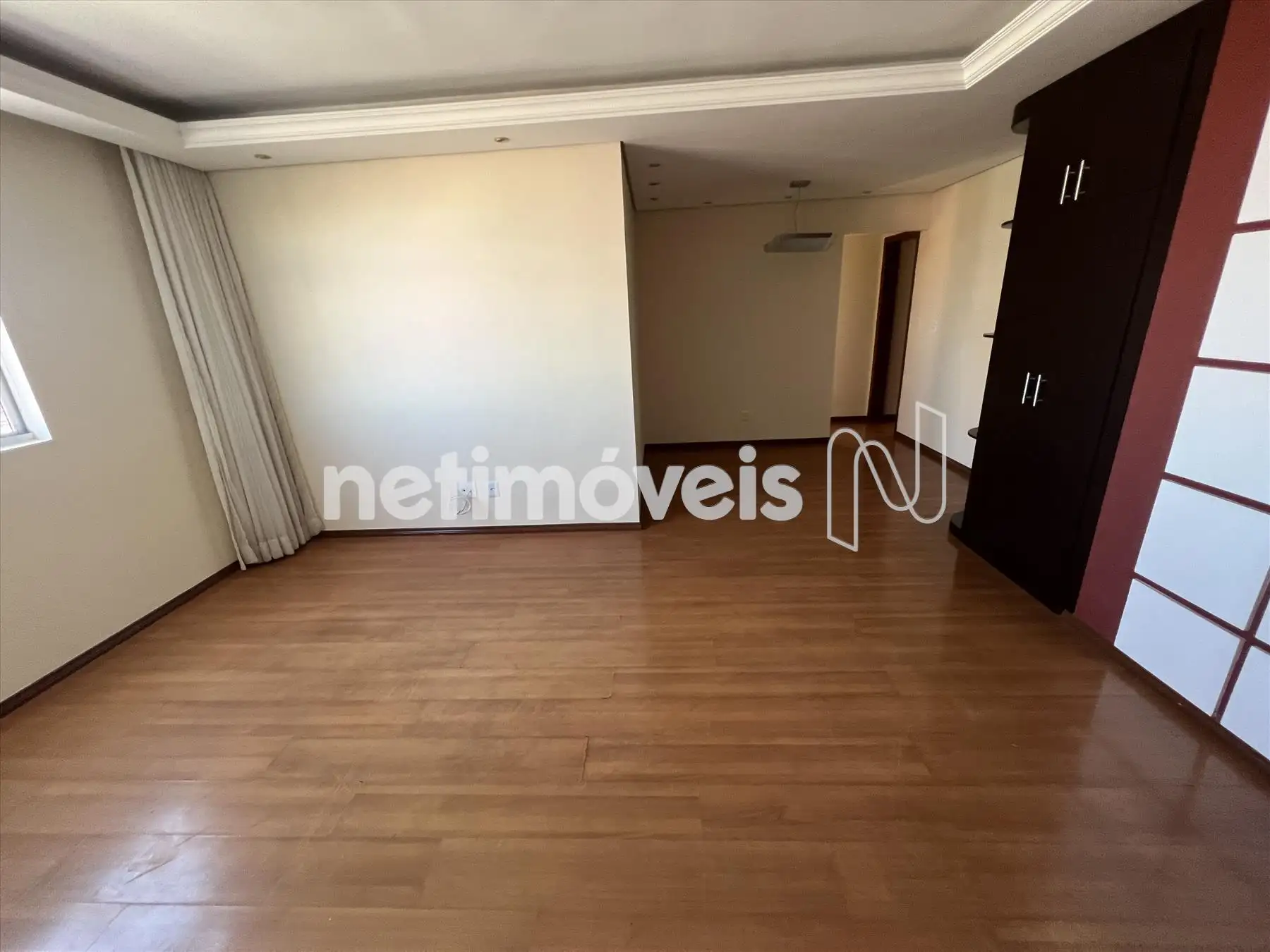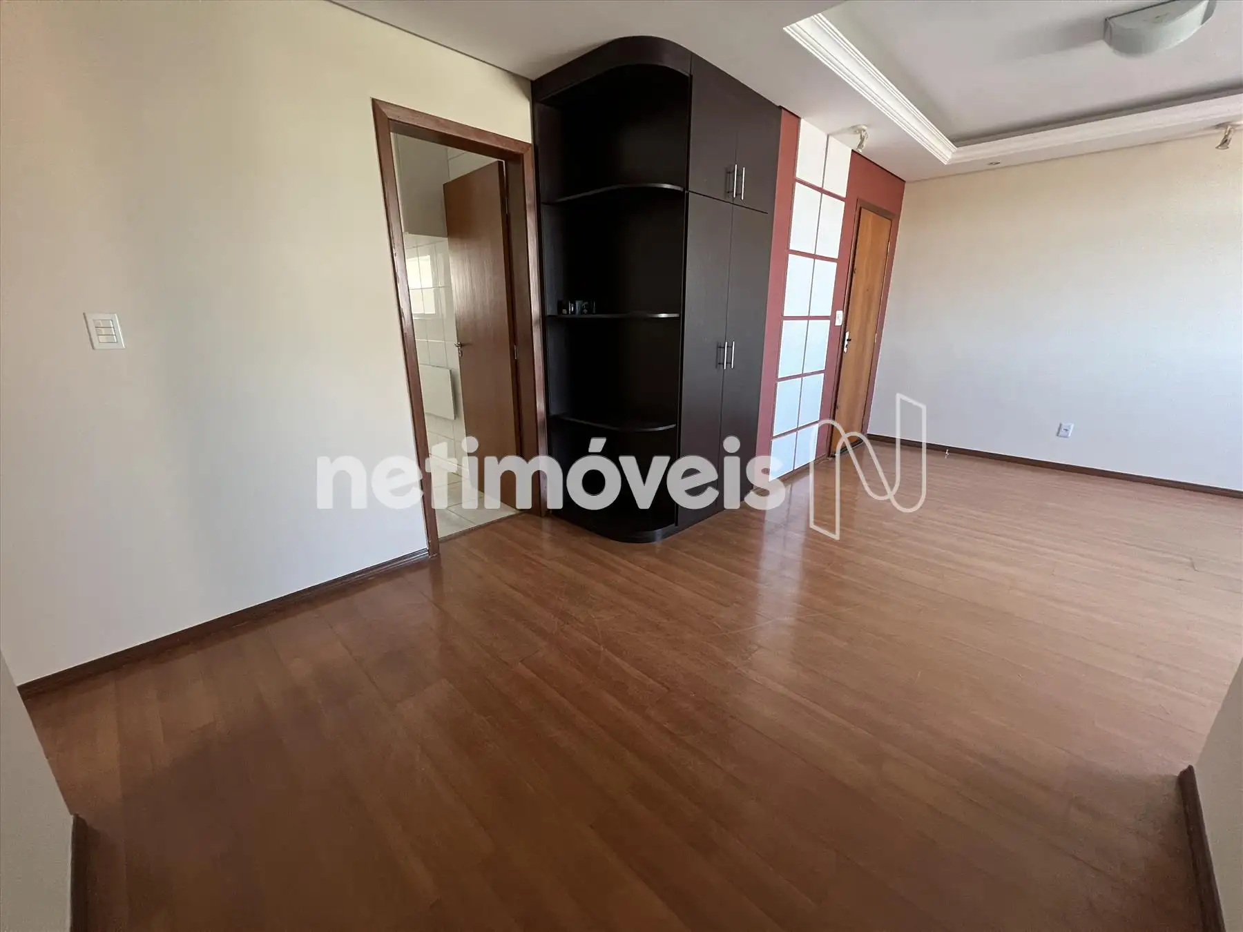 Sala ampla e arejada para 02 ambientes com piso em laminado, armário, rebaixamento em gesso e iluminação indireta.